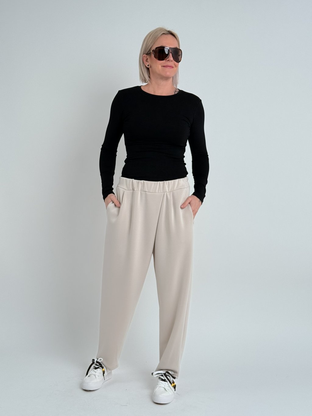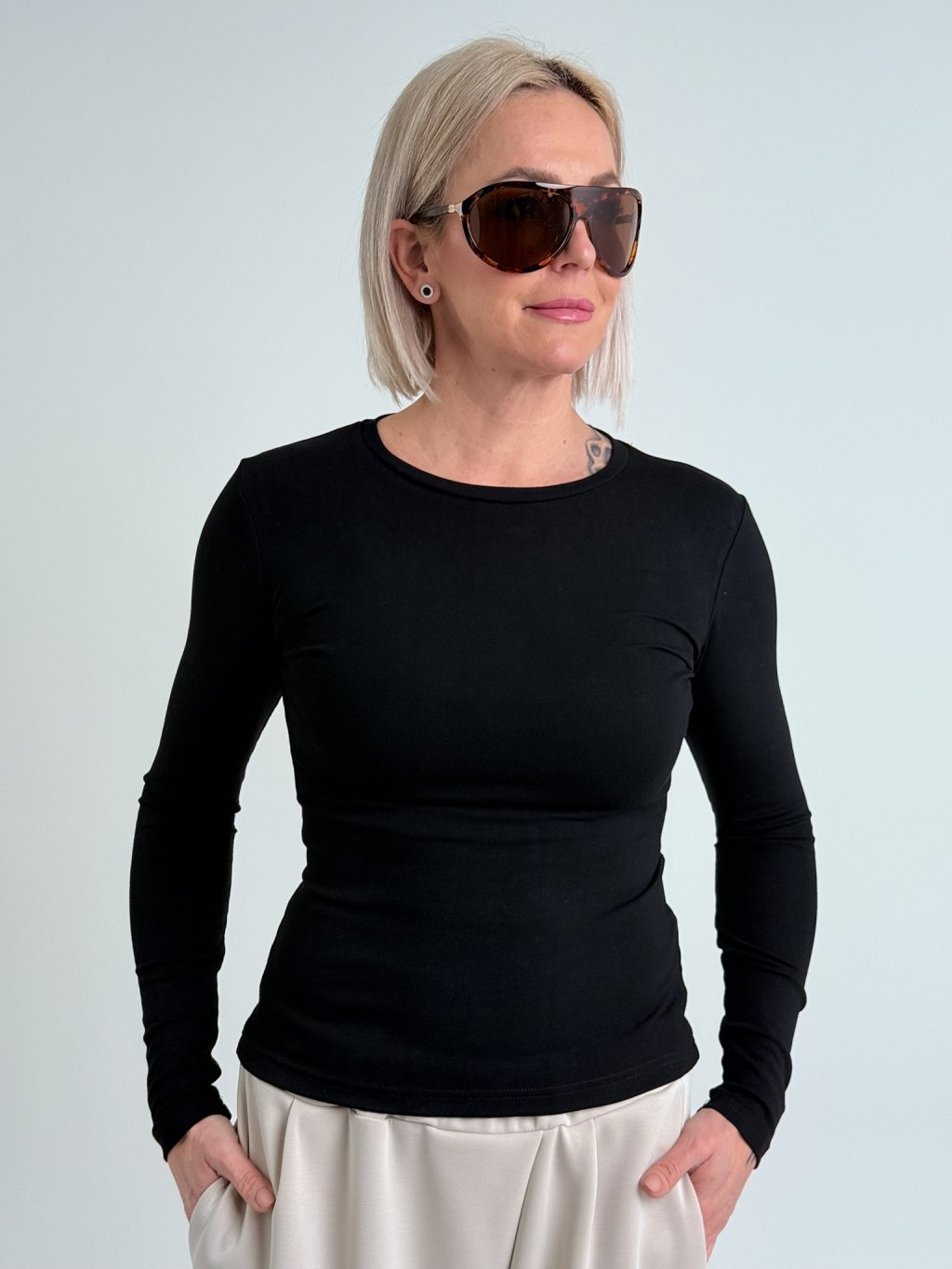 Jednoduché, pružné triko s dlouhým rukávem a lodičkovým výstřihem.