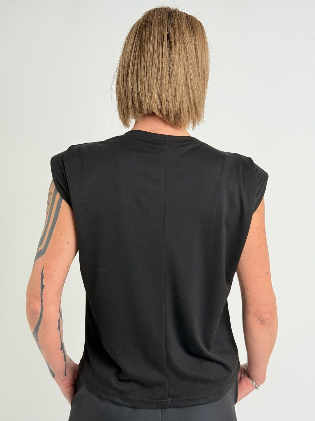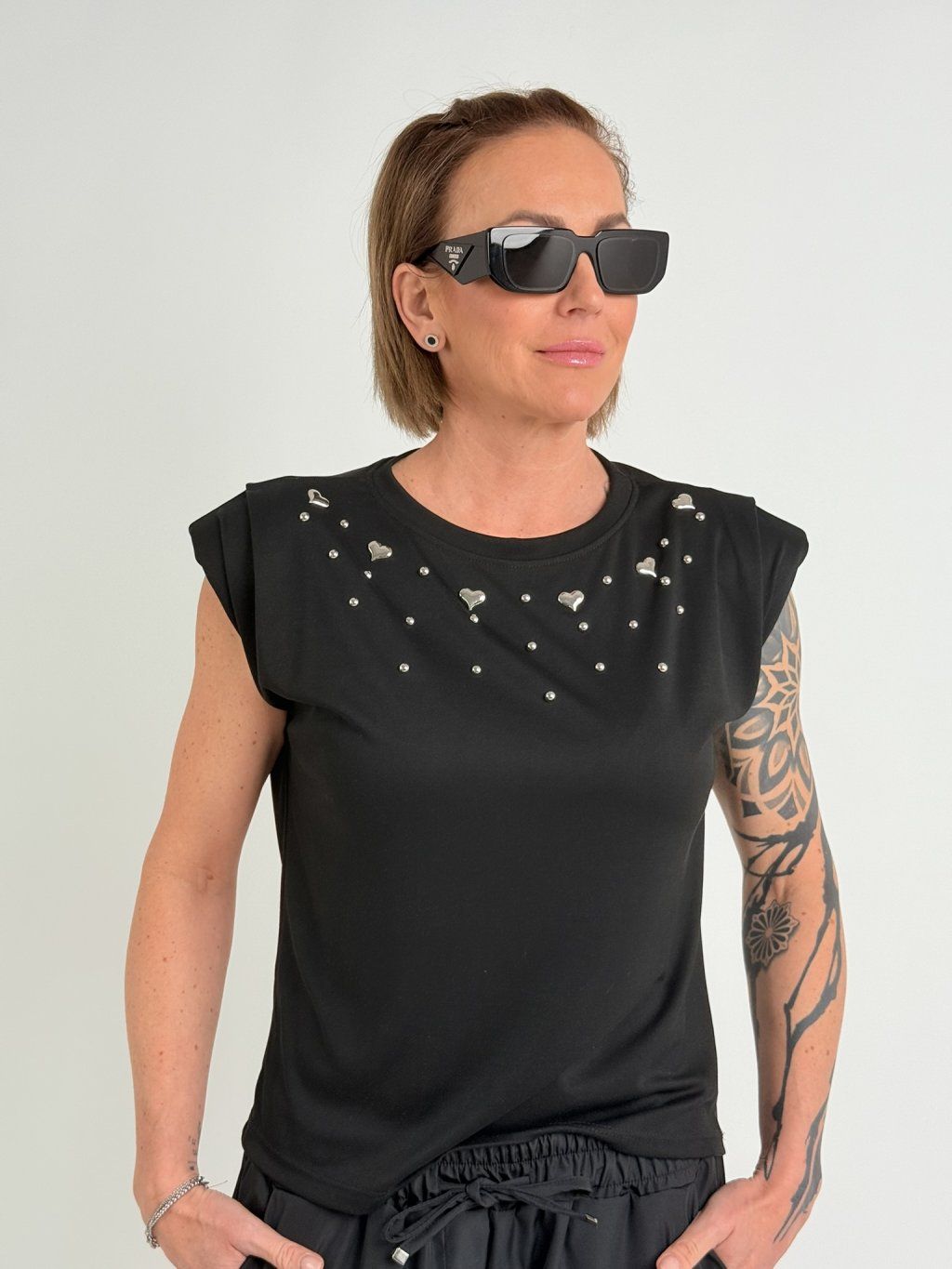 Hodně pružné tričko se spadlým rukávem s manžetou, vycpávkami a kovovými srdíčky na předním dílu.