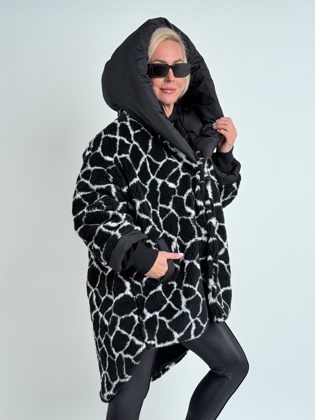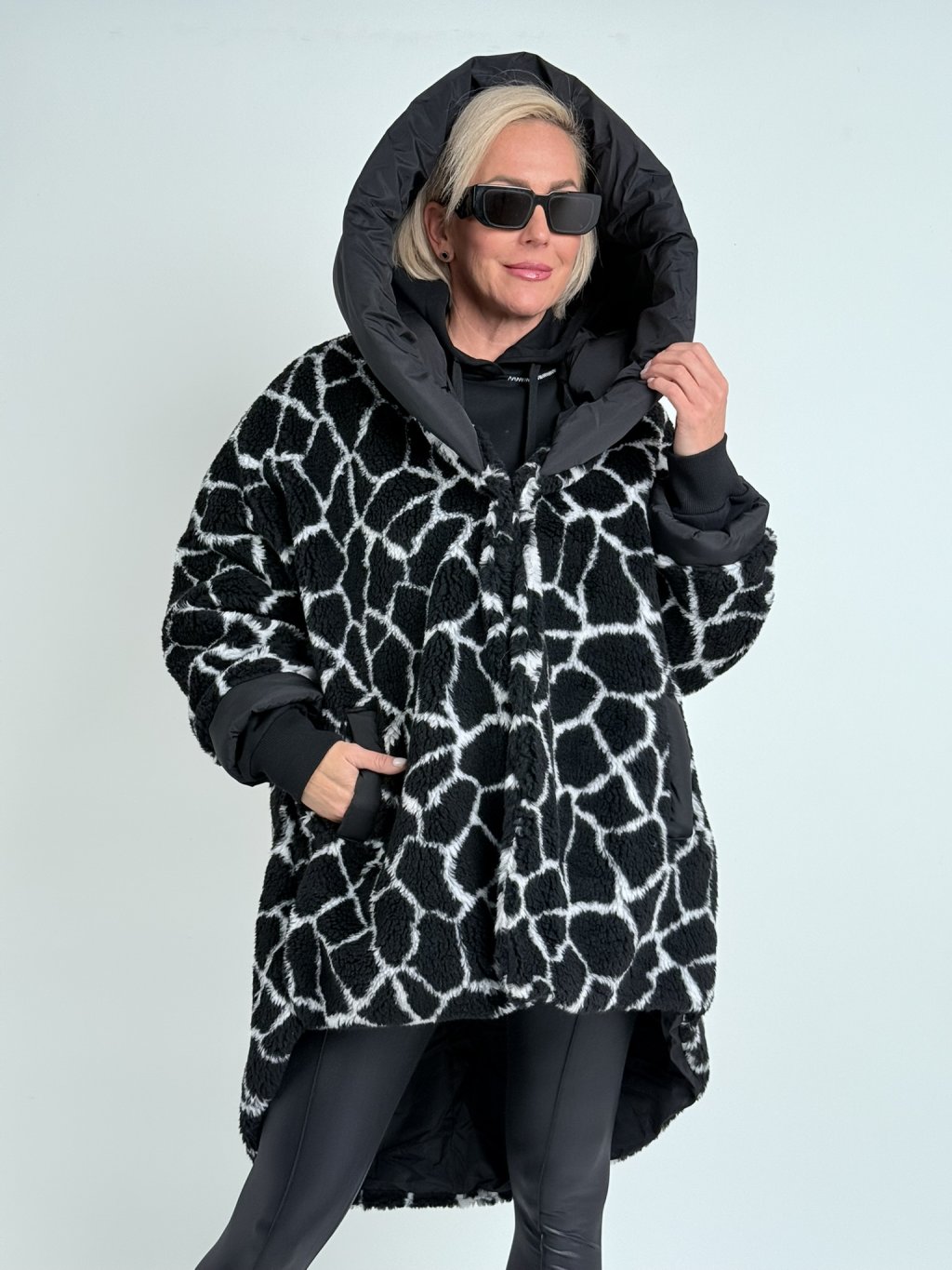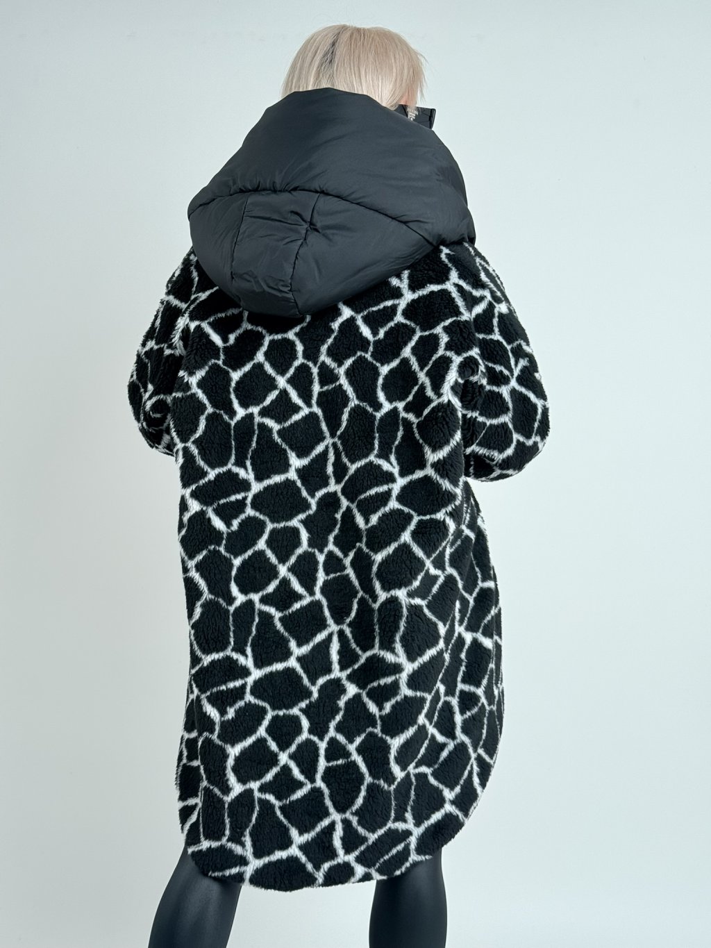Super, oversize, plyšová  bunda, s prošívanou podšívkou, se zapínáním na háčky, velkou kapucí, kratším předním a prodlouženým zadním dílem.