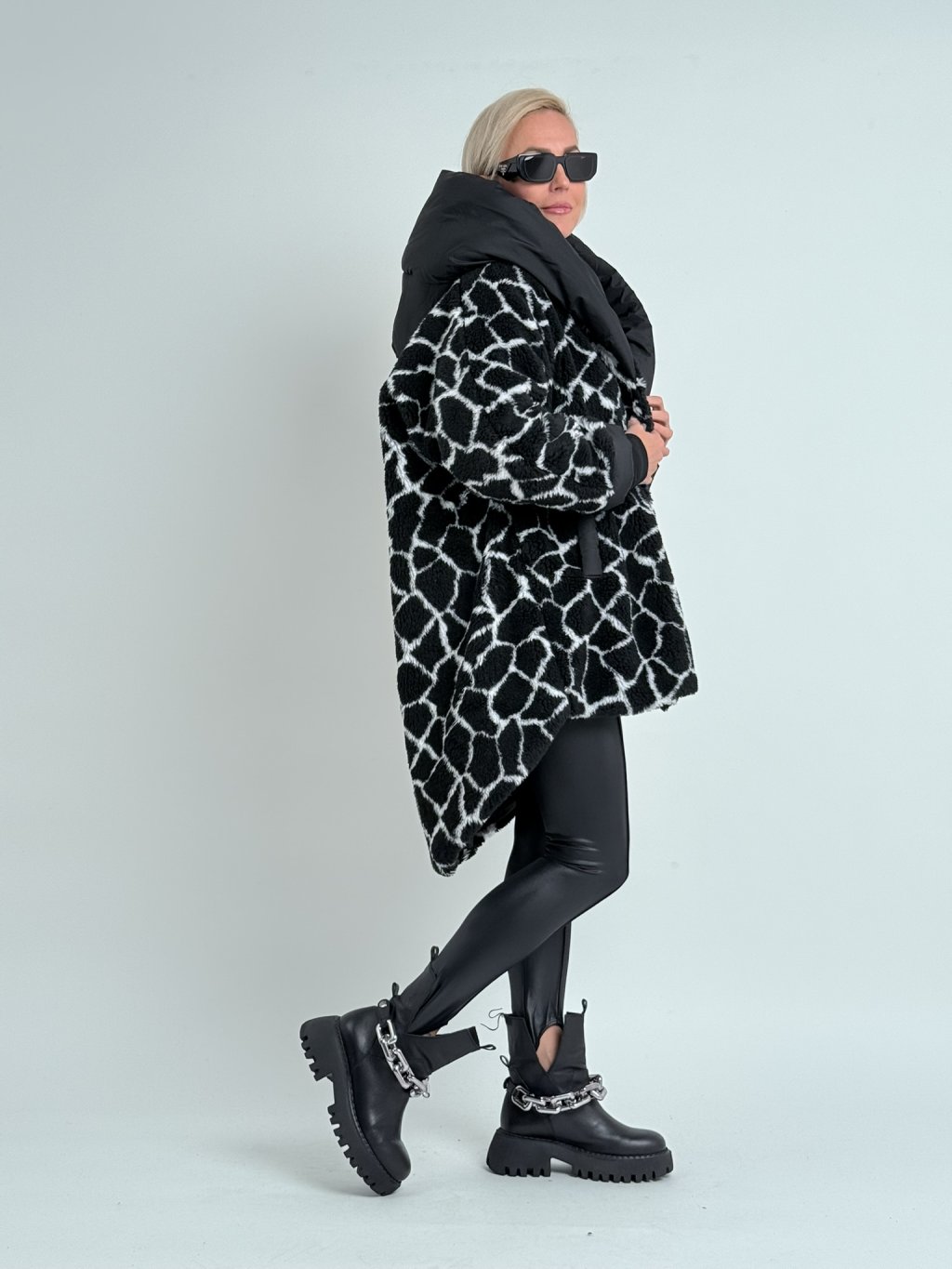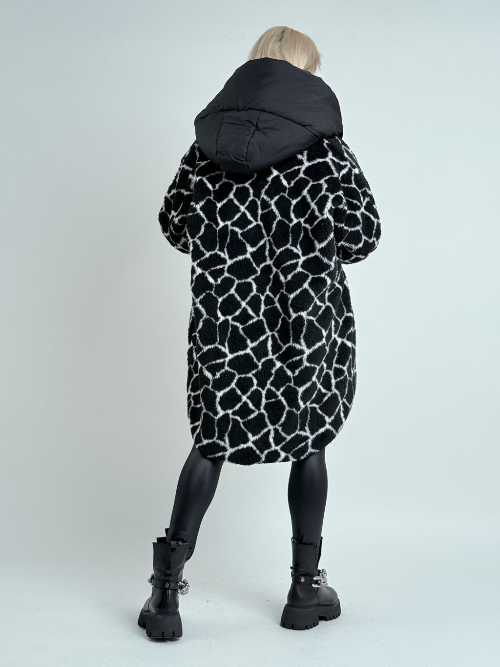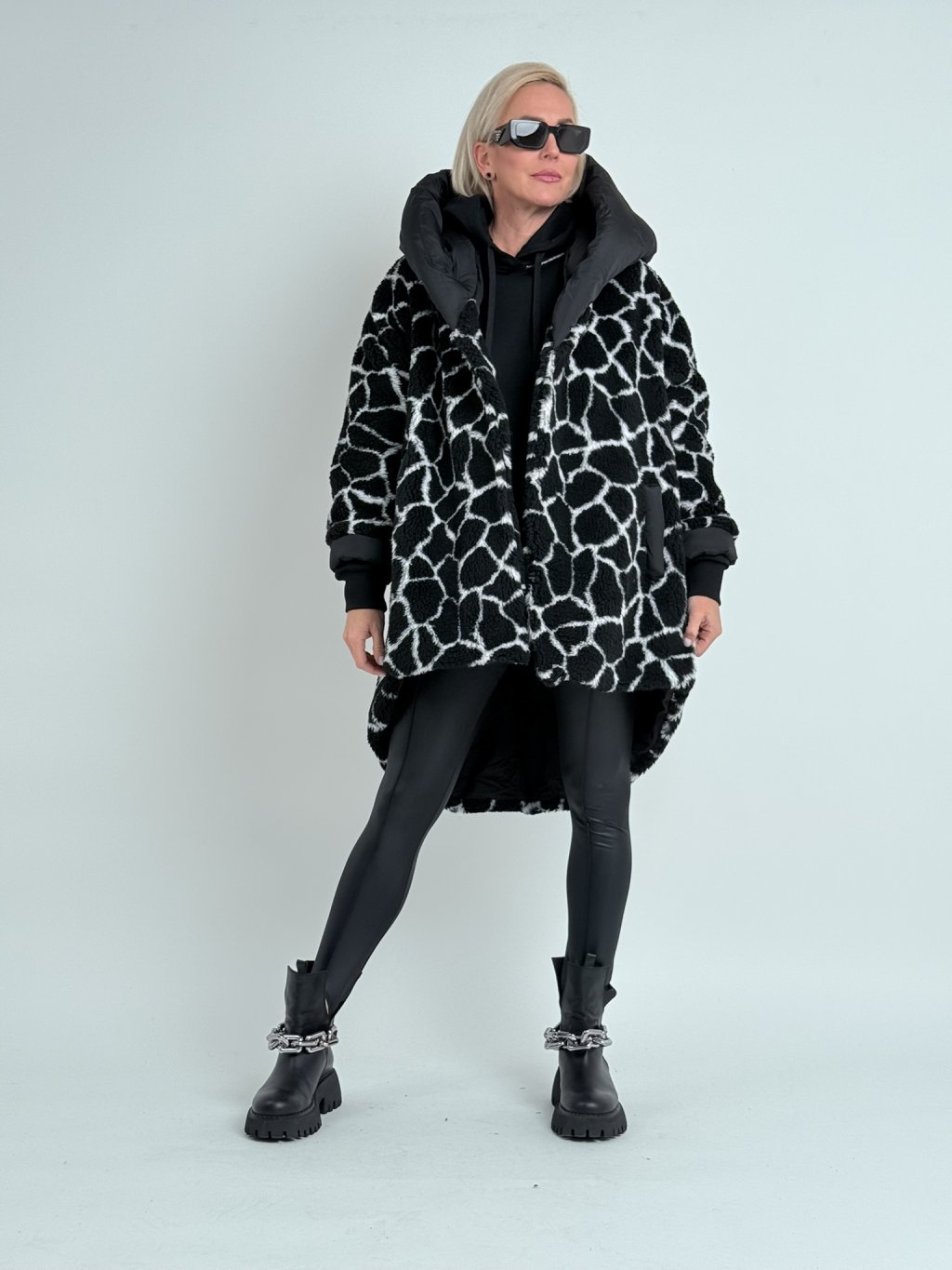 Super, oversize, plyšová  bunda, s prošívanou podšívkou, se zapínáním na háčky, velkou kapucí, kratším předním a prodlouženým zadním dílem.