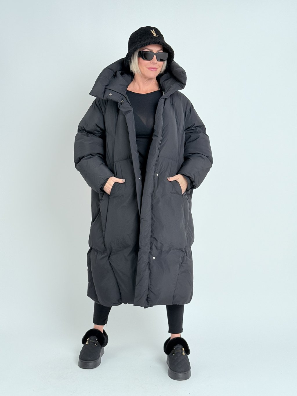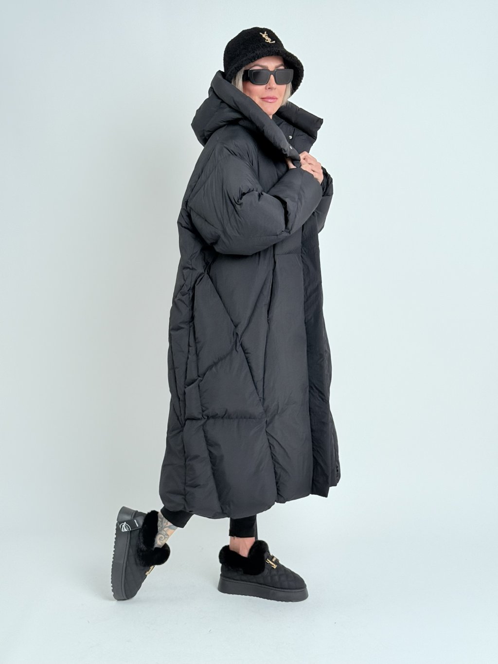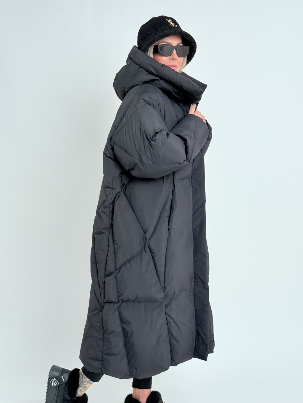 Dokonalý, oversize, prošívaný, zimní kabát se zapínáním na zip a patenty, kapucí a kapsami se zapínáním na zip..