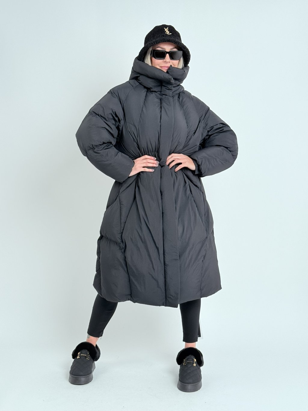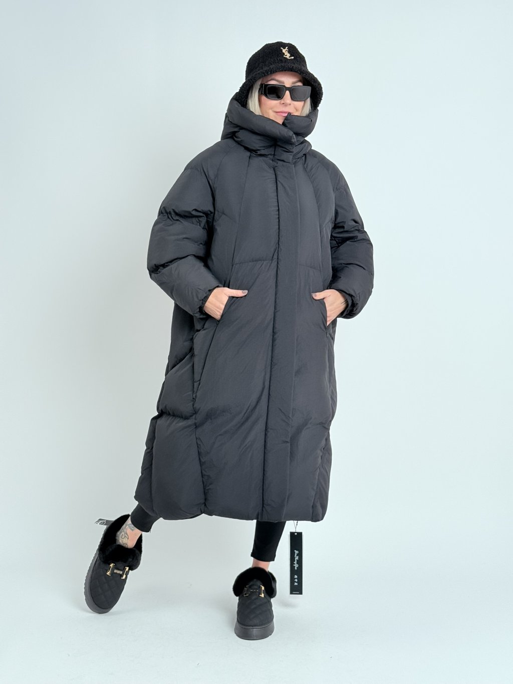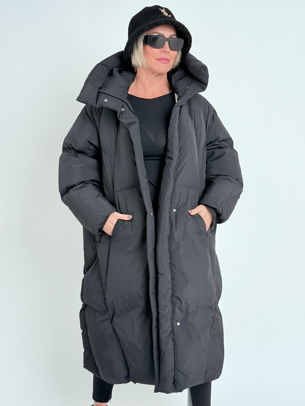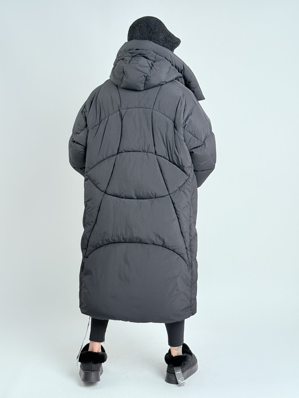 Dokonalý, oversize, prošívaný, zimní kabát se zapínáním na zip a patenty, kapucí a kapsami se zapínáním na zip..