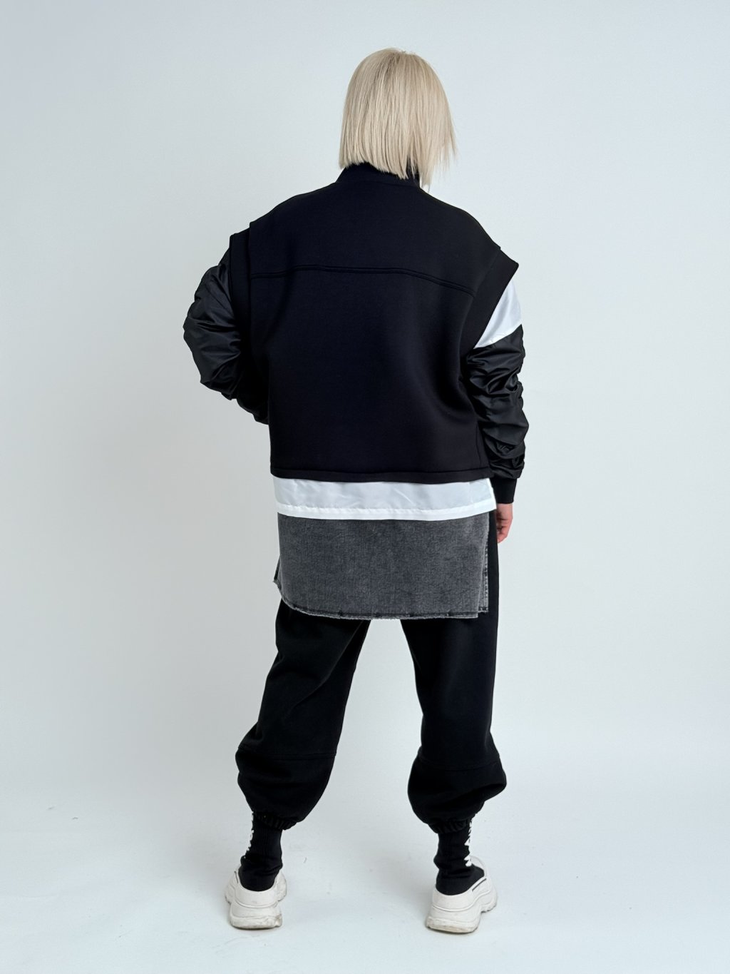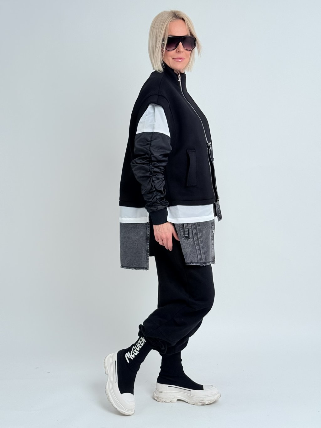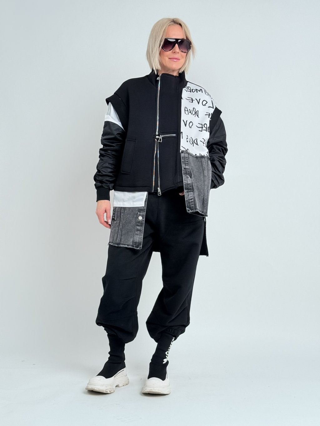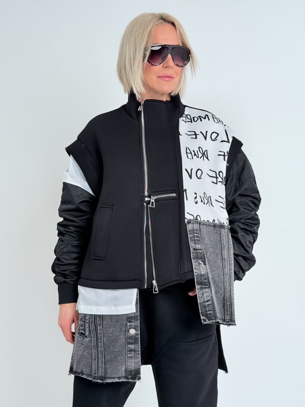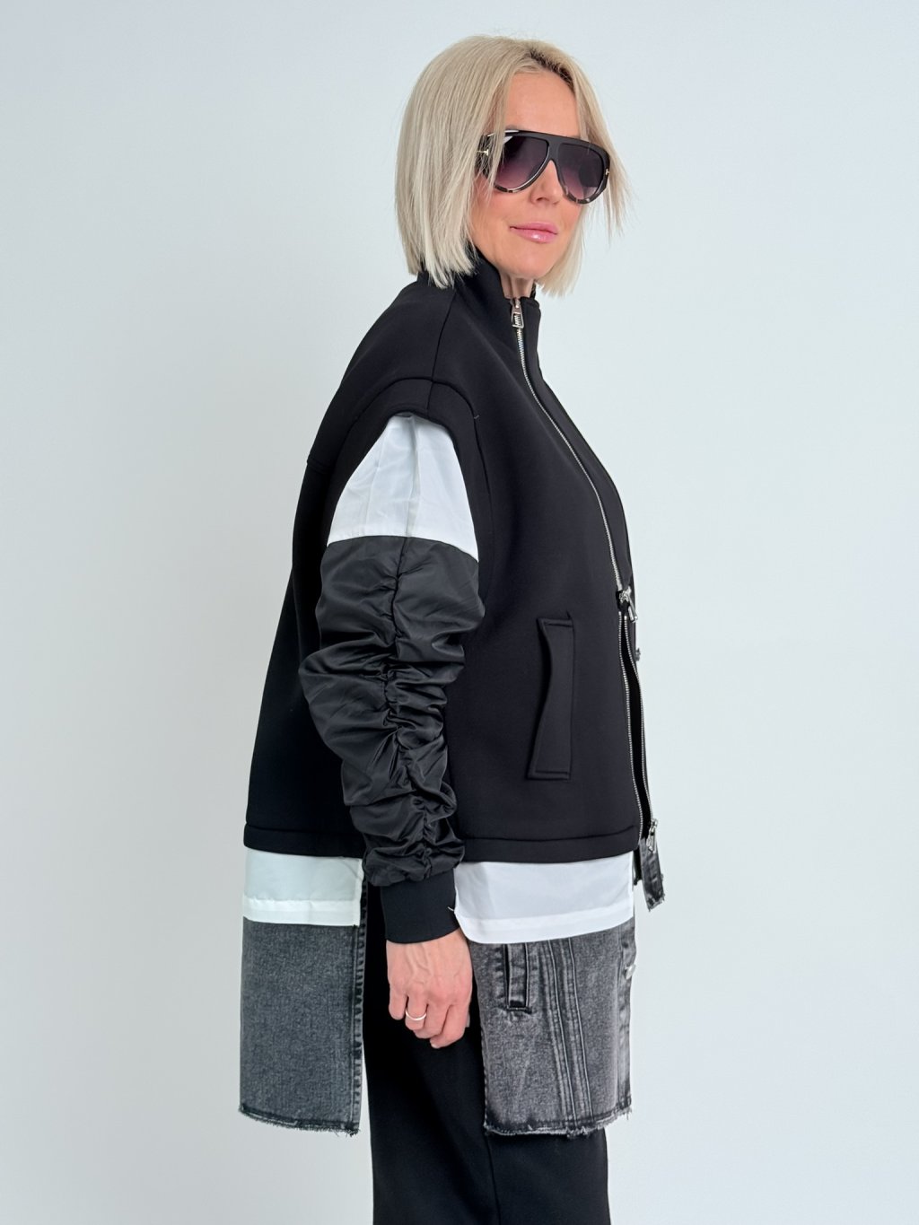 Super kardigan v kombinaci několika materiálů, šusťákovými, nabranými rukávy a se zapínáním na několik zipů.