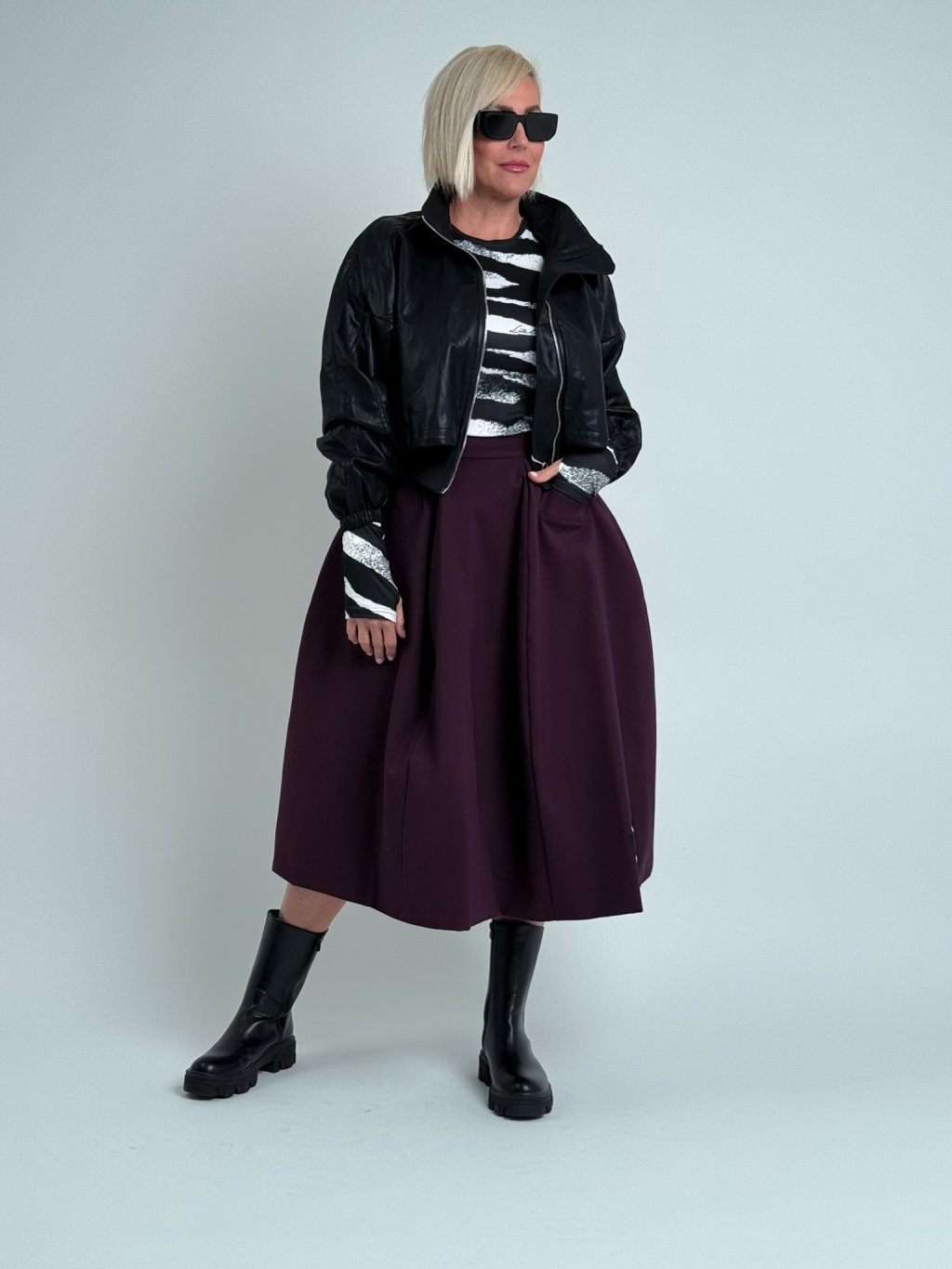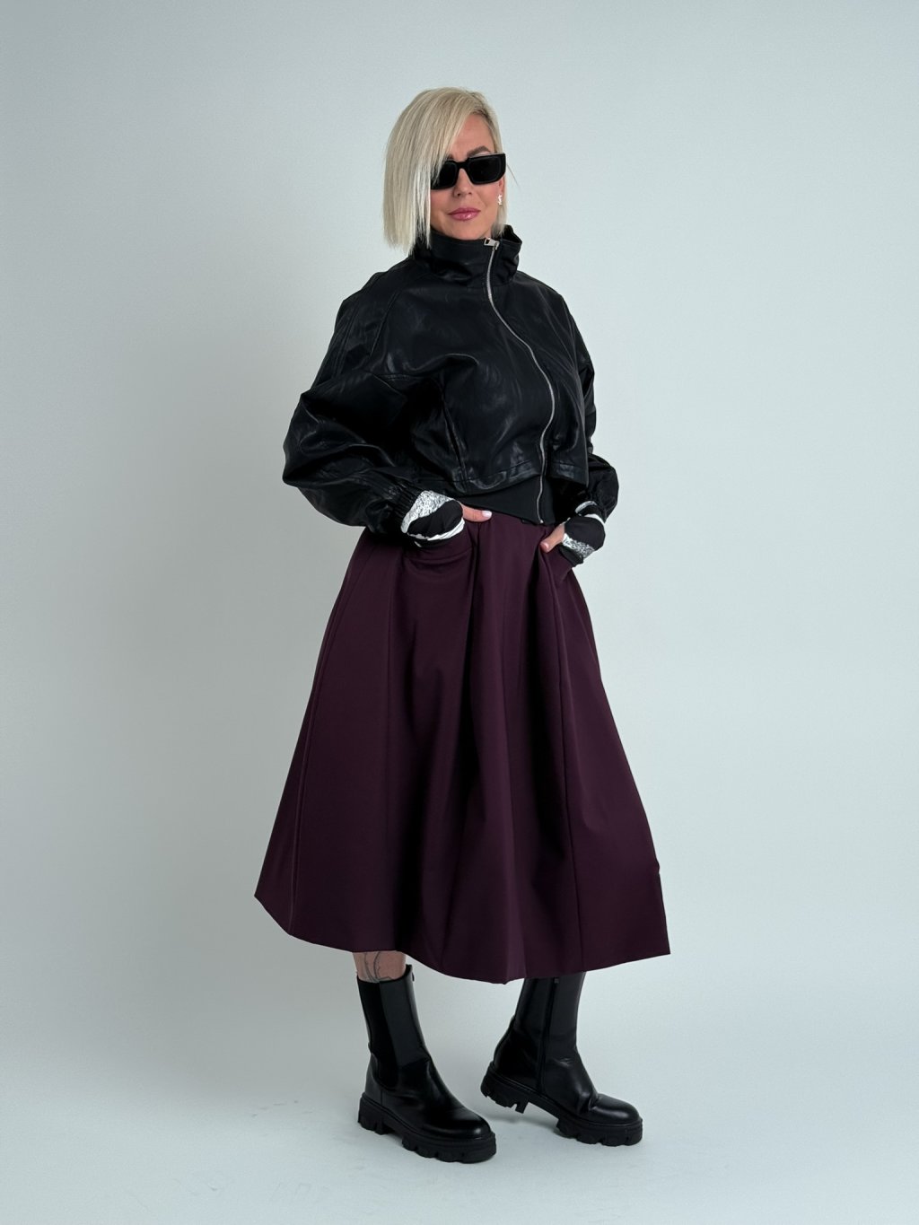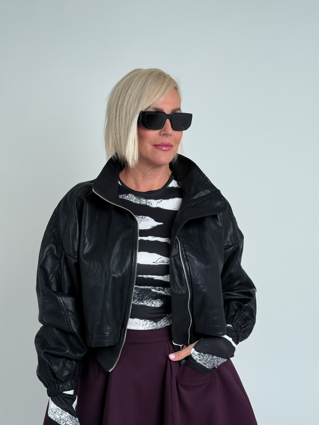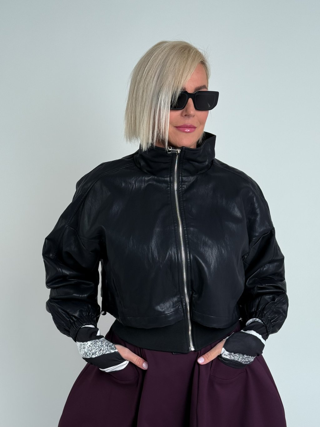 Skvělý, kratší, koženkový bomber s nápletem v pase, zapínáním na zip, podšívkou, vrchní díl je volnější, s mozností stažení, stejně tak i vysoký stoják. rukávy jsou zakončeny gumou. Super ke kalhotám, i sukni.