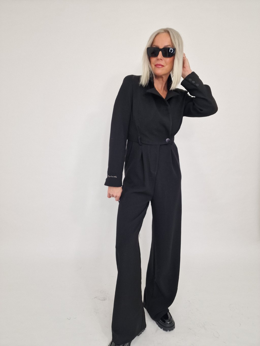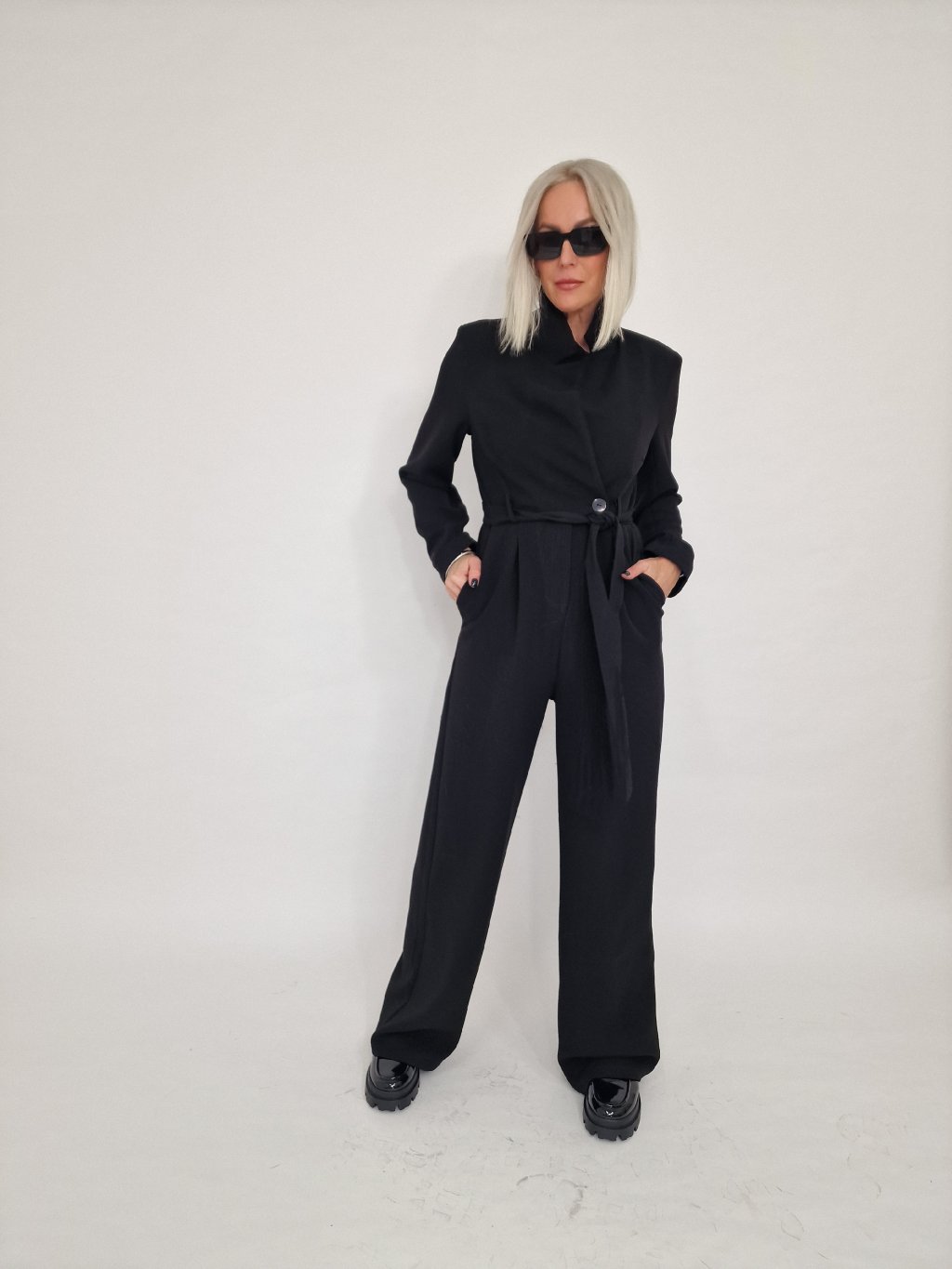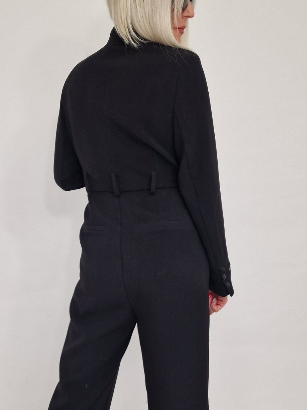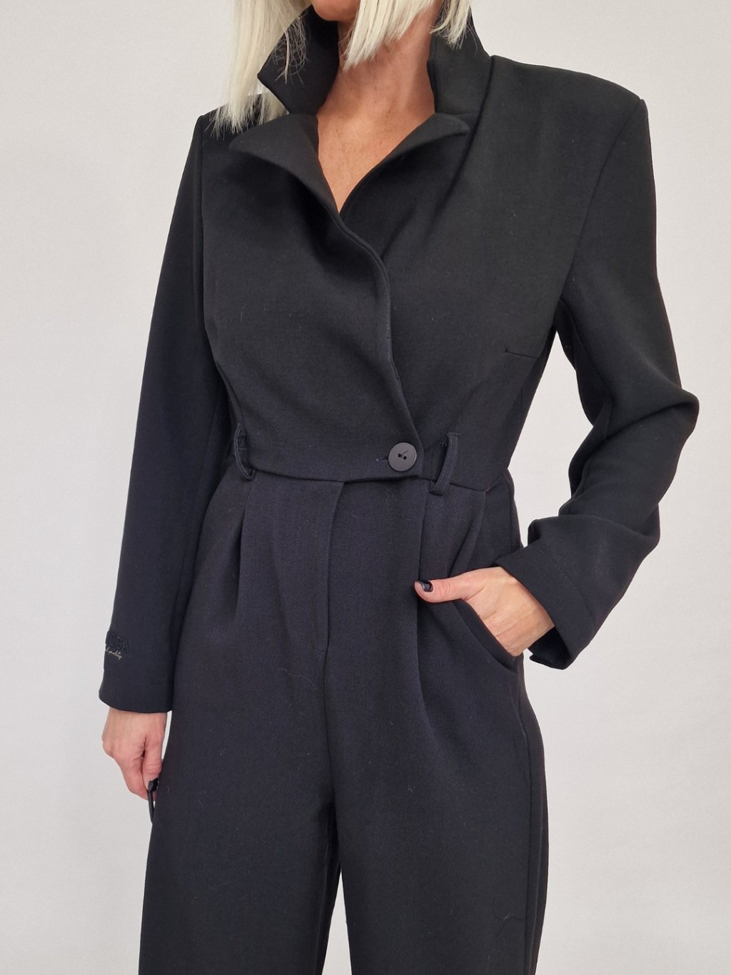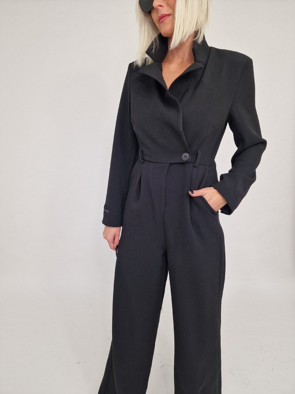 Nádherný overal s širokými nohavicemi a vrchním dílu ve vzhledu saka, se zapínáním na knoflíky, s vycpávkami a podšívkou.