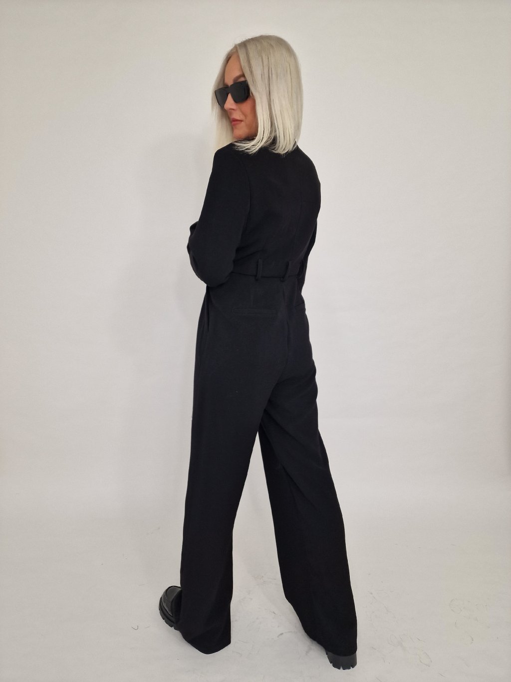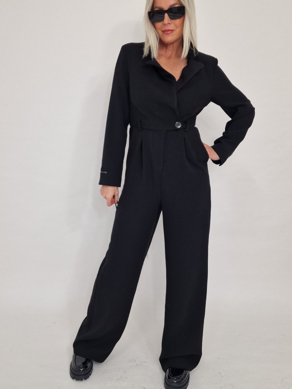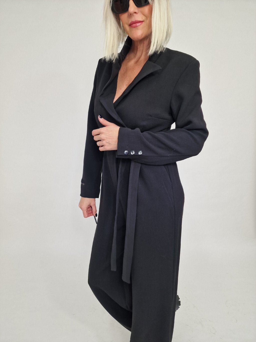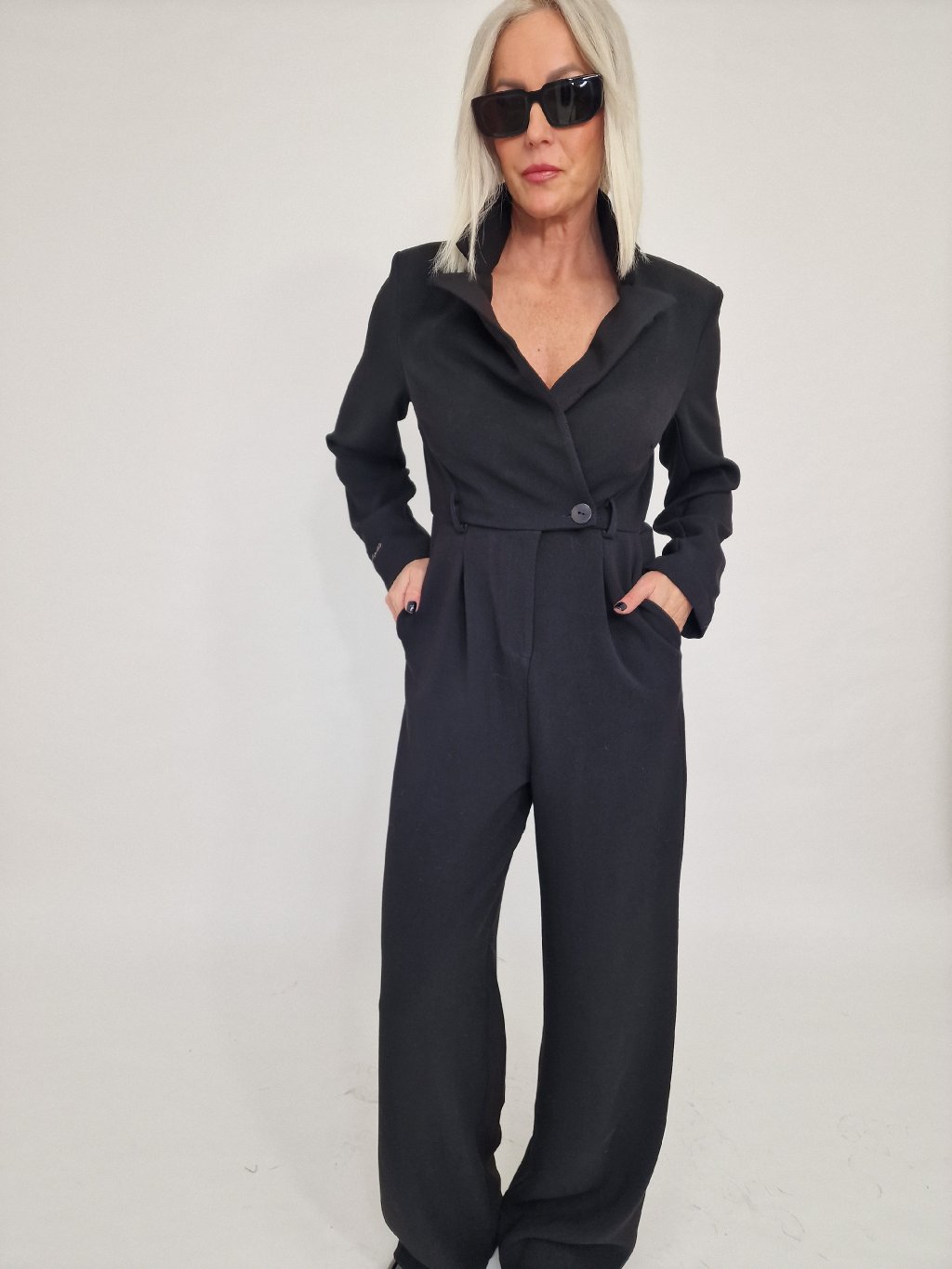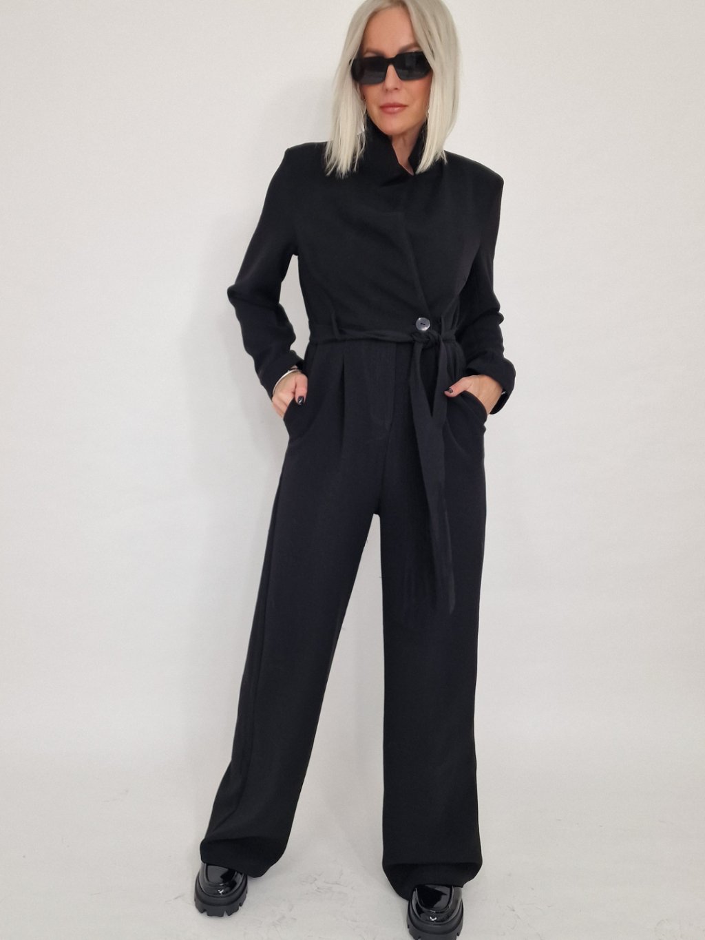 Nádherný overal s širokými nohavicemi a vrchním dílu ve vzhledu saka, se zapínáním na knoflíky, s vycpávkami a podšívkou.