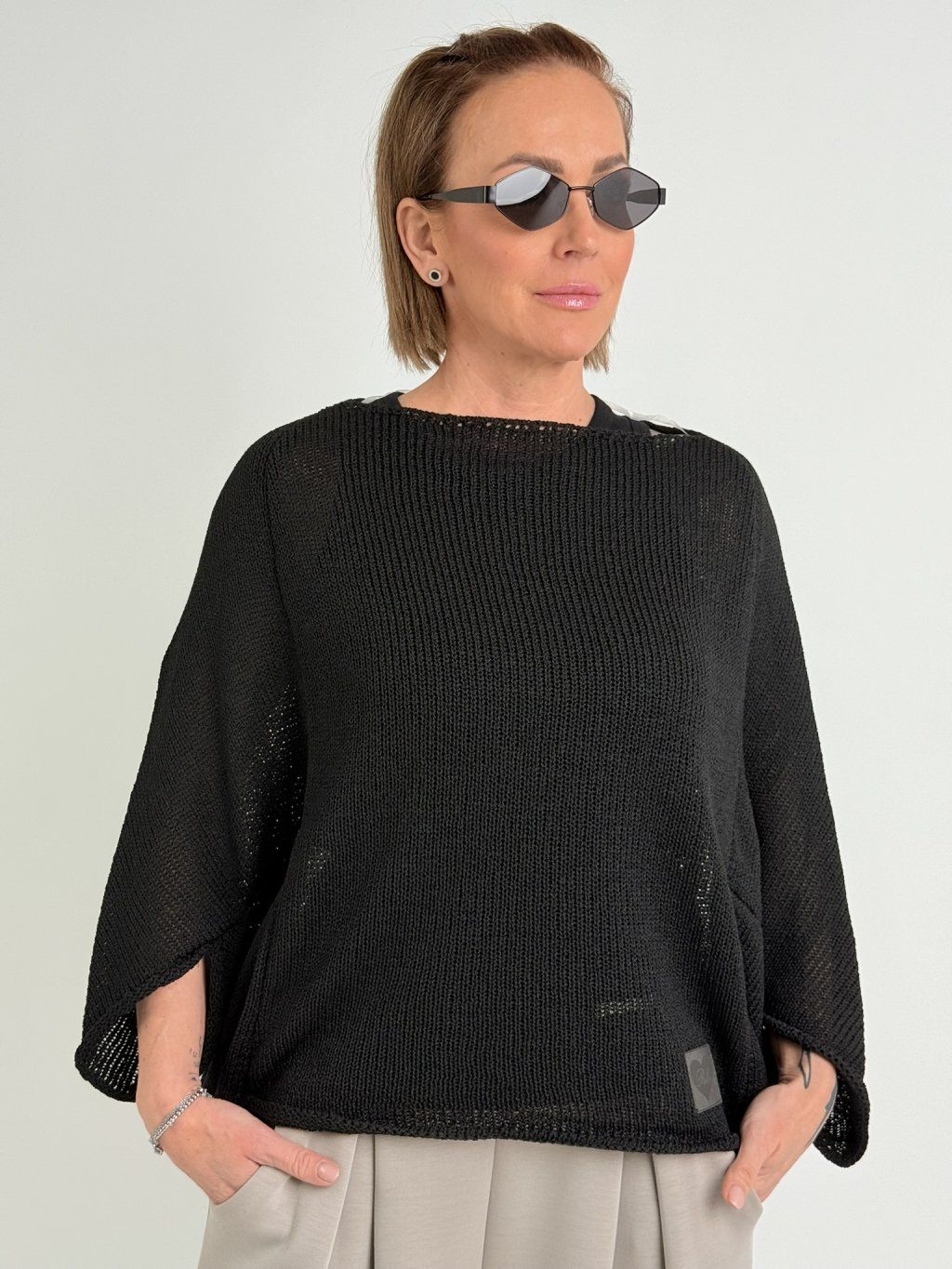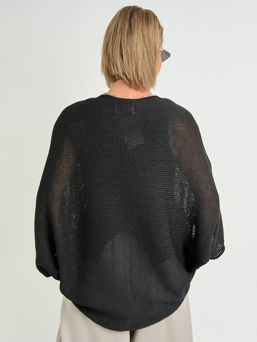 Krásný, lehký, přízový svetr s lodičkovým výstřihem. v netopýřím střihu, s delším zadním dílem. Jemný a nekousavý.