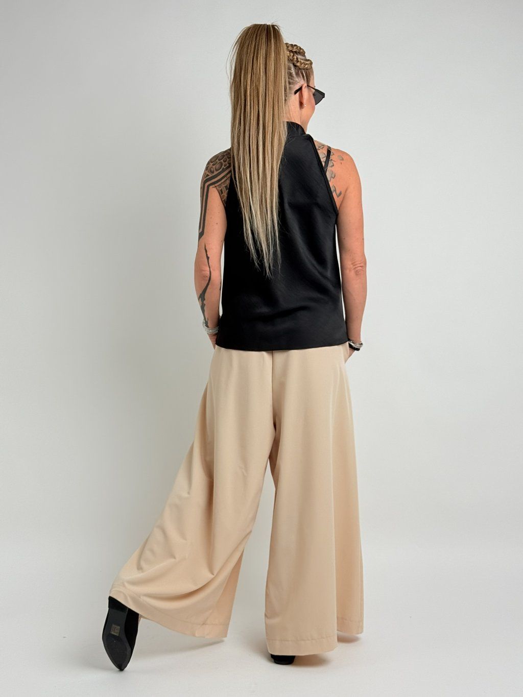Luxusní, saténový top bez rukávů, v asymetrickém střihu, u krku s vodou.