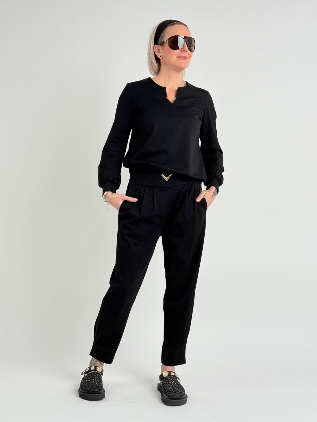 Luxusní top s dlouhým rukávem zakončeným manžetou, se zlatou tkanicí, kterou se dá regulovat spodní šířka topu a menším výstřihem, který zdobí kov ve zlaté barvě .