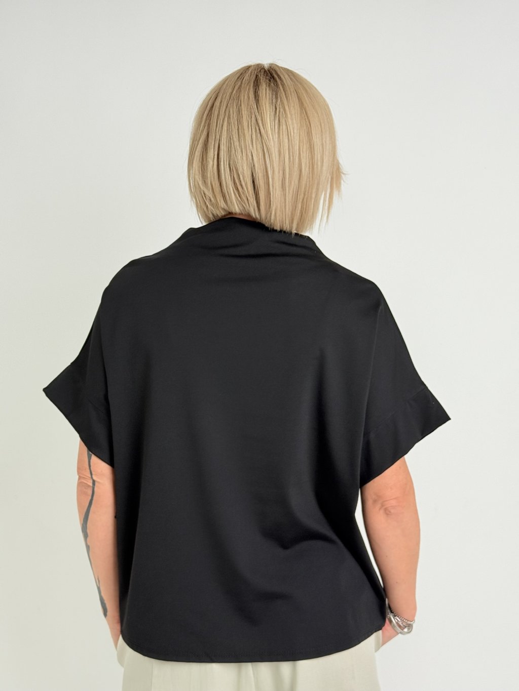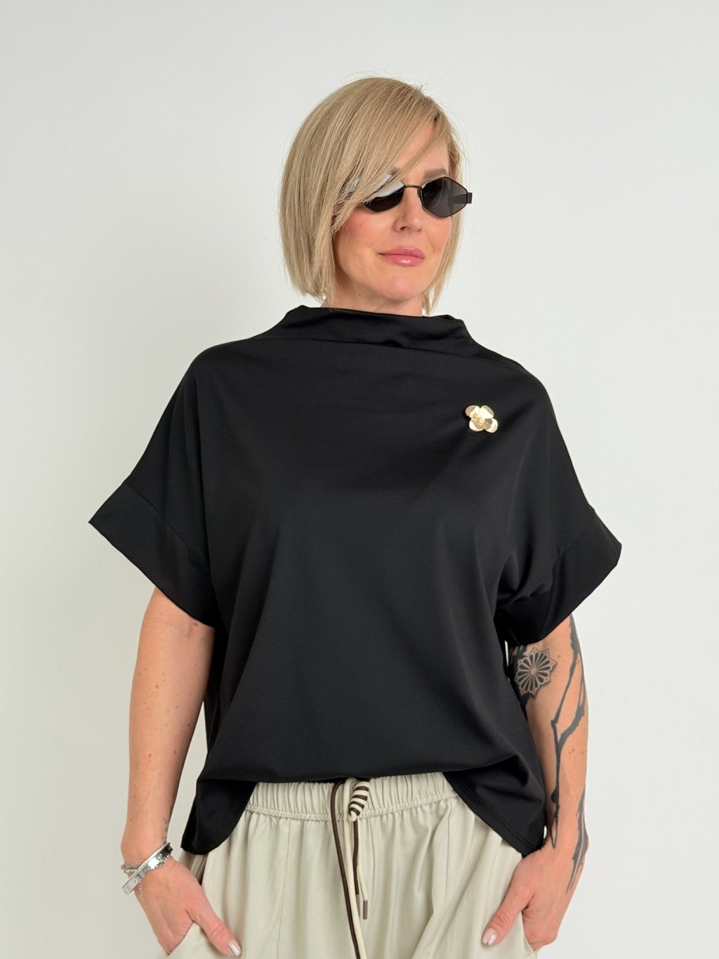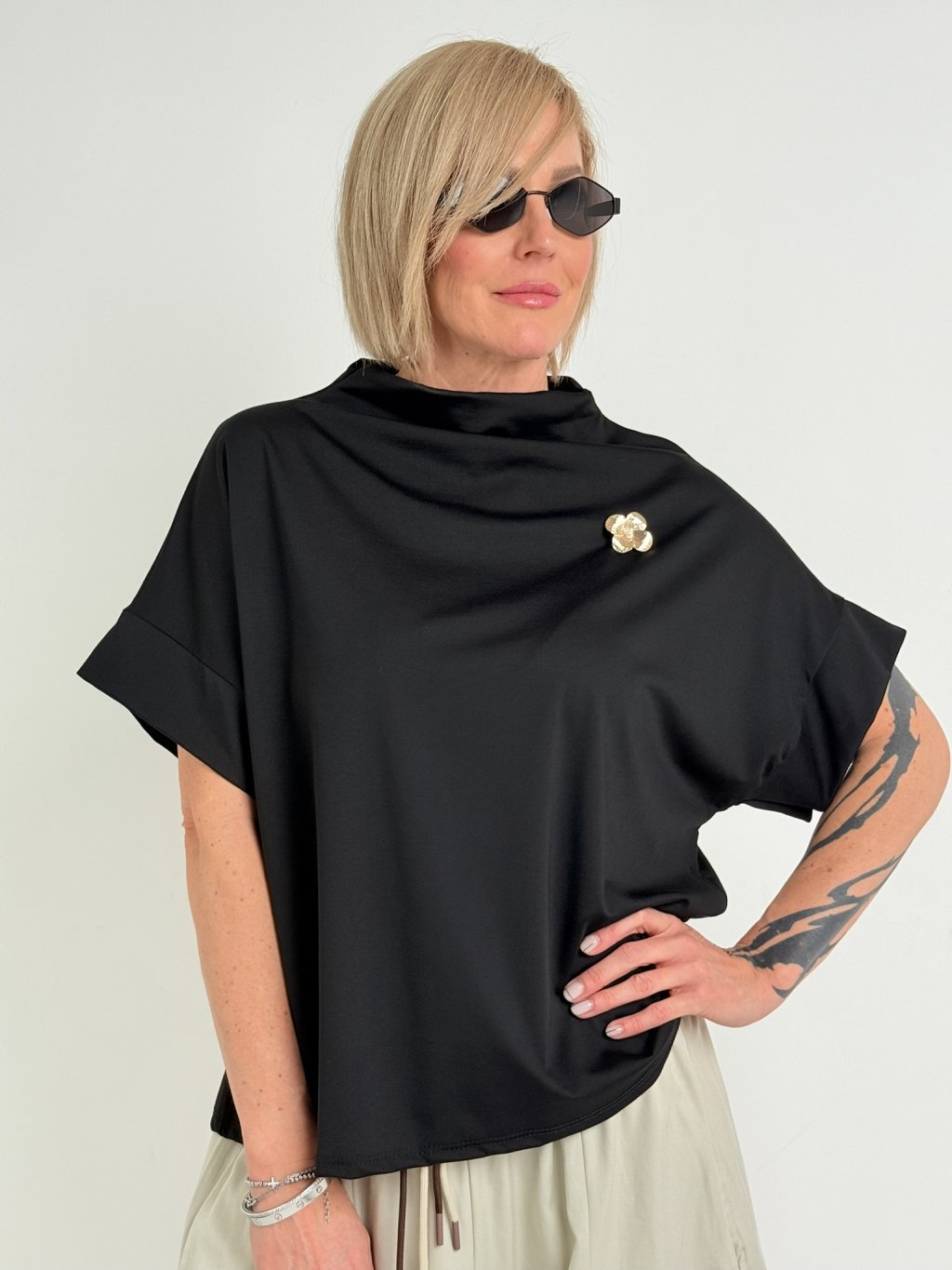 Top v oversize střihu s volnějším , krátkým rukávem, lodičkovým výstřihem a připínací broží ve zlaté barvě.