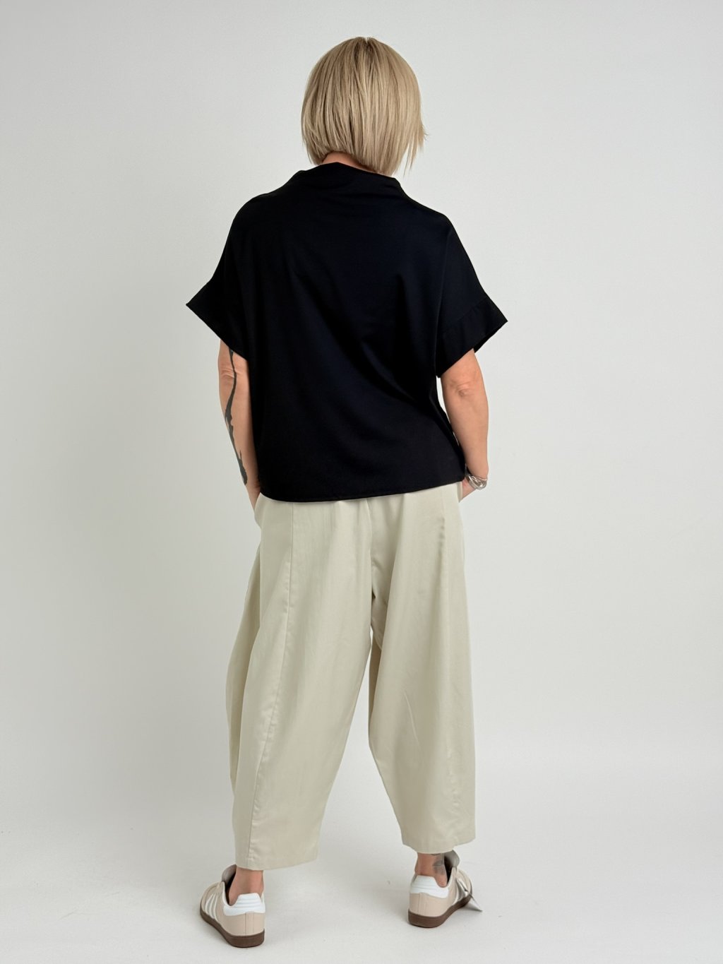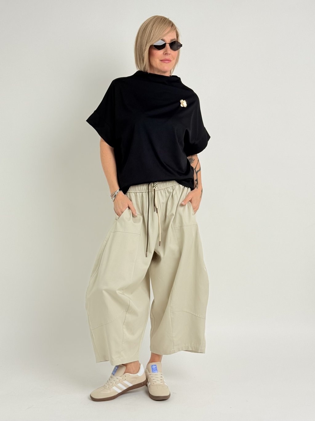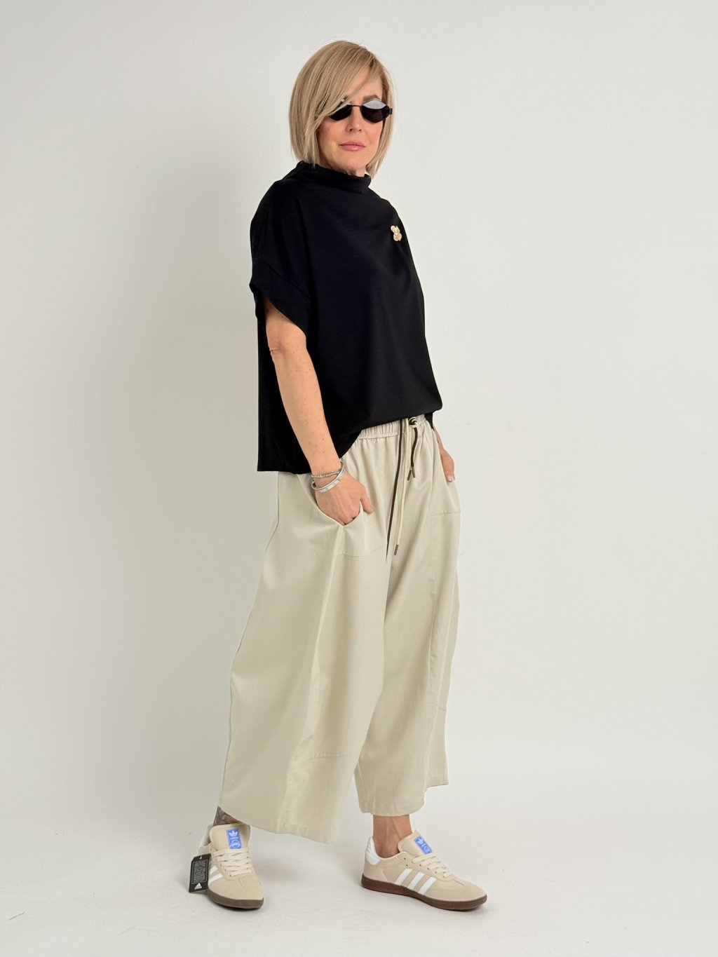 Top v oversize střihu s volnějším , krátkým rukávem, lodičkovým výstřihem a připínací broží ve zlaté barvě.