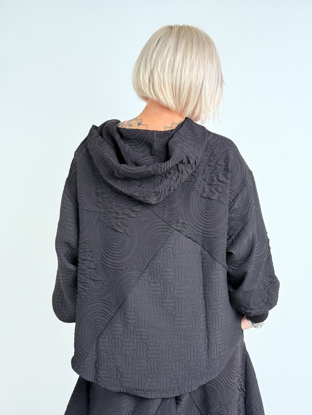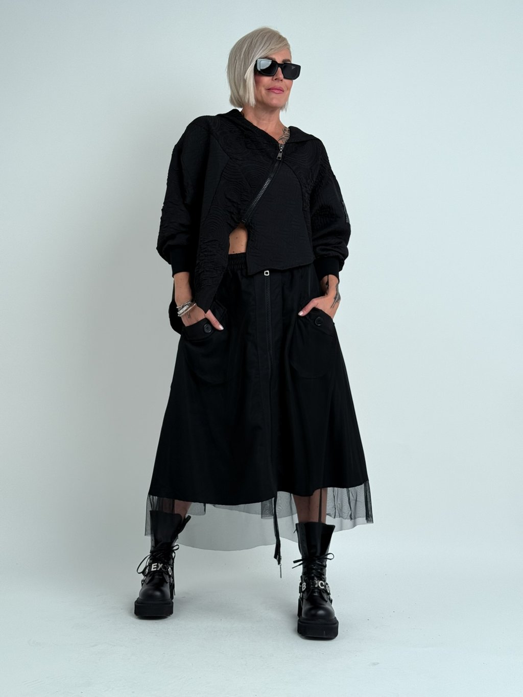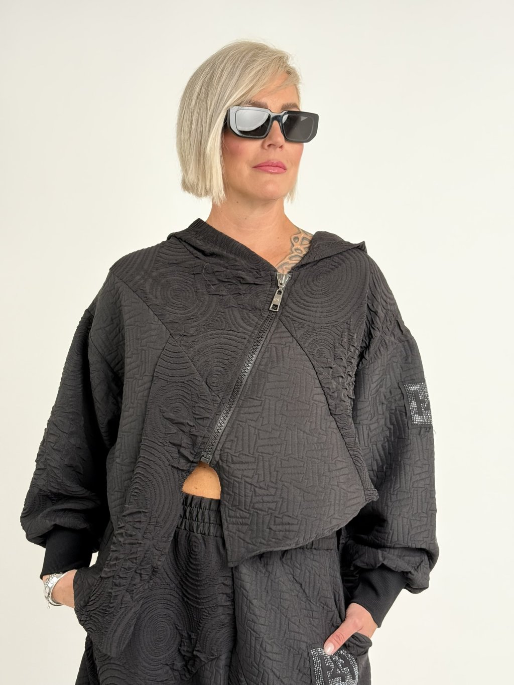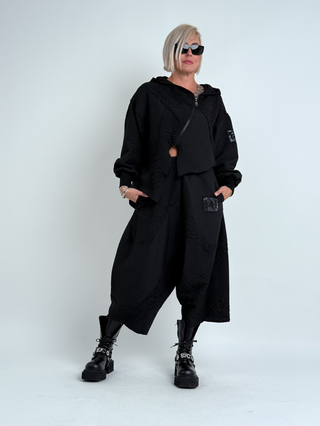 Luxusní top v zajímavém, oversize, asymetrickém střihu, se zipem, kapucí a dlouhým rukávem zakončeným nápletem. MĚŘTE, TOPY ODPOVÍDAJÍ VĚTŠÍM VELIKOSTEM.
