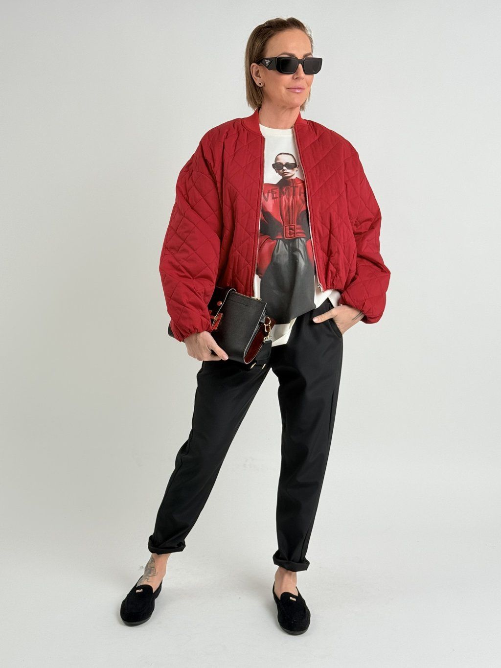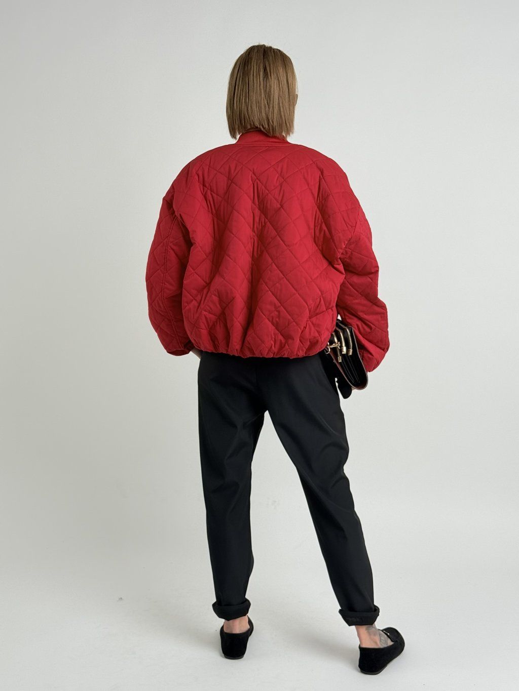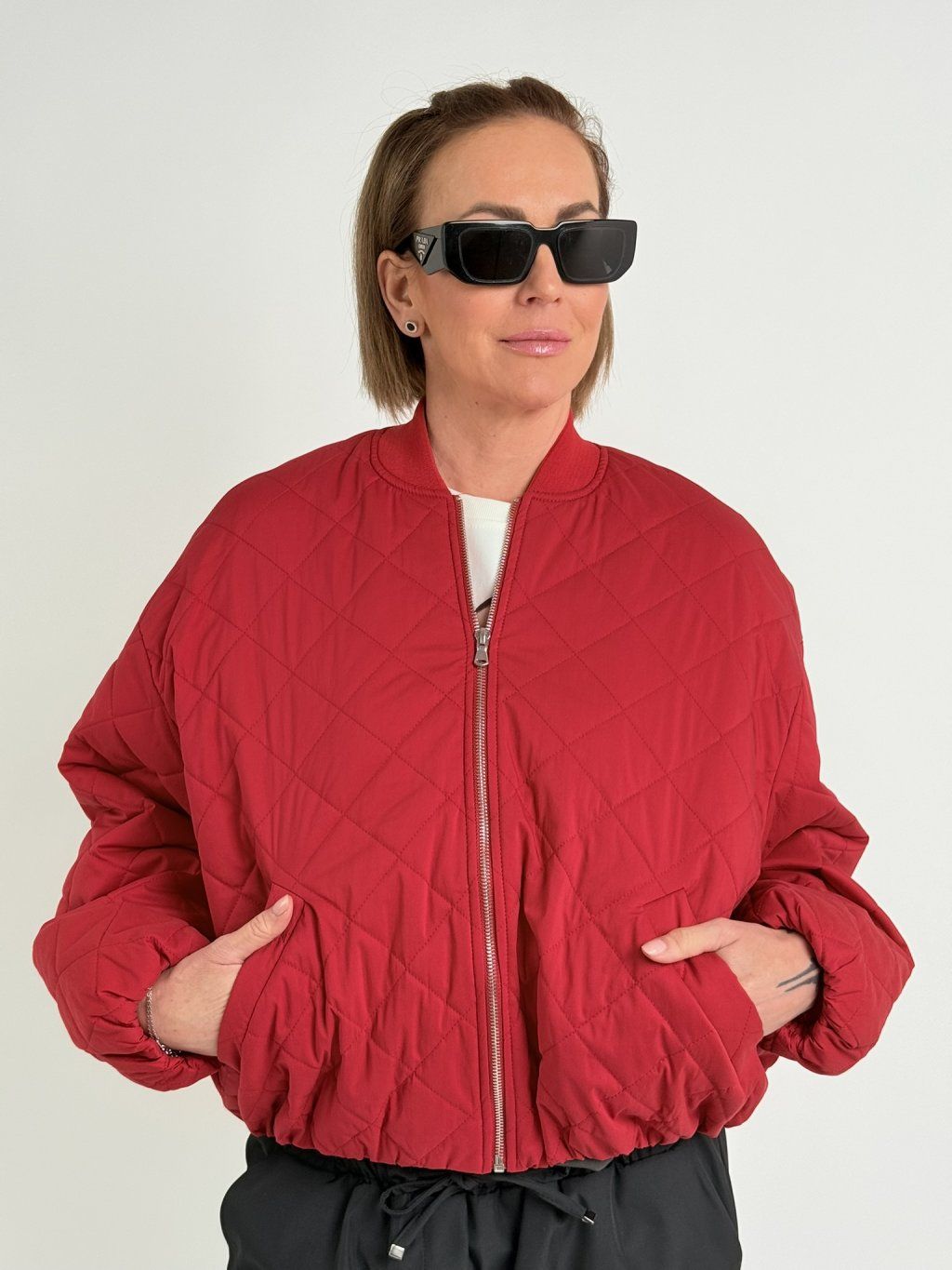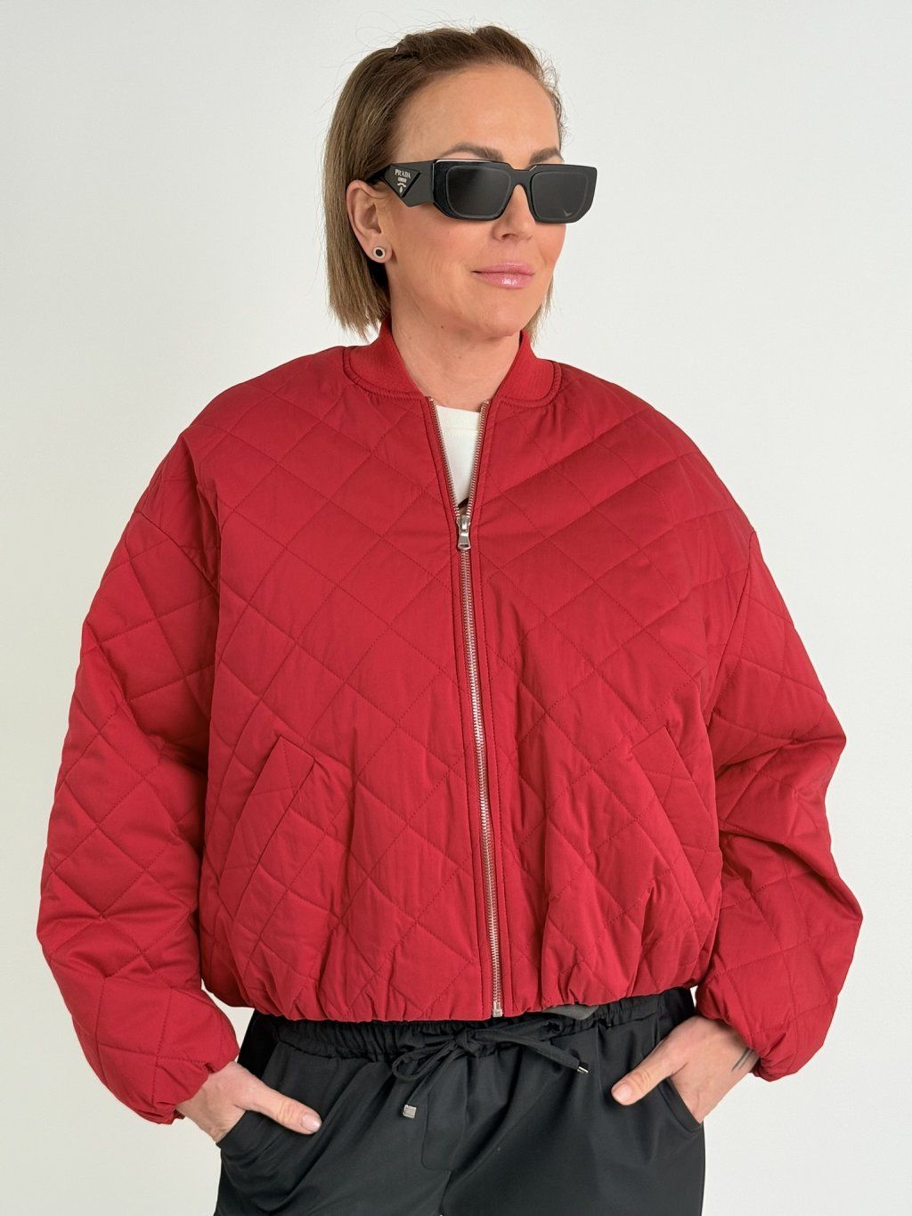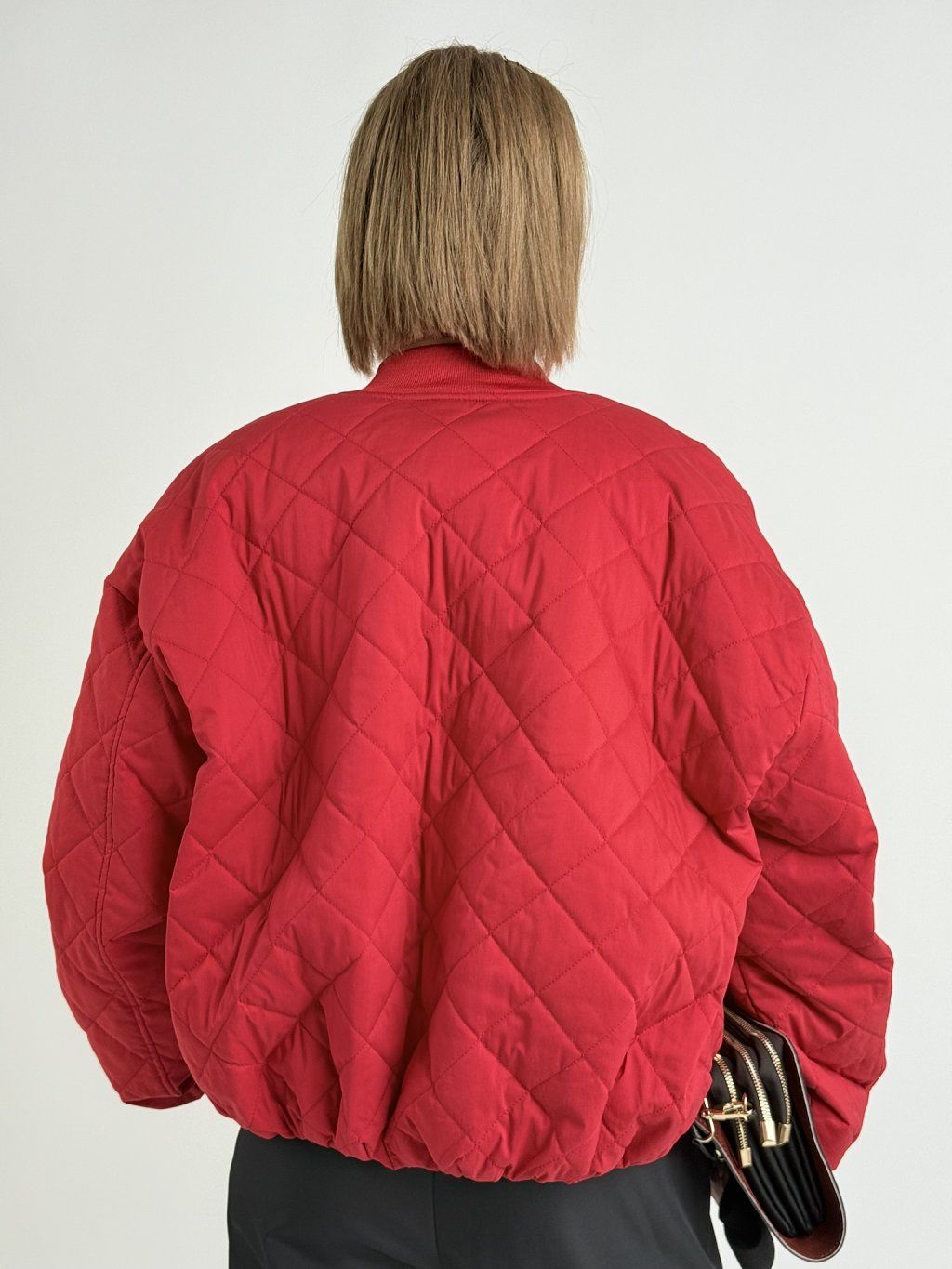 Červený, prošívaný bomber se zapínáním na zip, dolní kraj a konce rukávů jsou zakončeny gumou.