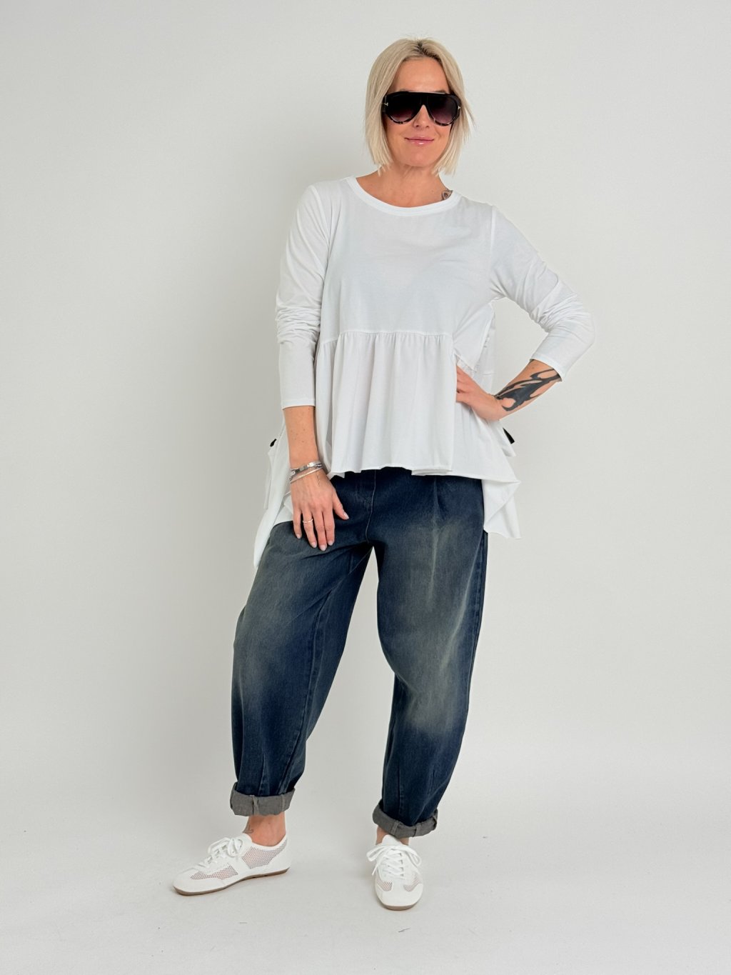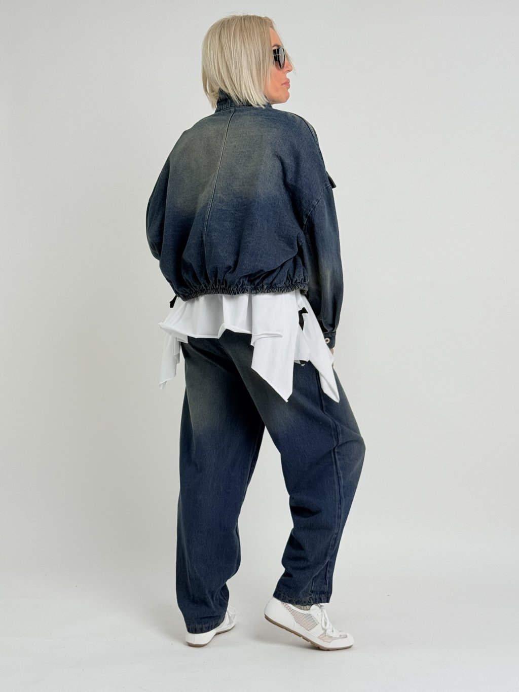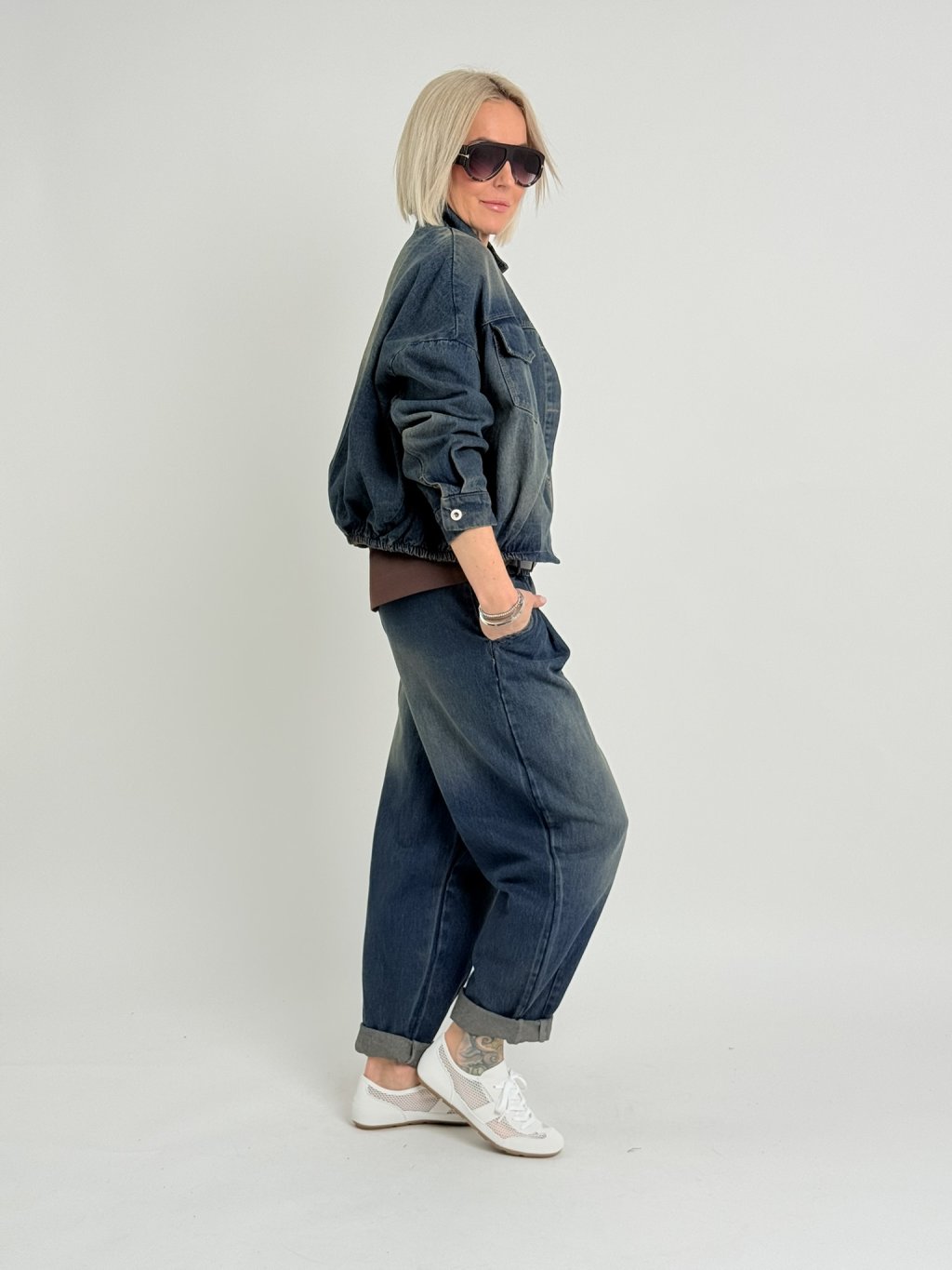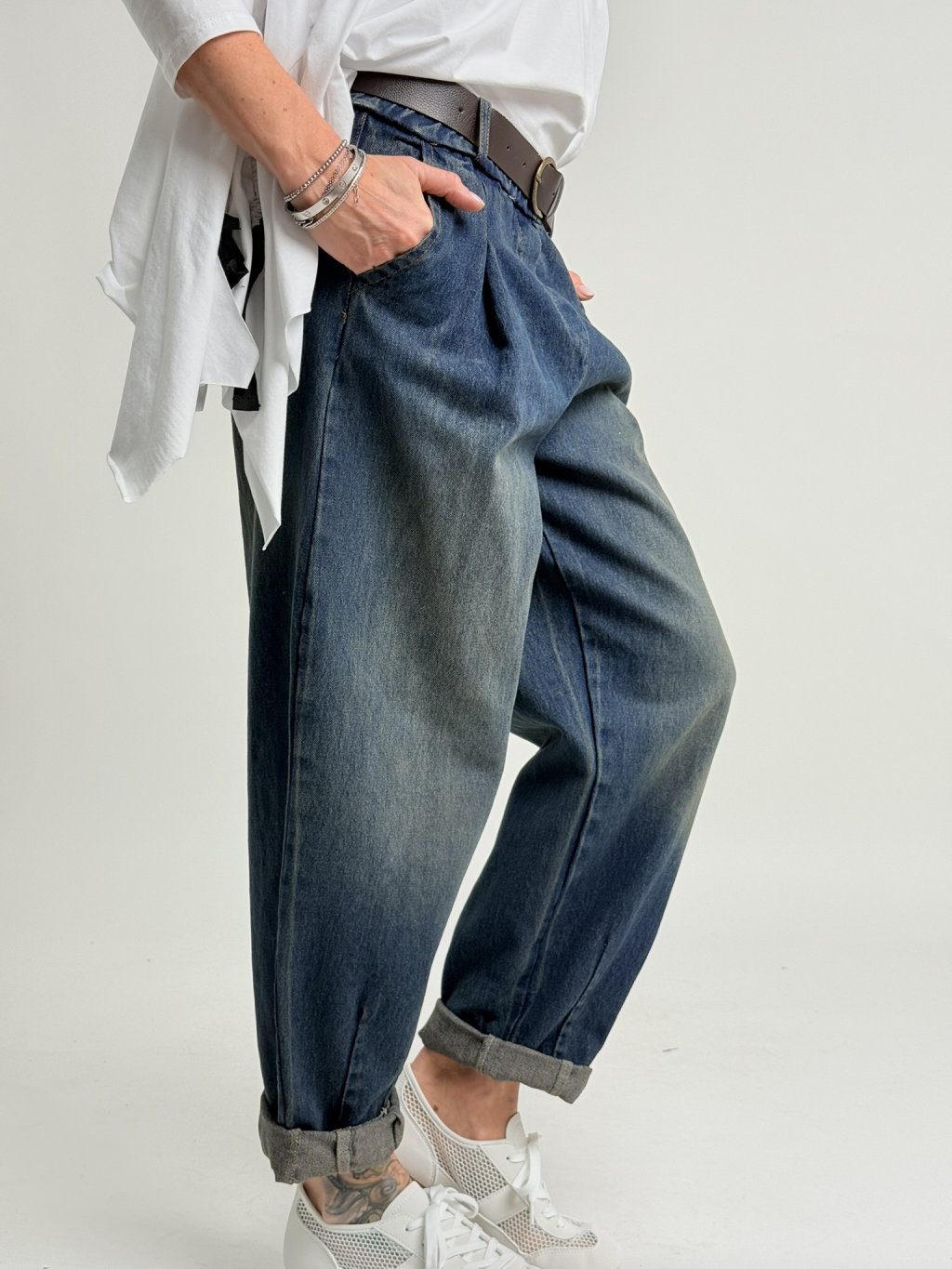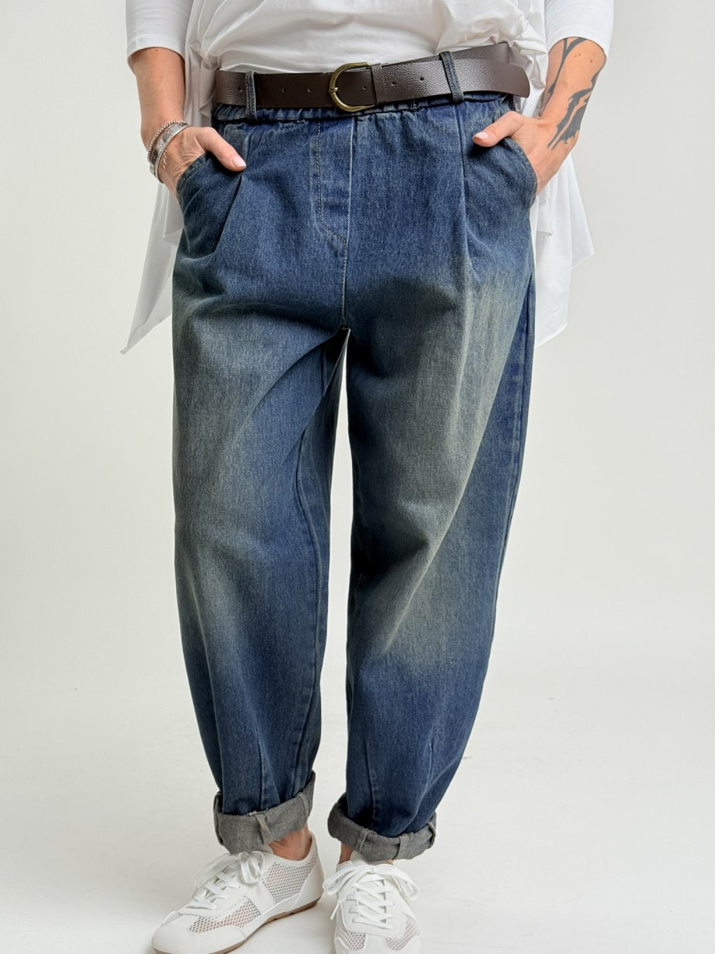 Skvěle padnoucí, boyfriend džíny, v zadní části pasu do gumy, s hnědým, koženkovým páskem.
