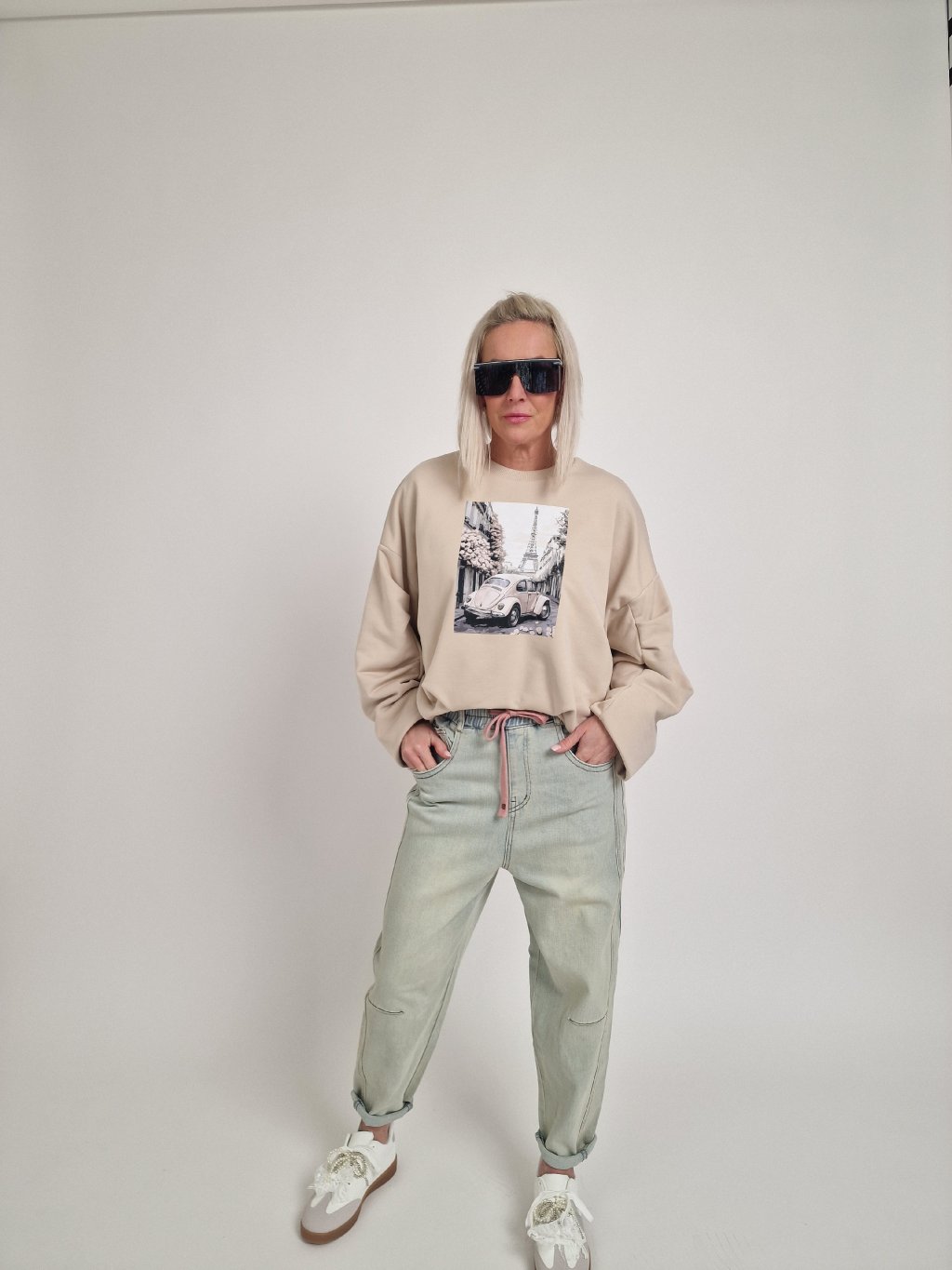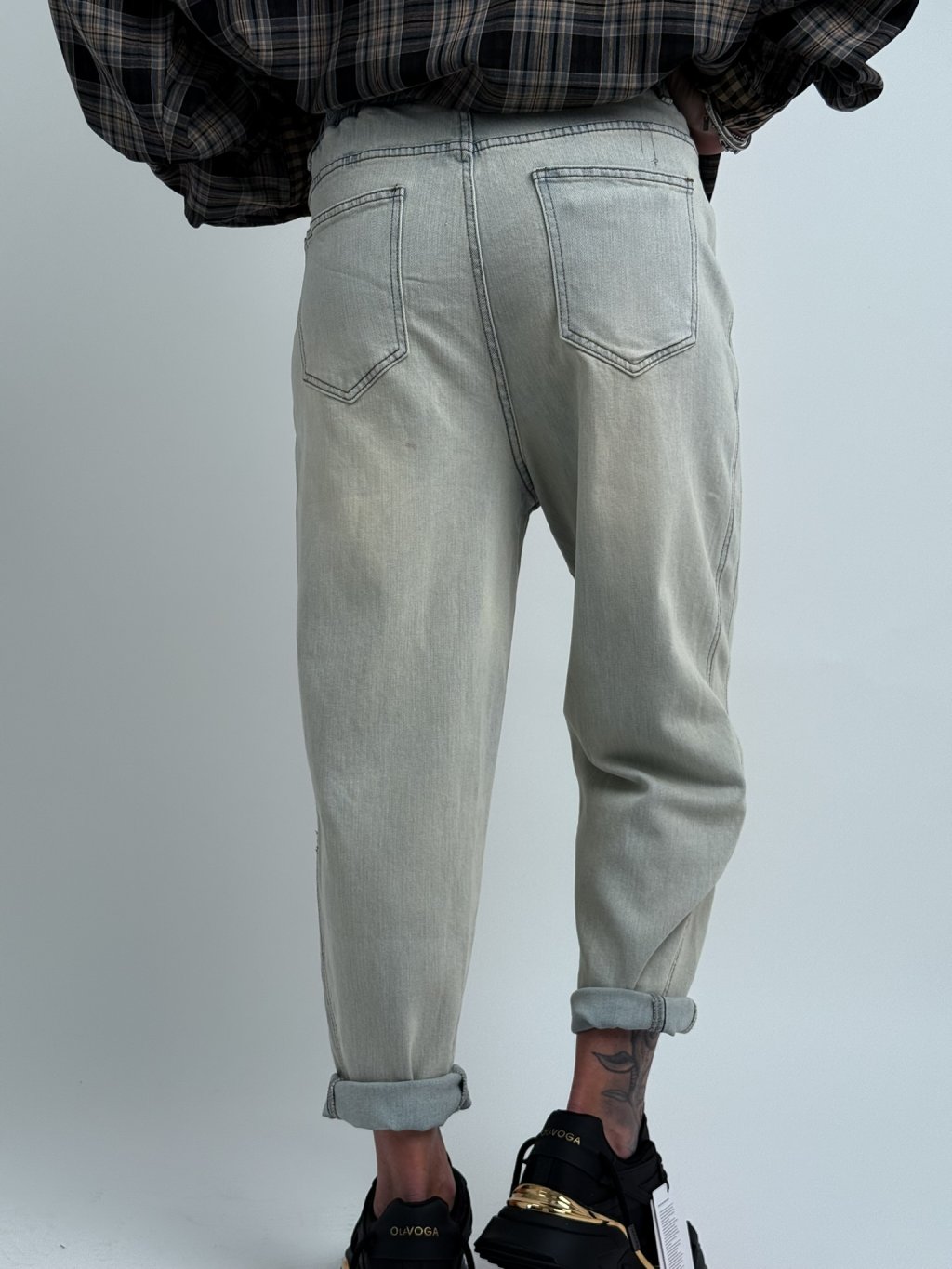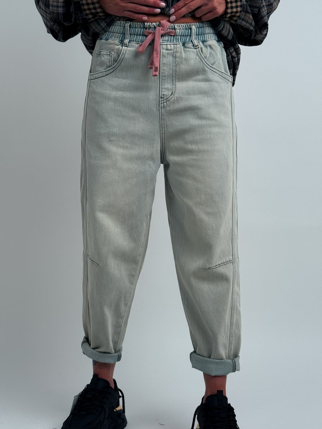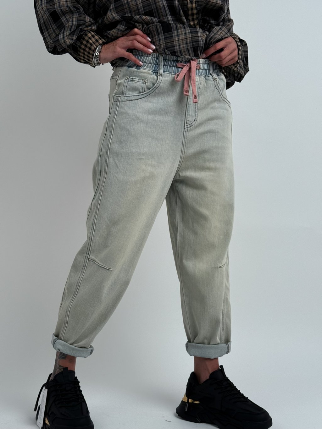 Pohodlné boyfriend džíny v pase do gumy s tkanicí na stažení. Lehce pružné. MĚŘTE!!!!