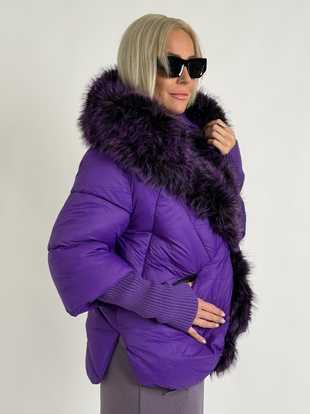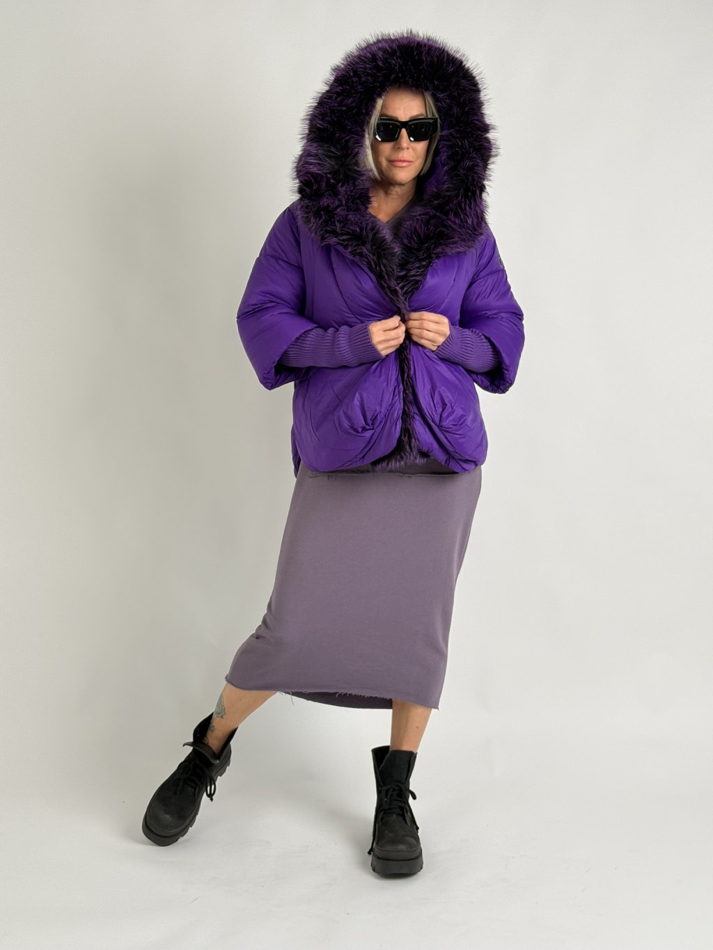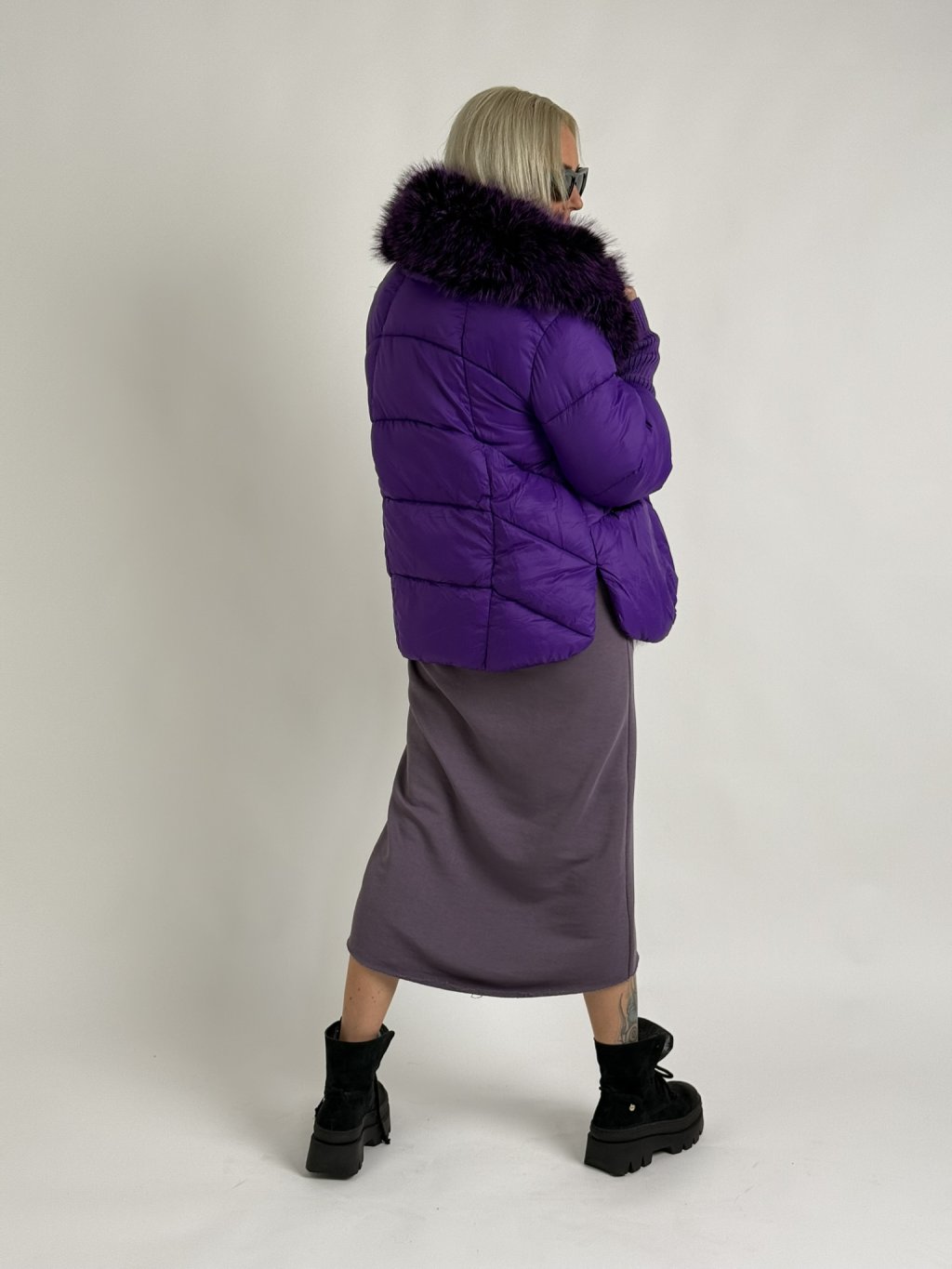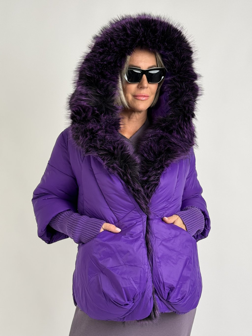 Nádherná, lehká bunda s různými variantami zapínání na patenty (kožešina skrytá uvnitř bundy nebo vyčnívající na povrchu). Kožešina je odepínací po celé délce, takže vznikne krásný doplněk. Bundu můžete nosit úplně bez ní nebo si ji například přehodit jako boa. Opravdu jedinečný variabilní kousek!