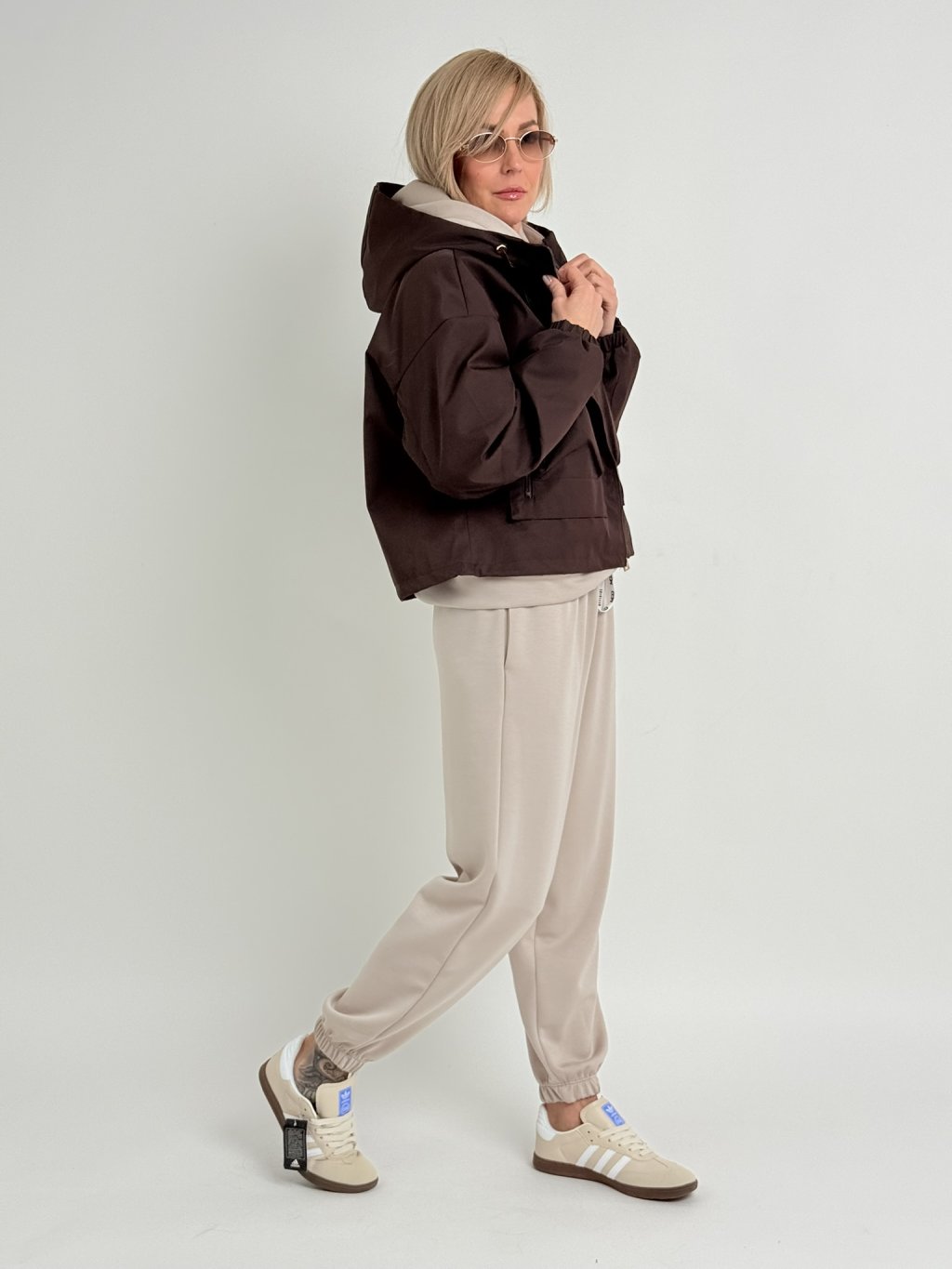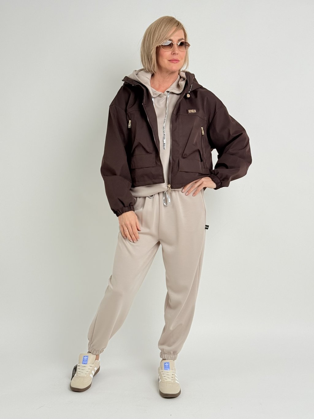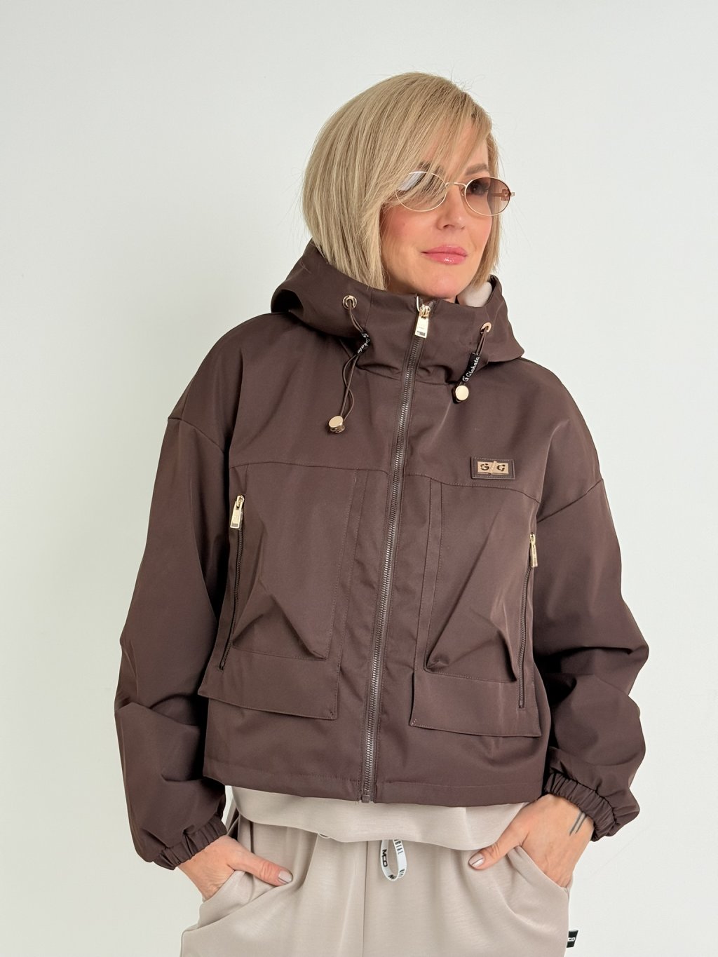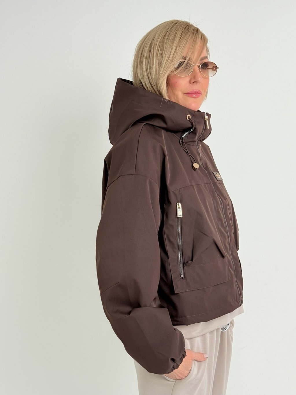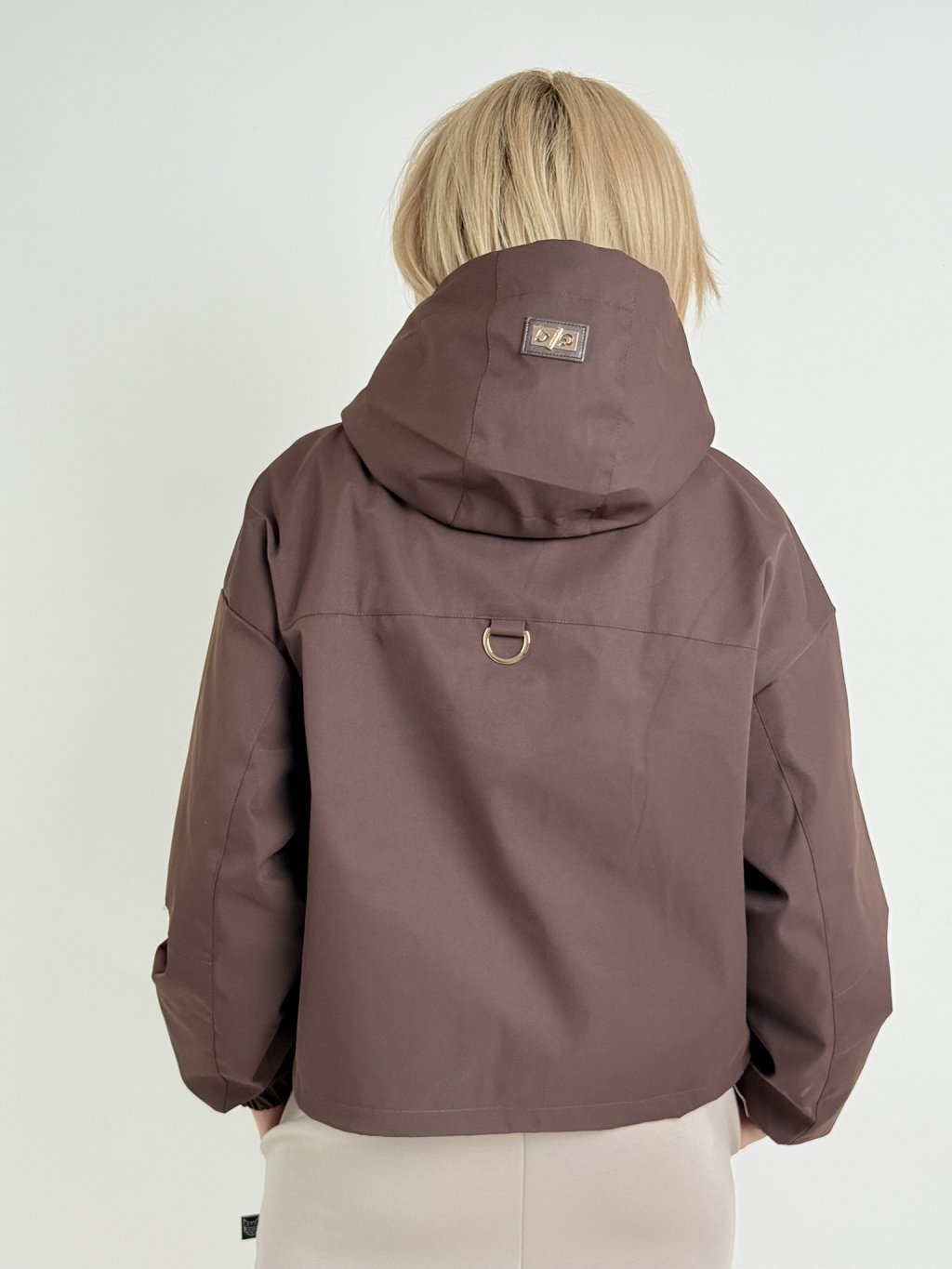 Kratší, volnější bundička  s kapucí, která vpředu přechází ve vysoký stoják, zapíná se na zip, který je i na kapsách. V dolní části je na stažení, rukávy jsou zakončeny gumou.