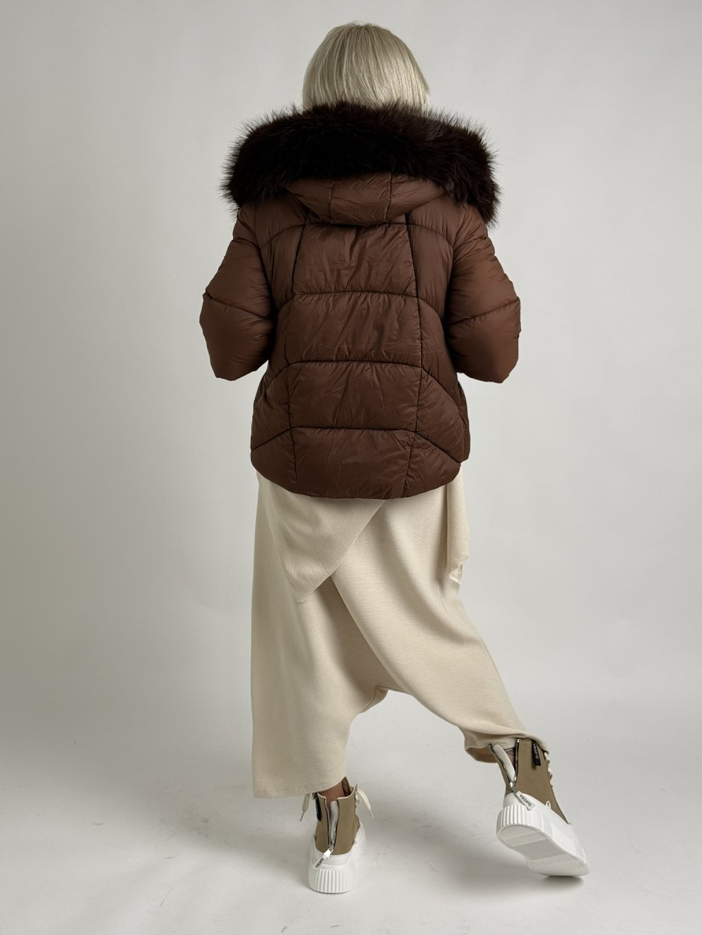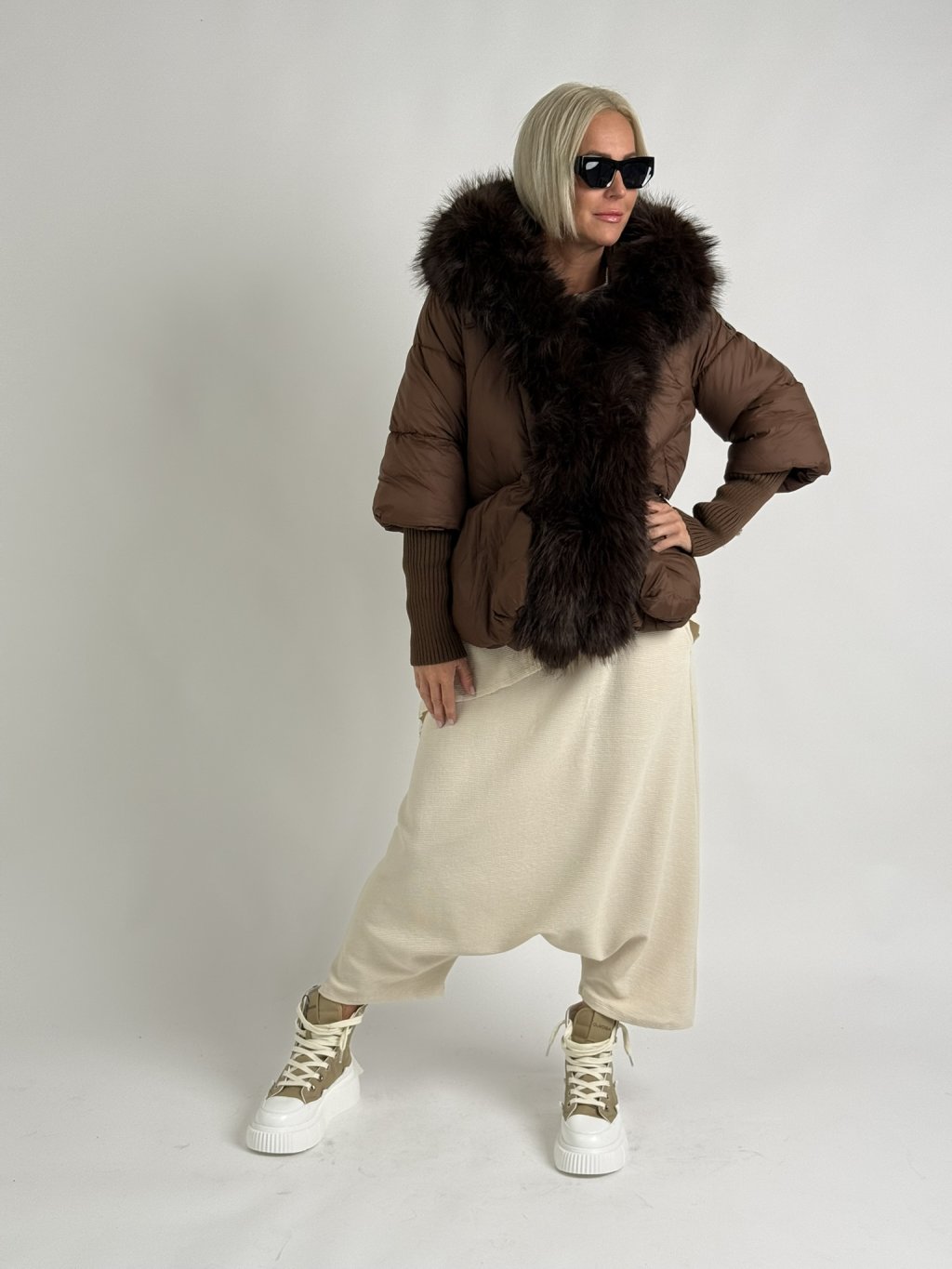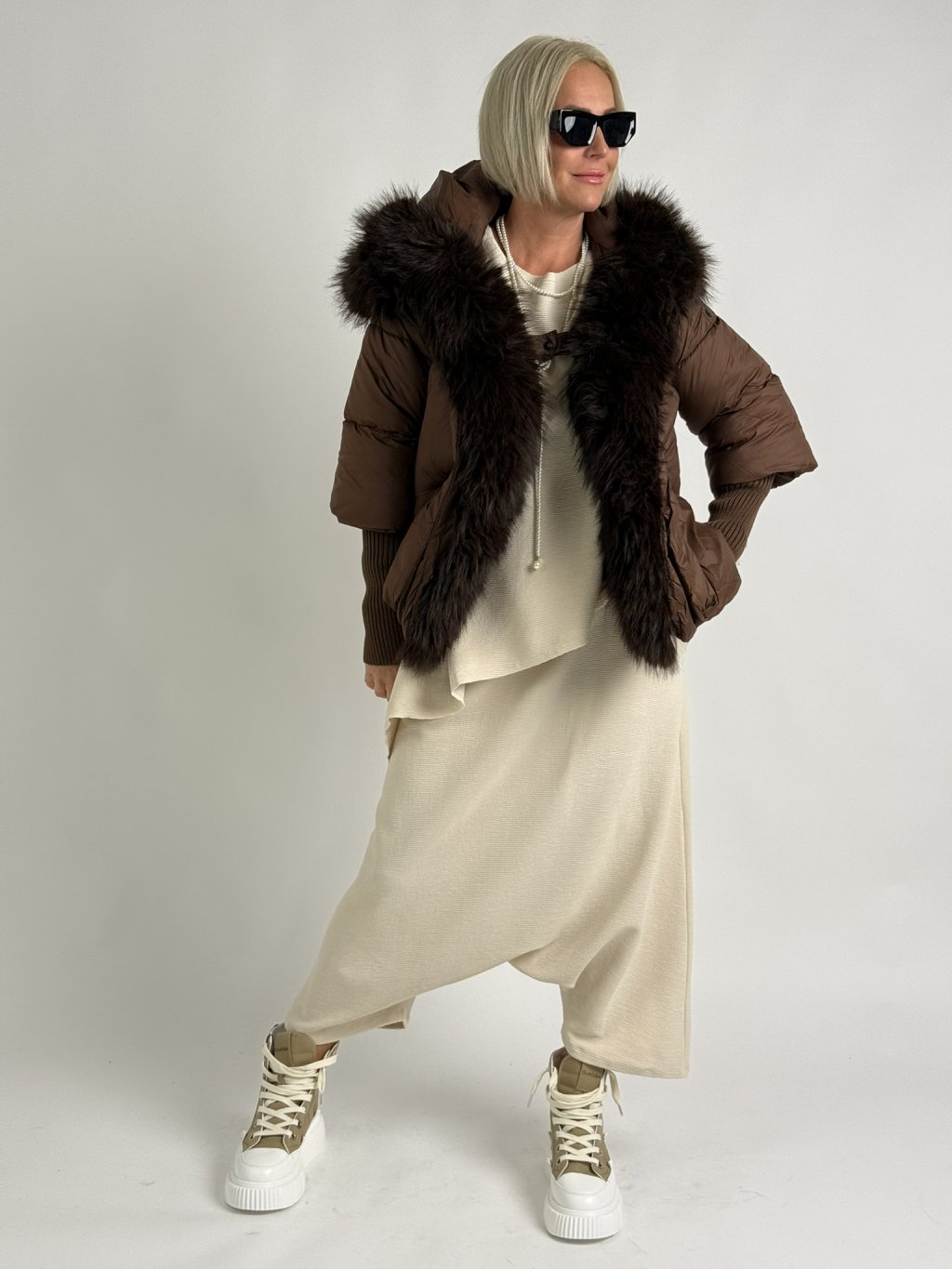 Nádherná, lehká bunda s různými variantami zapínání na patenty (kožešina skrytá uvnitř bundy nebo vyčnívající na povrchu). Kožešina je odepínací po celé délce, takže vznikne krásný doplněk. Bundu můžete nosit úplně bez ní nebo si ji například přehodit jako boa. Opravdu jedinečný variabilní kousek!