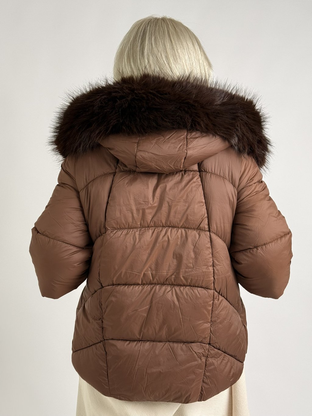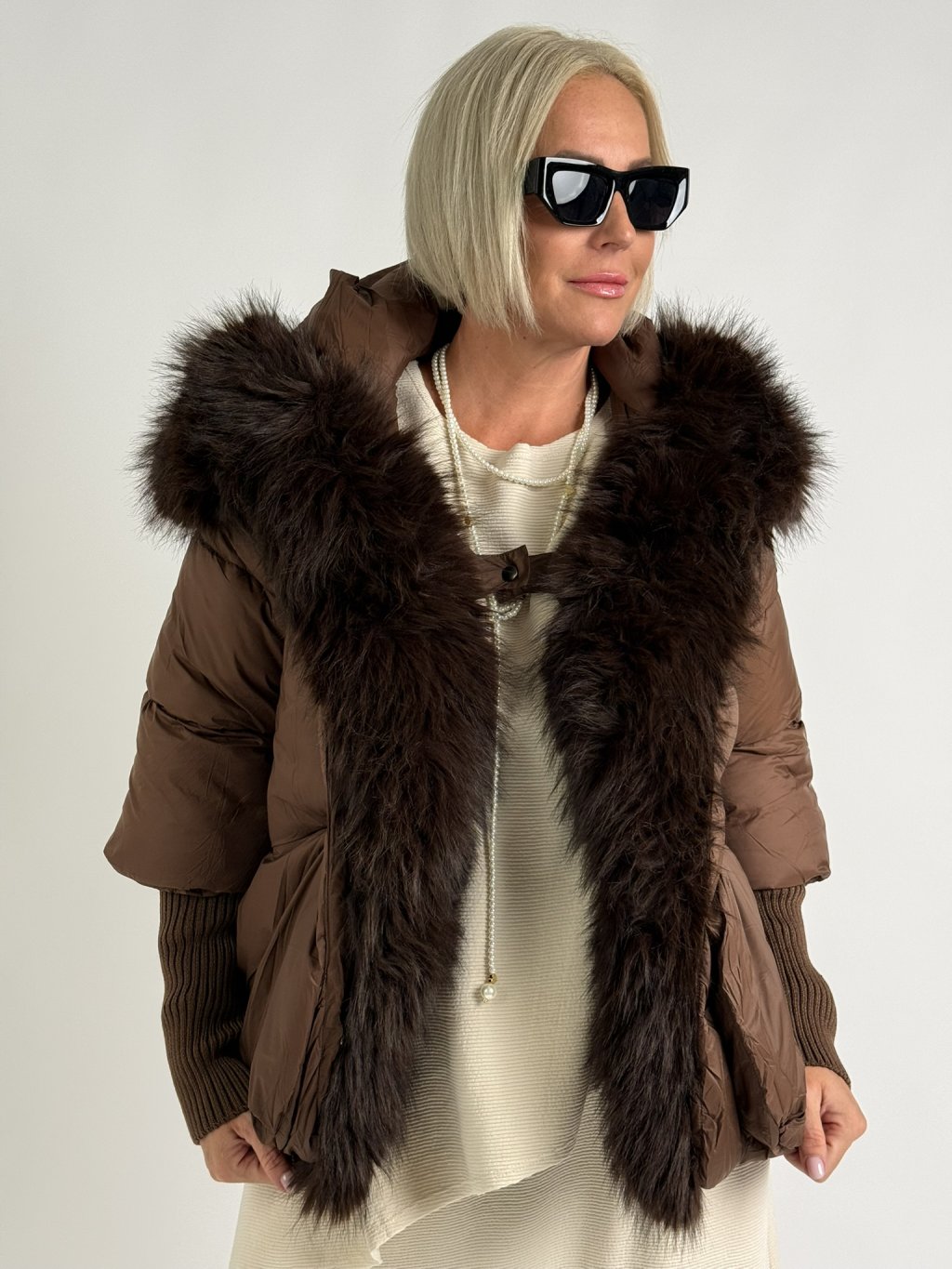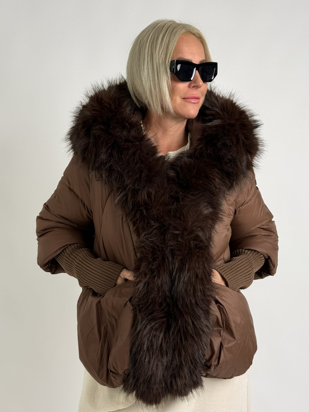 Nádherná, lehká bunda s různými variantami zapínání na patenty (kožešina skrytá uvnitř bundy nebo vyčnívající na povrchu). Kožešina je odepínací po celé délce, takže vznikne krásný doplněk. Bundu můžete nosit úplně bez ní nebo si ji například přehodit jako boa. Opravdu jedinečný variabilní kousek!