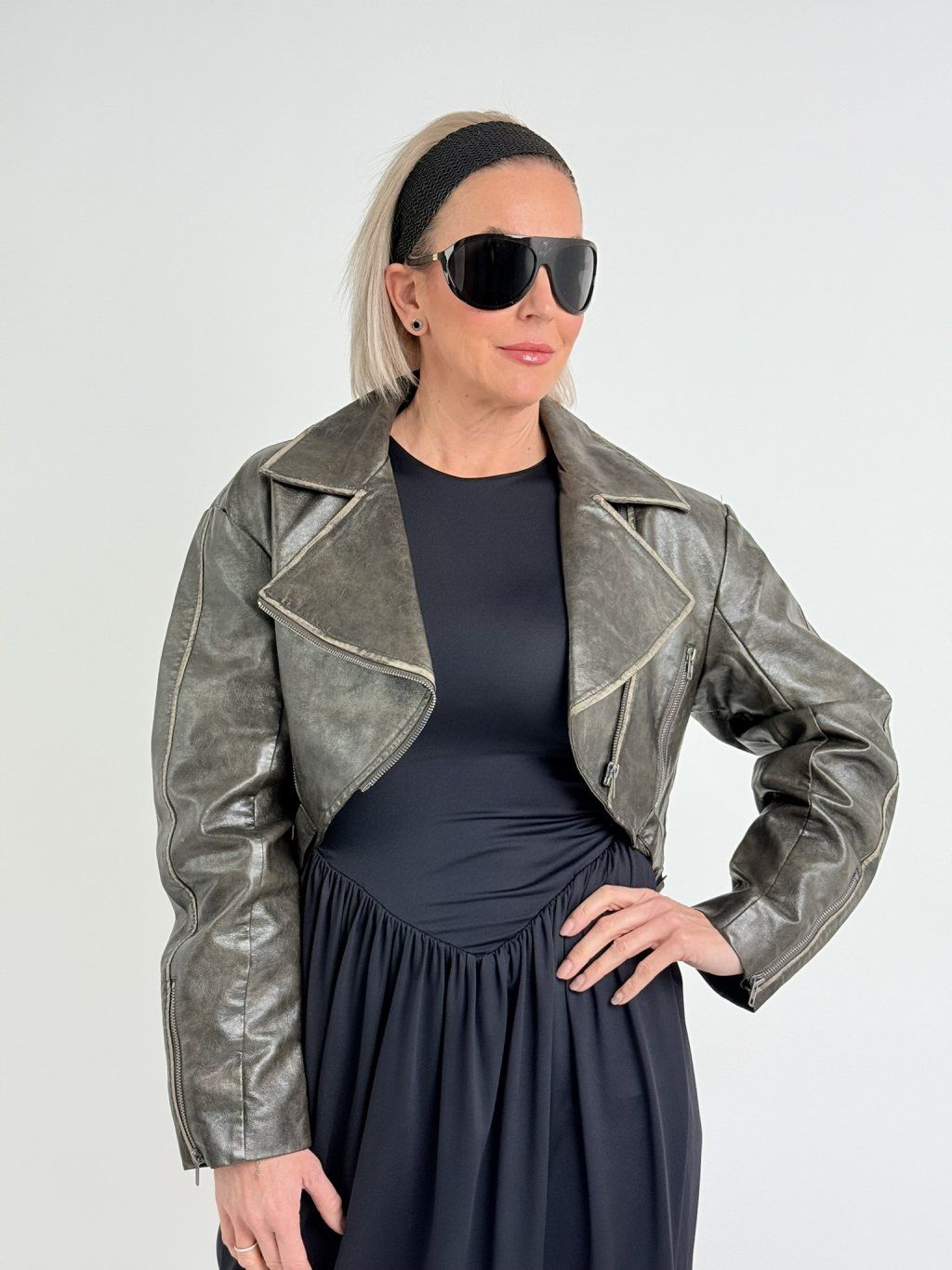 Luxusní, koženkový, kratší křivák se zapínáním na zip, Zip je na kapsách i rukávech.