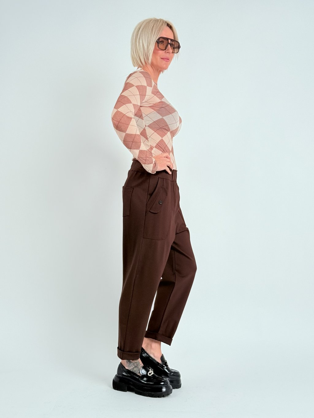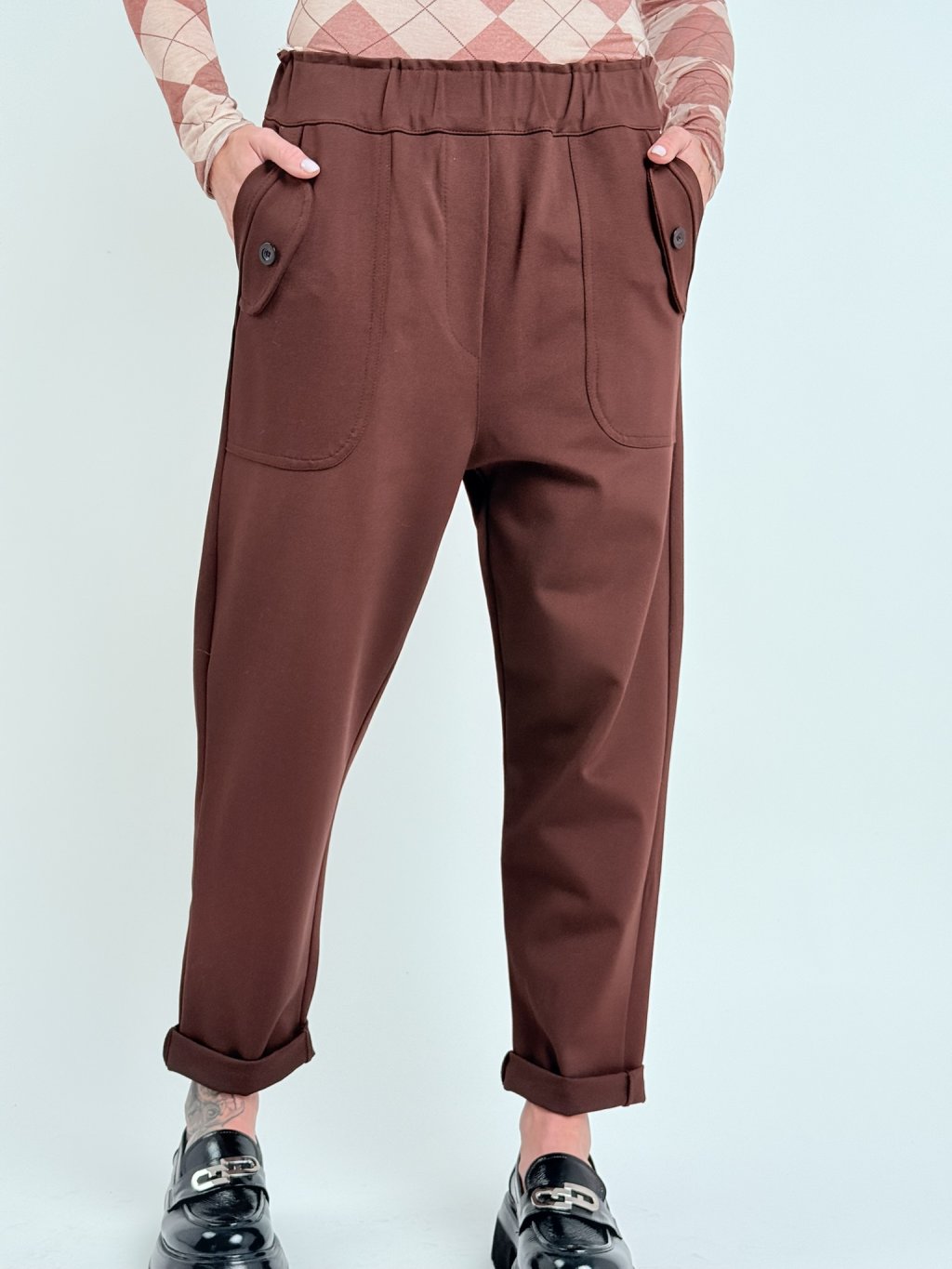 Super kalhoty se sníženým sedem, ozdobnými patkami na předním dílu, v pase se širokou gumou, postranními kapsami. Skvělé s trikem, topem, košilí i sakem.
