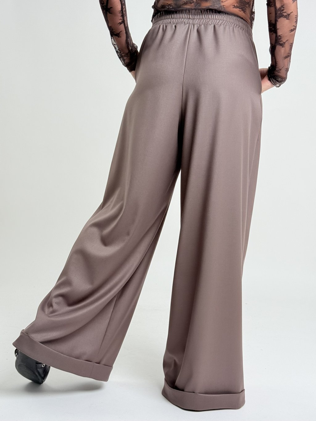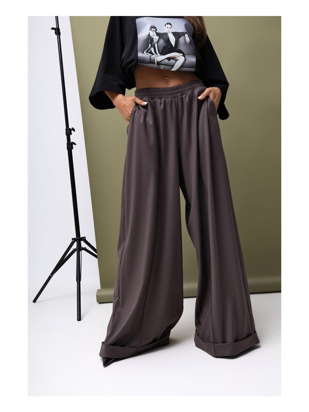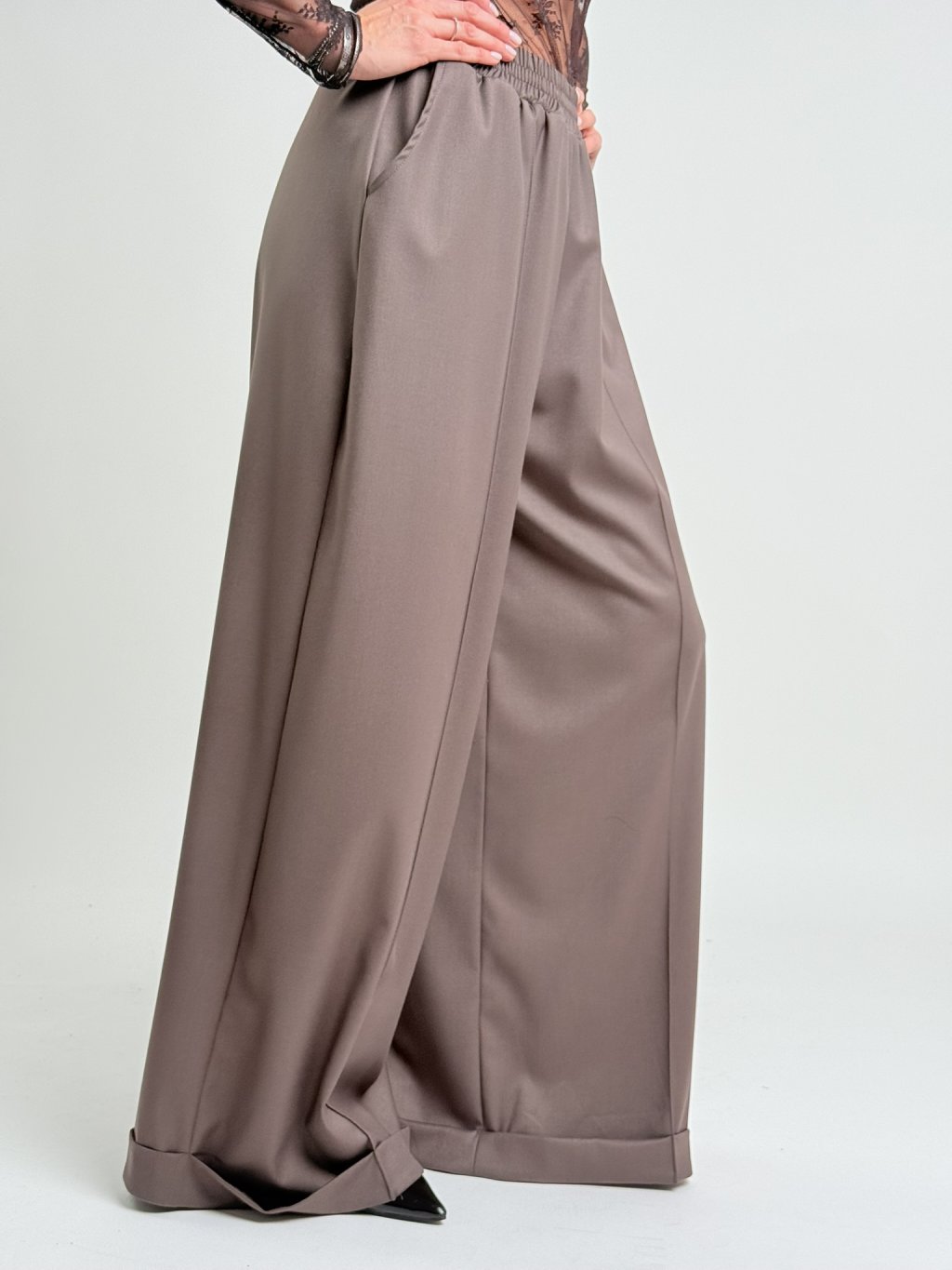 Dokonalé, široké kalhoty s pukem a manžetou, v pase do gumy.