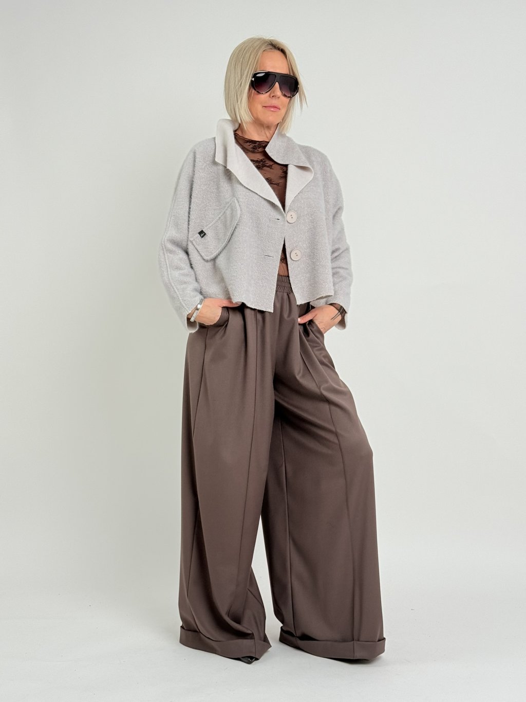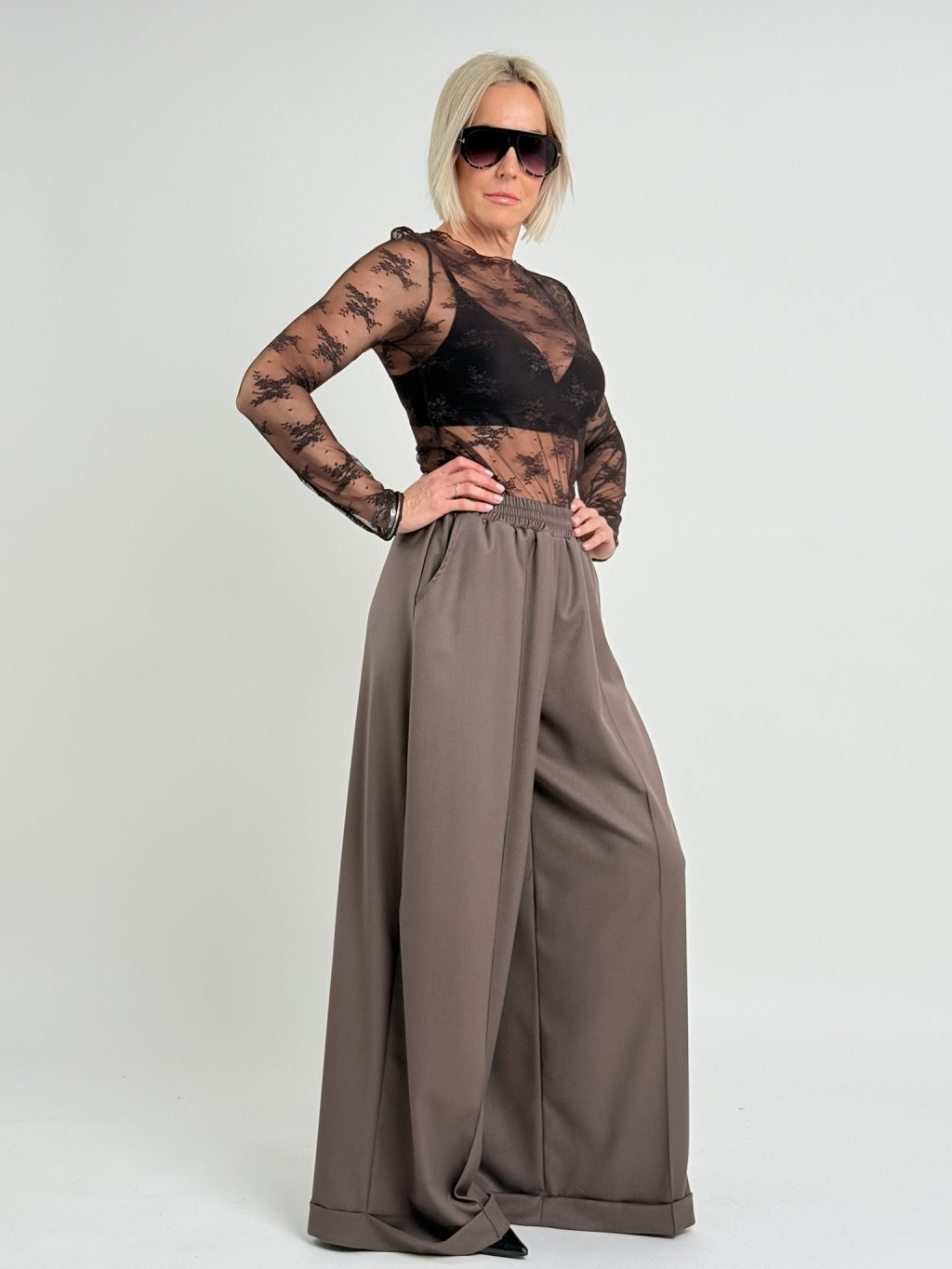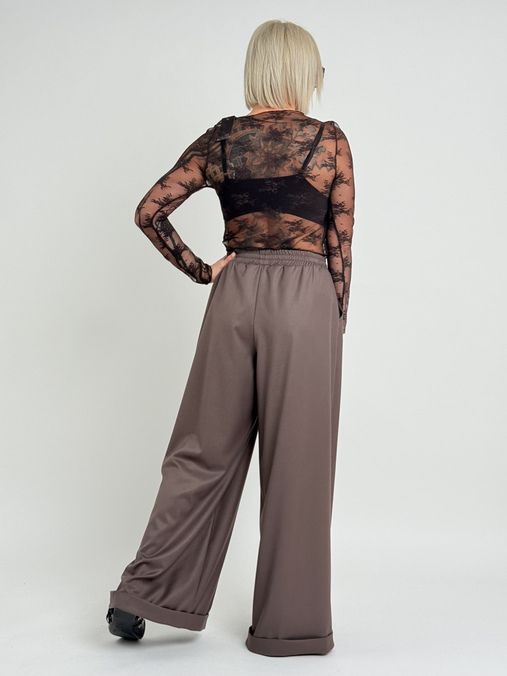 Dokonalé, široké kalhoty s pukem a manžetou, v pase do gumy.