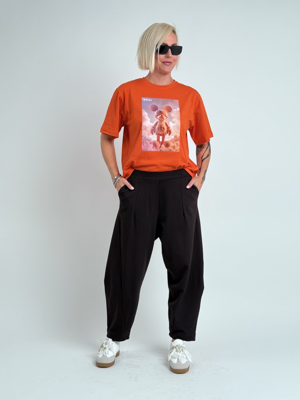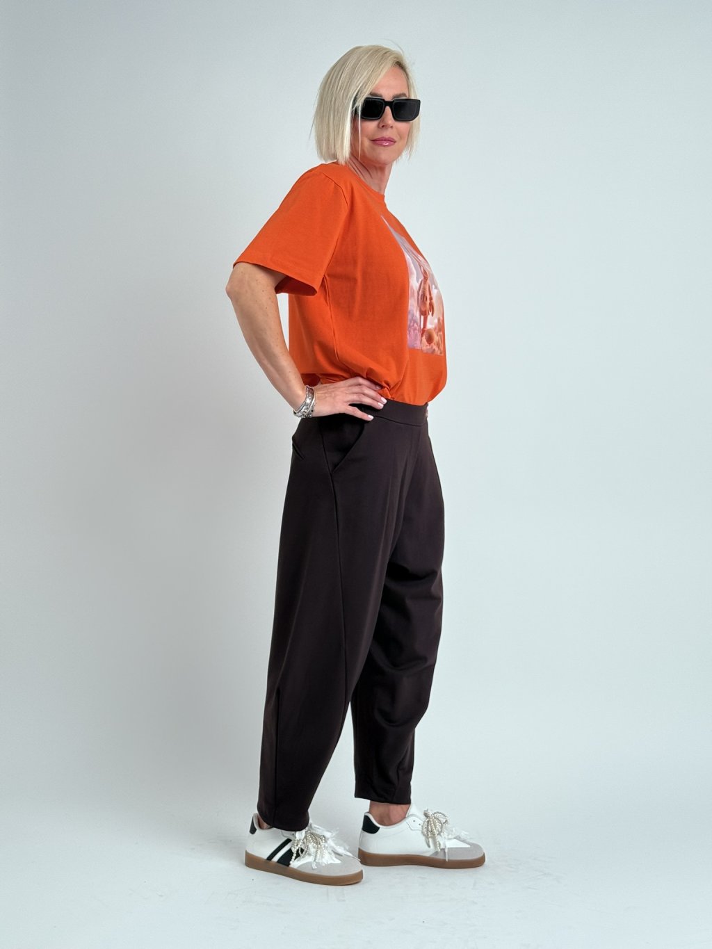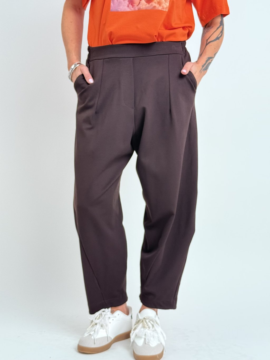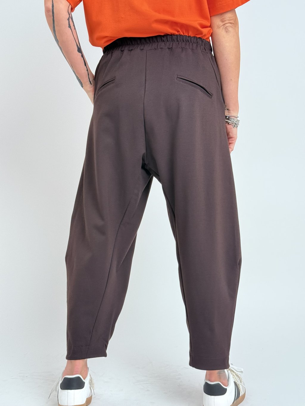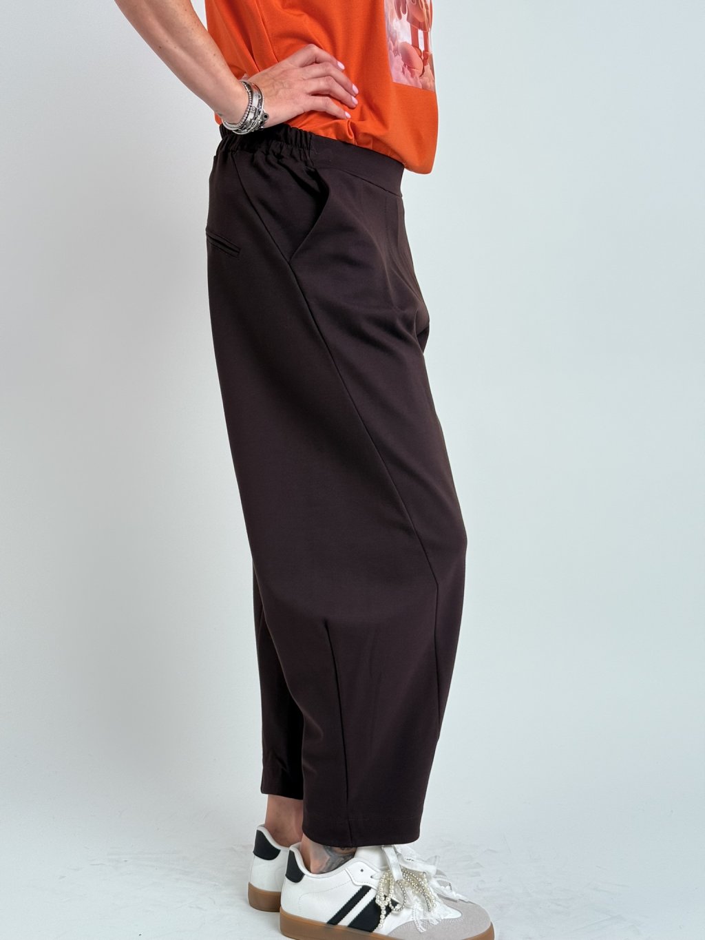 Luxusní kalhoty s gumou v pase, širšími nohavicemi v horní části, dolu se zužujícími. Super střih. NÁDHERNÁ, TEMNĚ HNĚDÁ BARVA!!!
