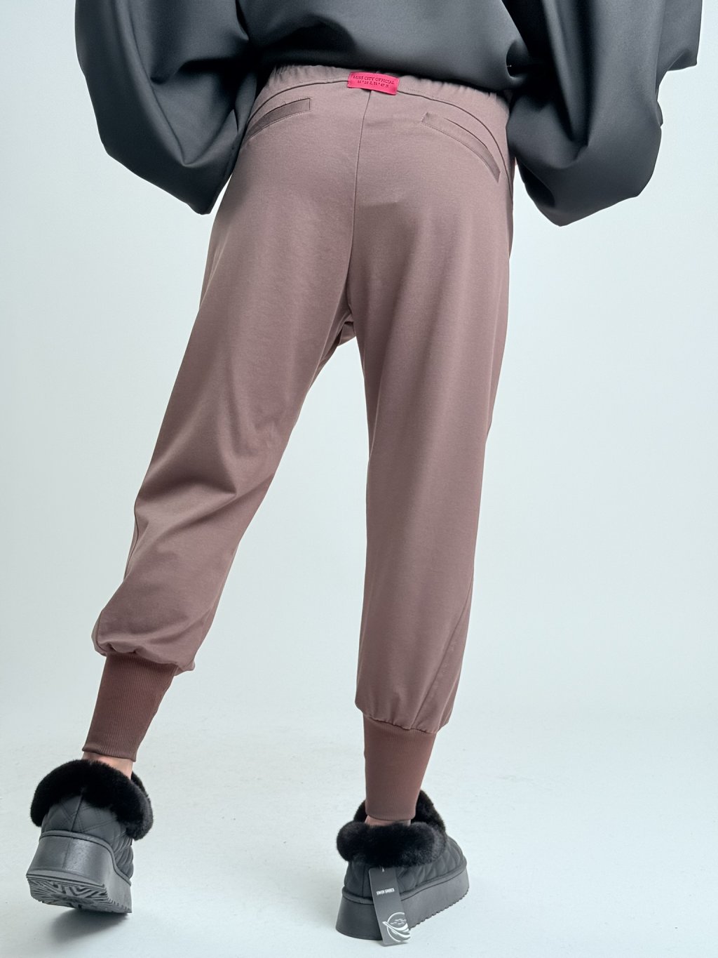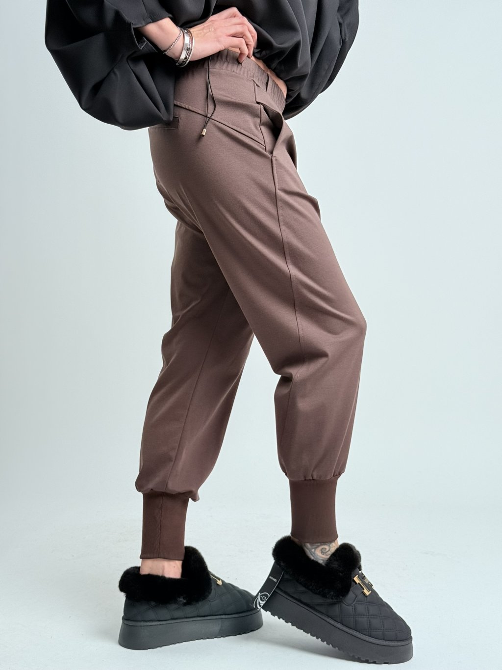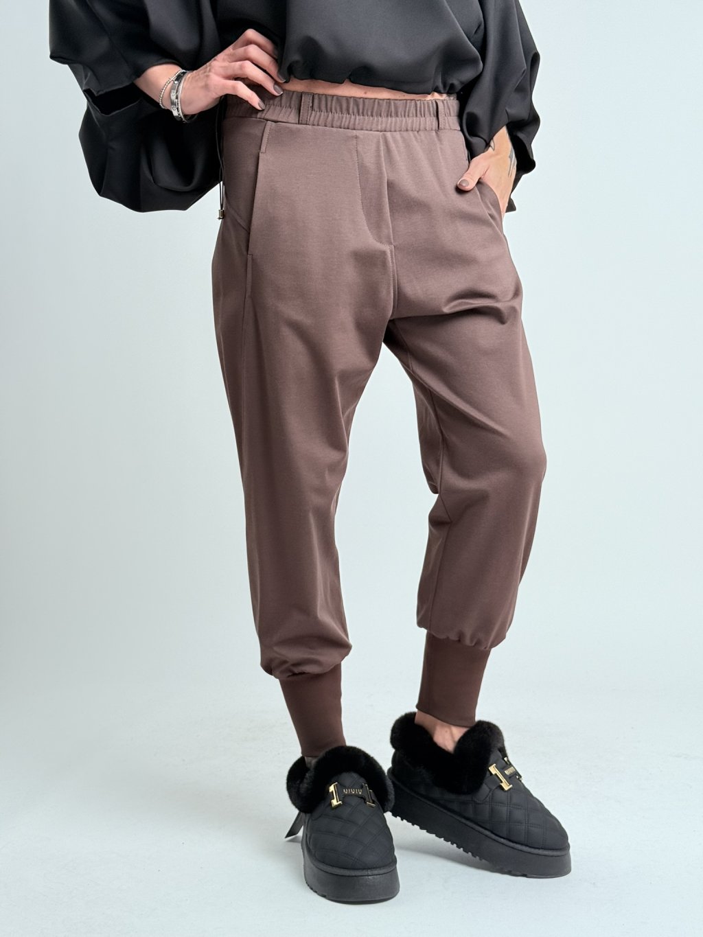 Luxusní oblíbené kalhoty s vysokými náplety na nohavicích. V pase na gumu, postranními všitými kapsami.