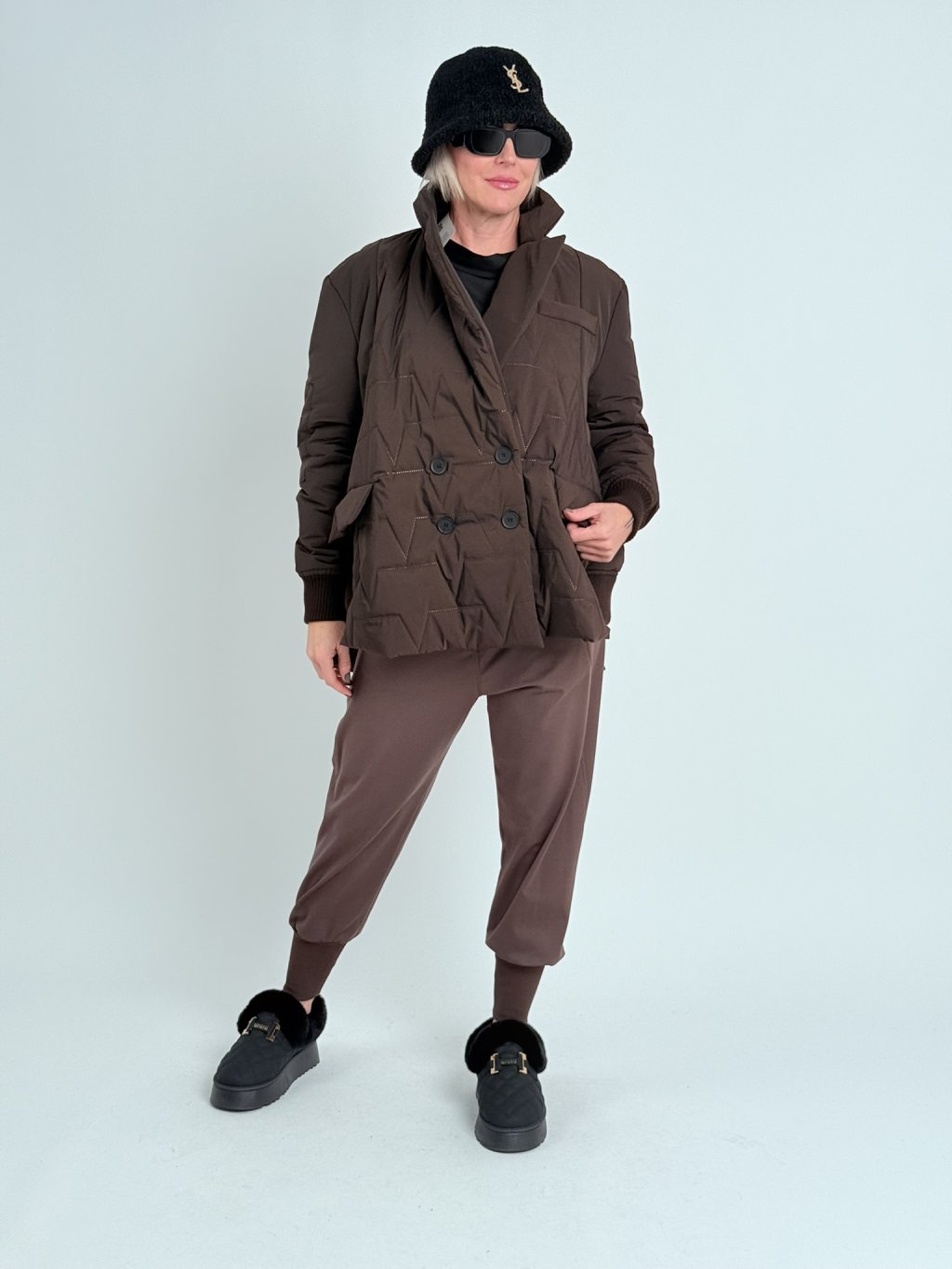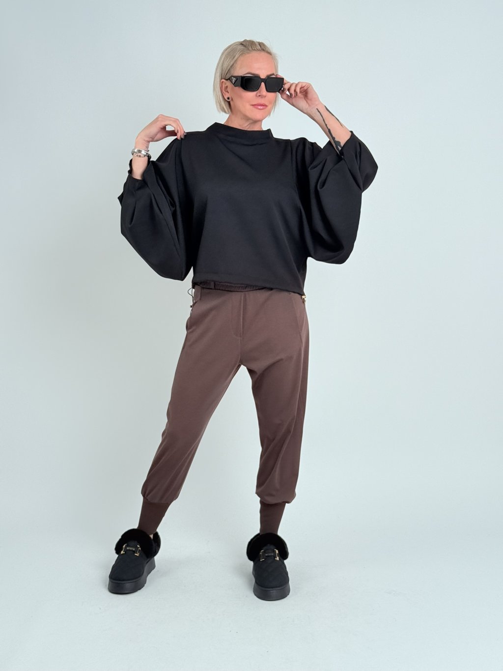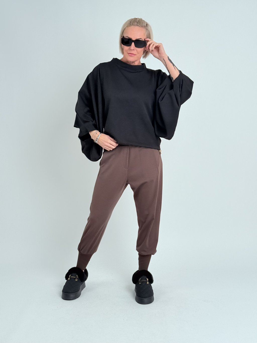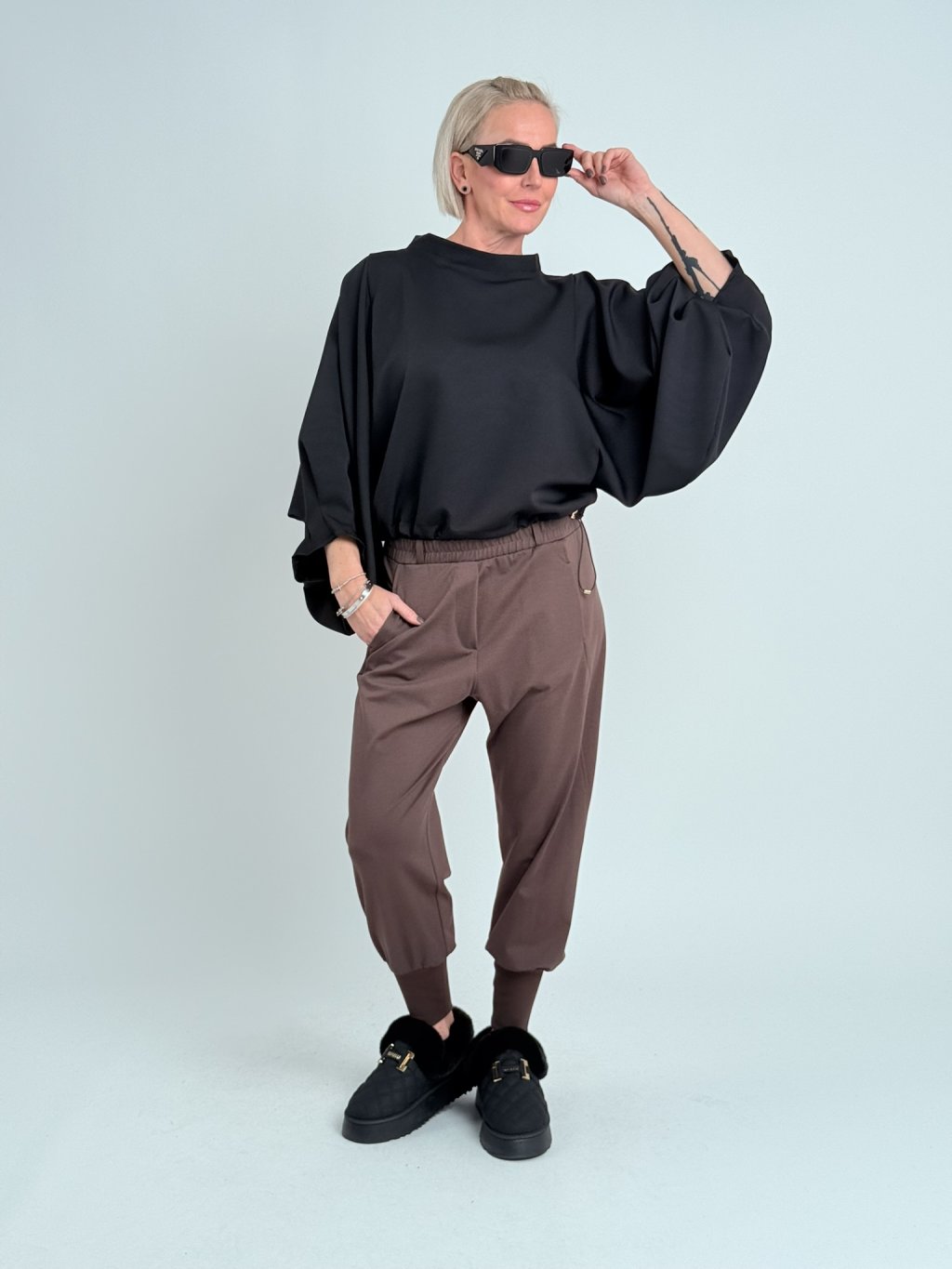 Luxusní oblíbené kalhoty s vysokými náplety na nohavicích. V pase na gumu, postranními všitými kapsami.