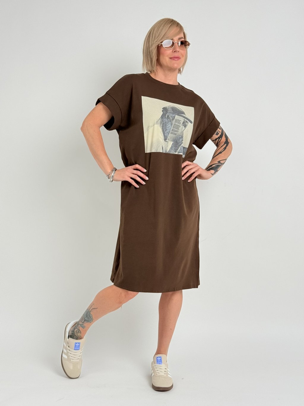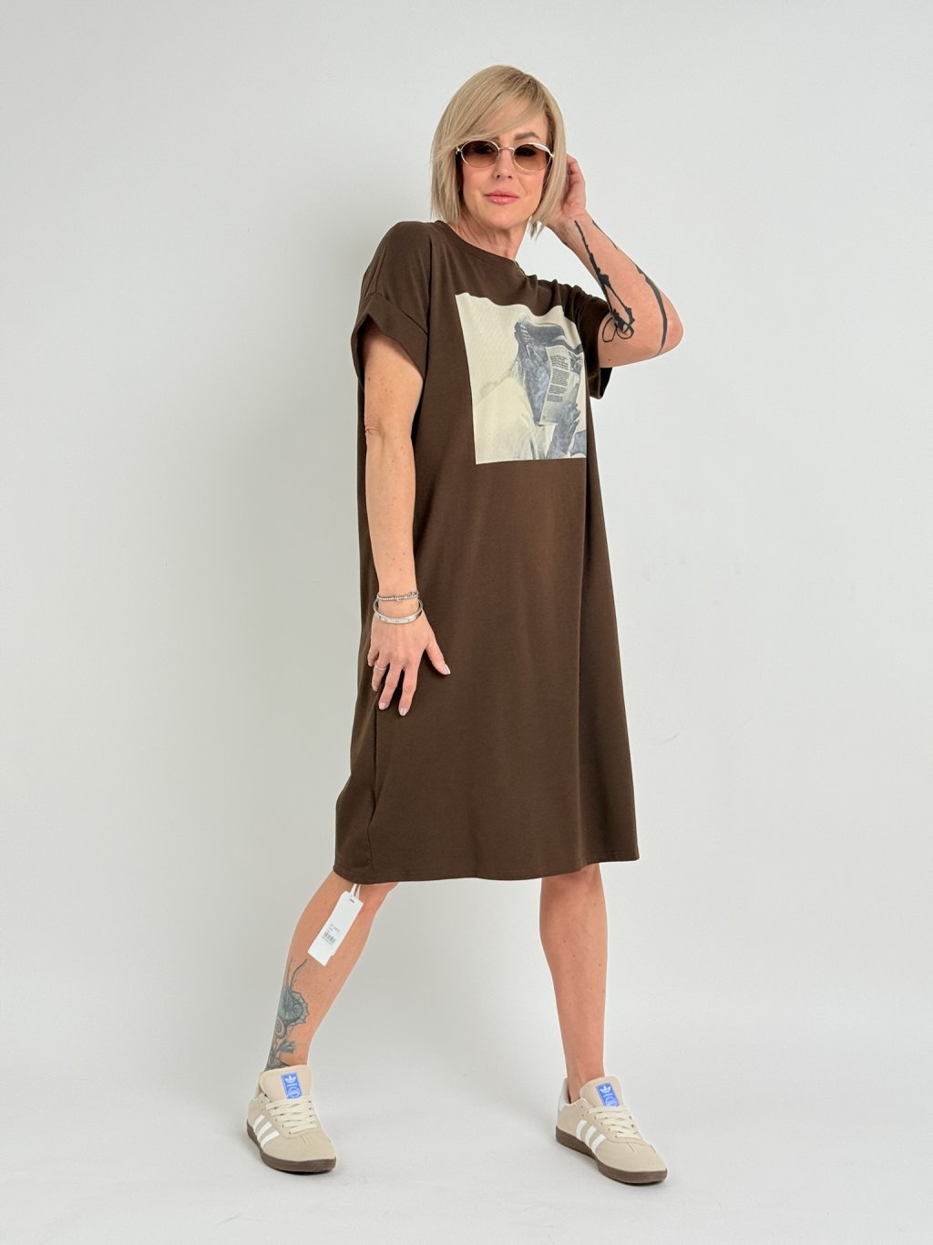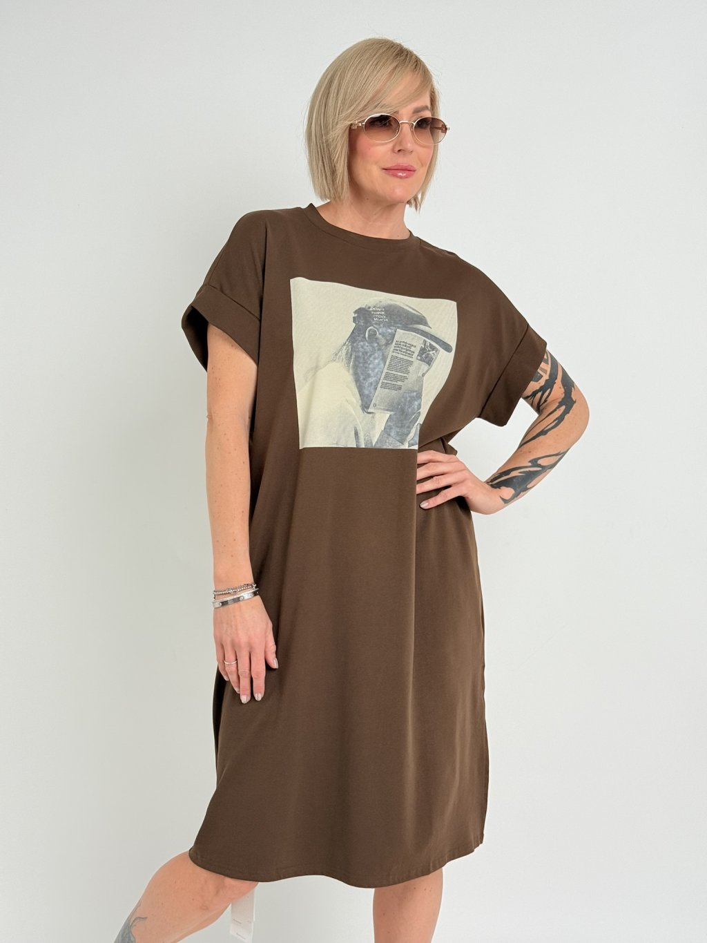 Jednoduché, bavlněné, volné šaty s bočním rozparkem, krátkým, ohrnutým rukávem a potiskem na předním dílu.