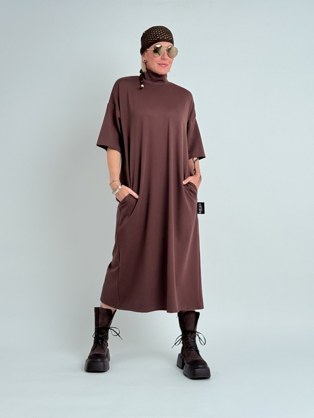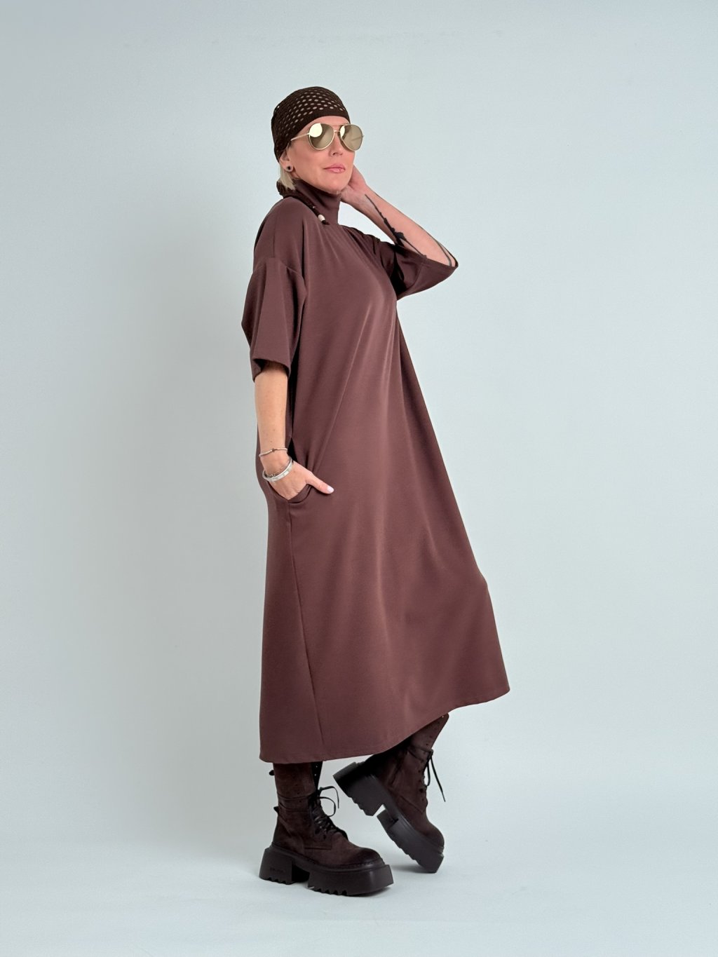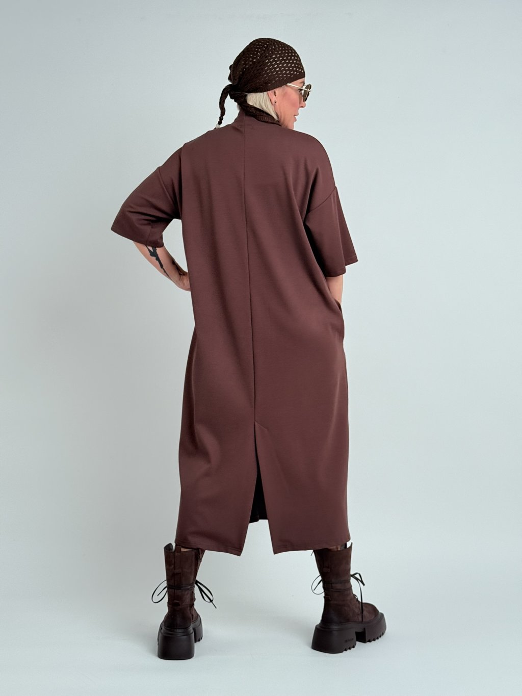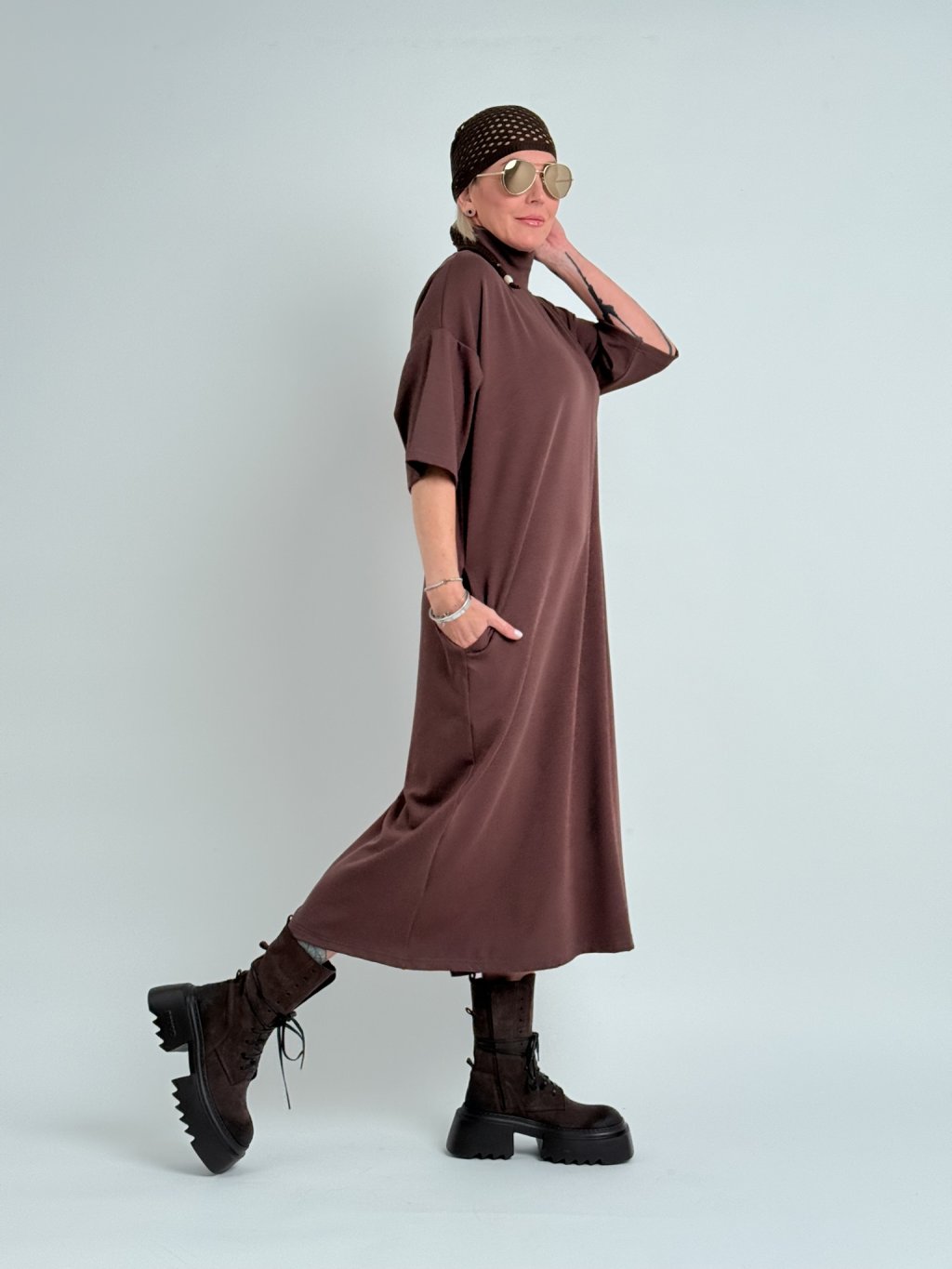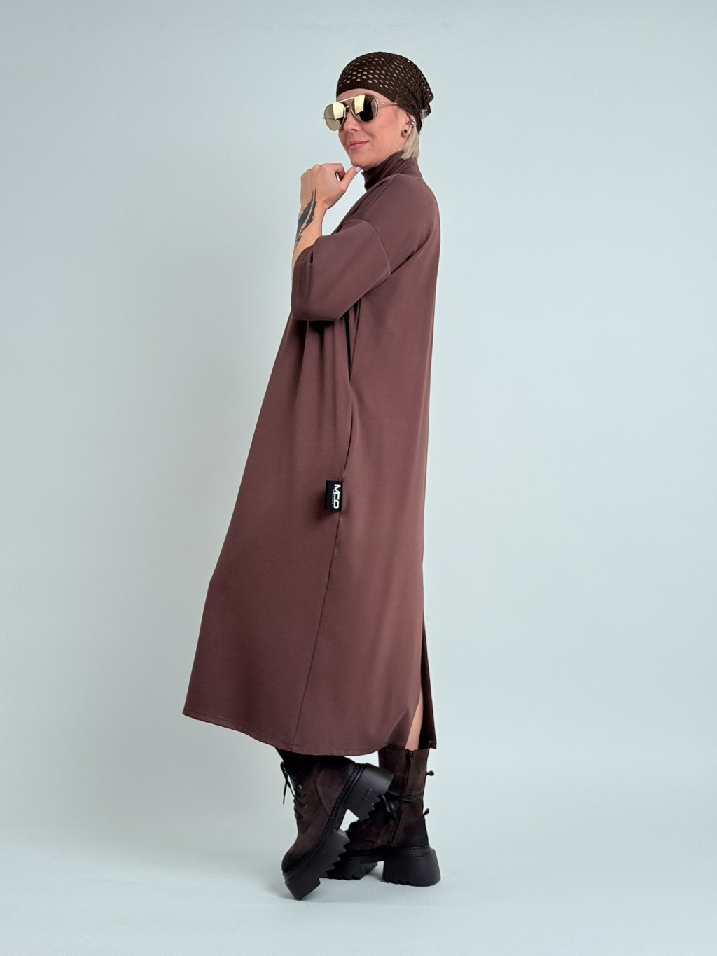 Jednoduché, ale zajímavé šaty s rukávem k lokti, stojákem a vzadu s rozparkem.