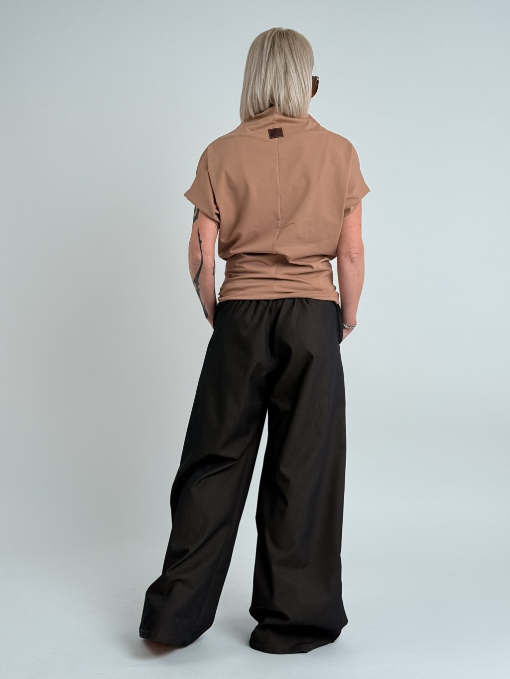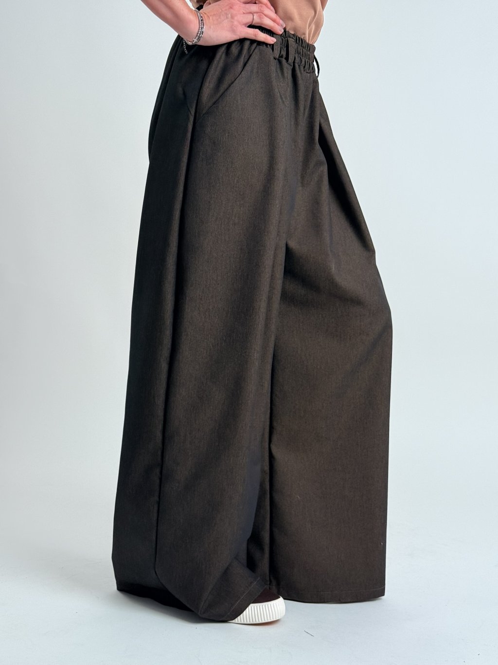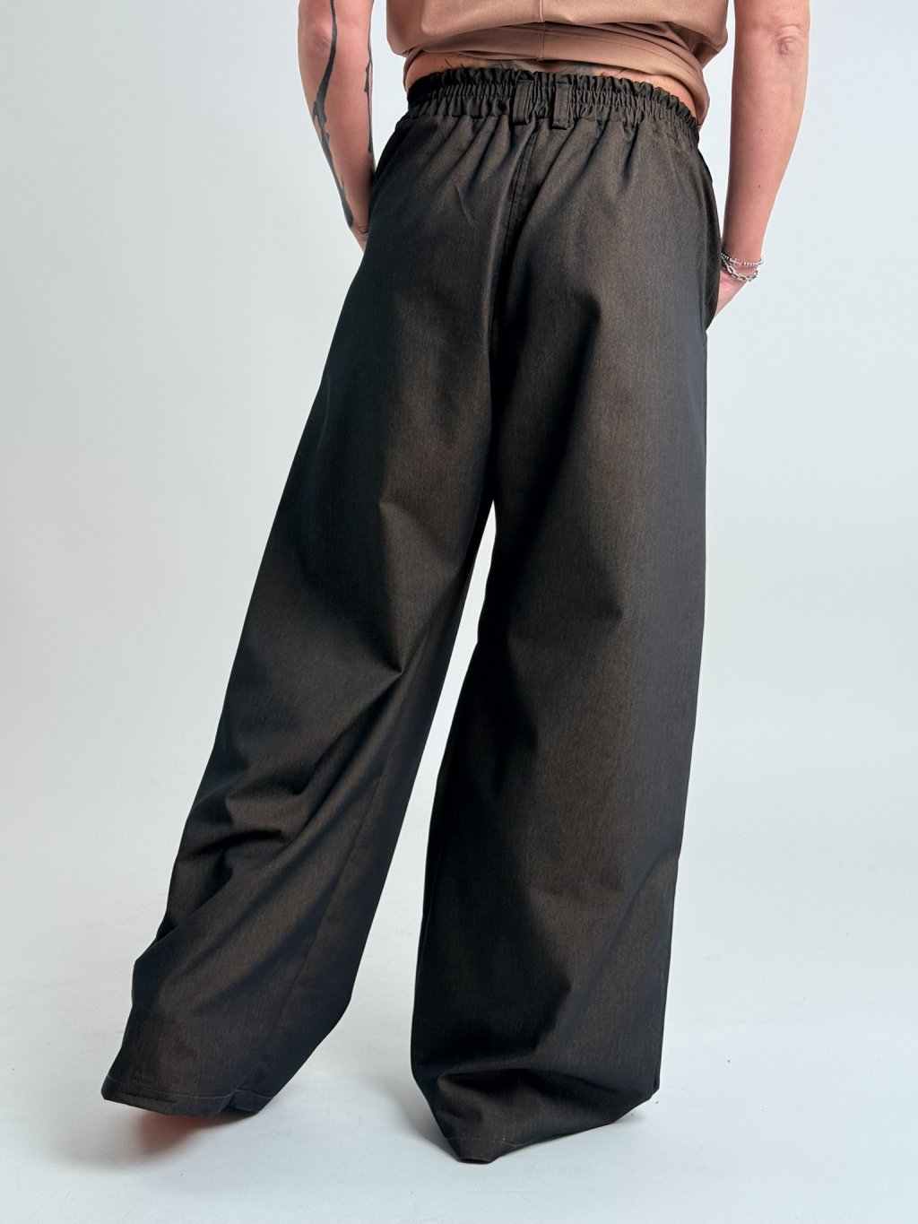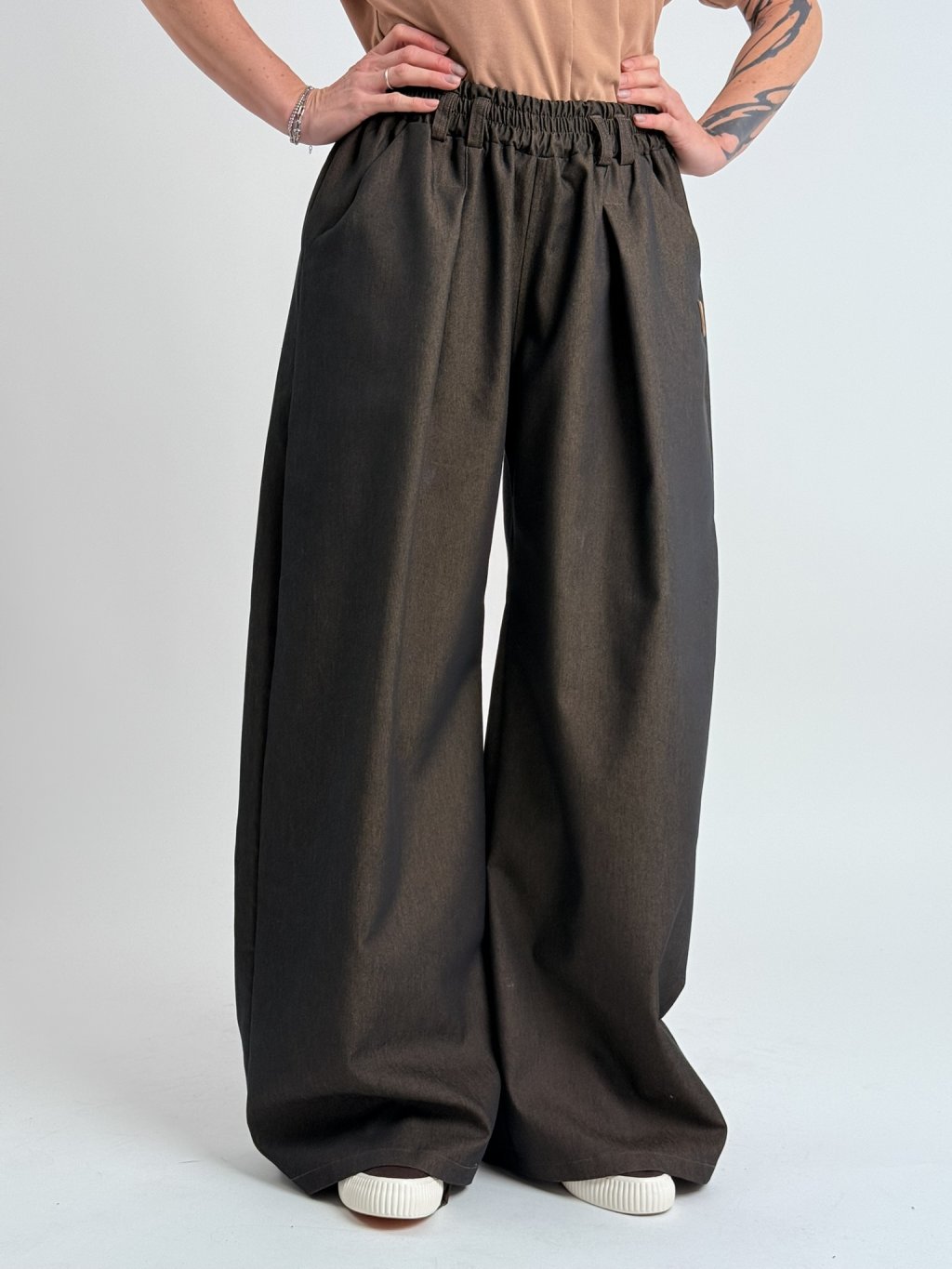 Široké kalhoty v hnědočerné barvě z lehké džínoviny, v zadní části pasu do gumy, vpředu s kapsami a sámky.