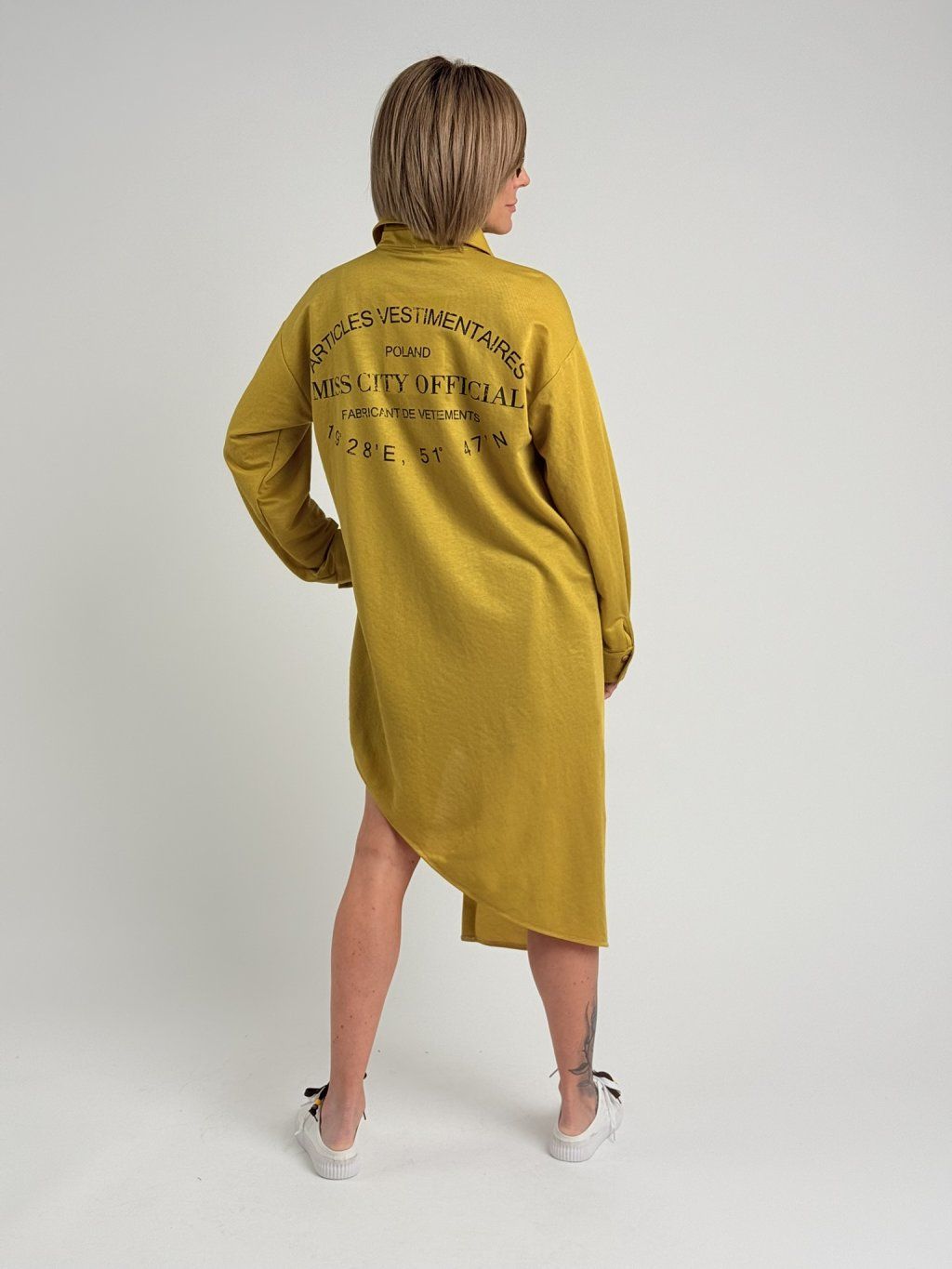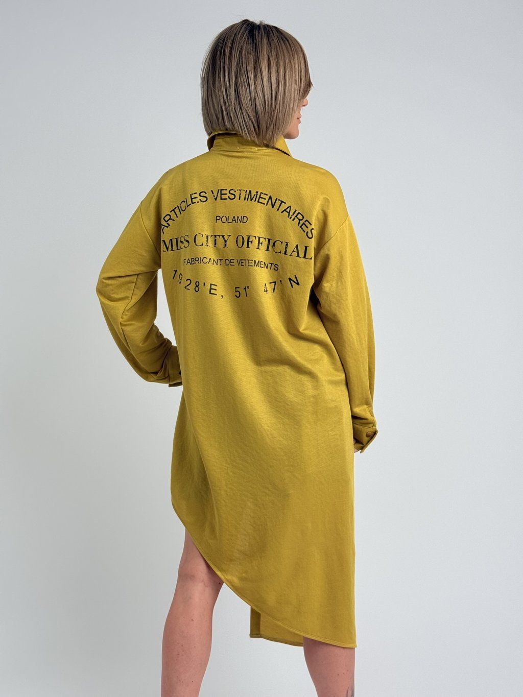 Dokonalá košile s jedním prodlouženým předním dílem a žlutým potiskem na zádech.