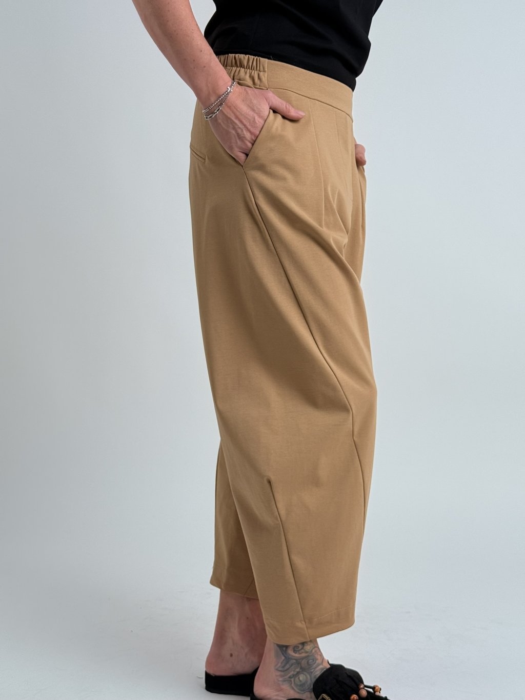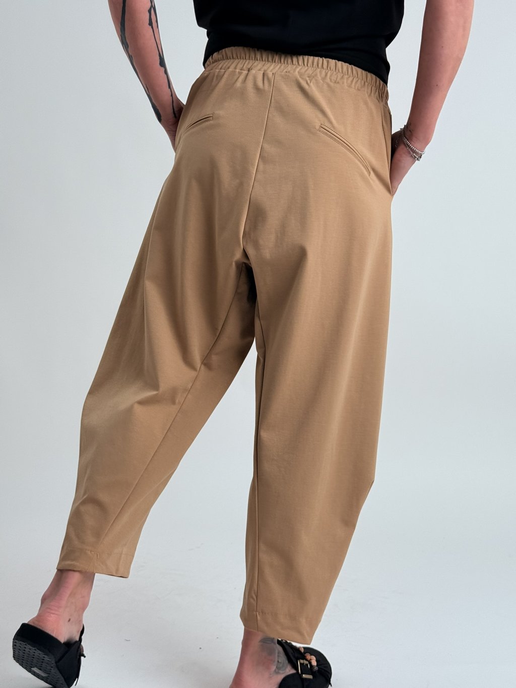 Luxusní kalhoty s gumou v pase, širšími nohavicemi v horní části, dolu se zužujícími. Super střih i materiál.
