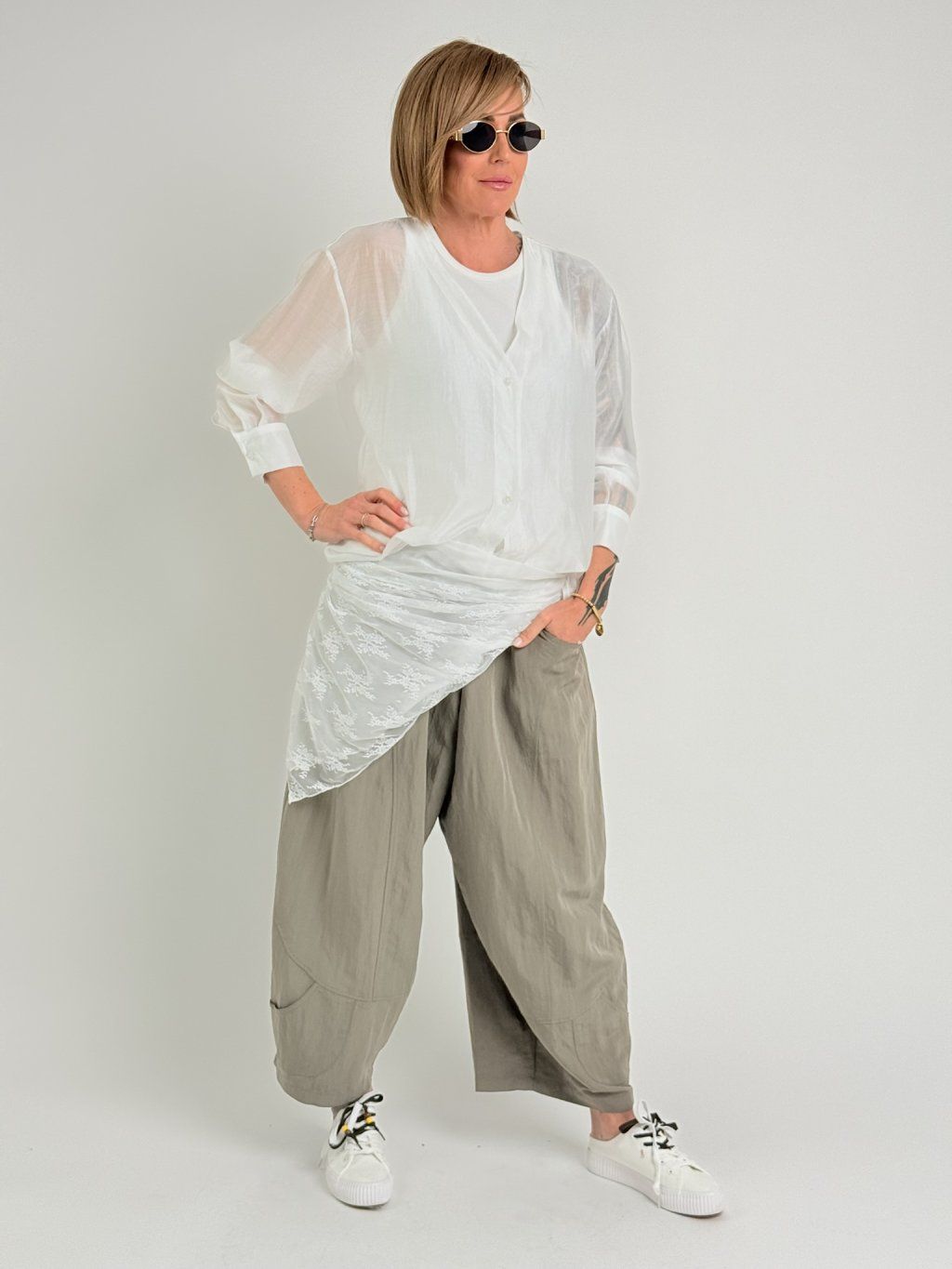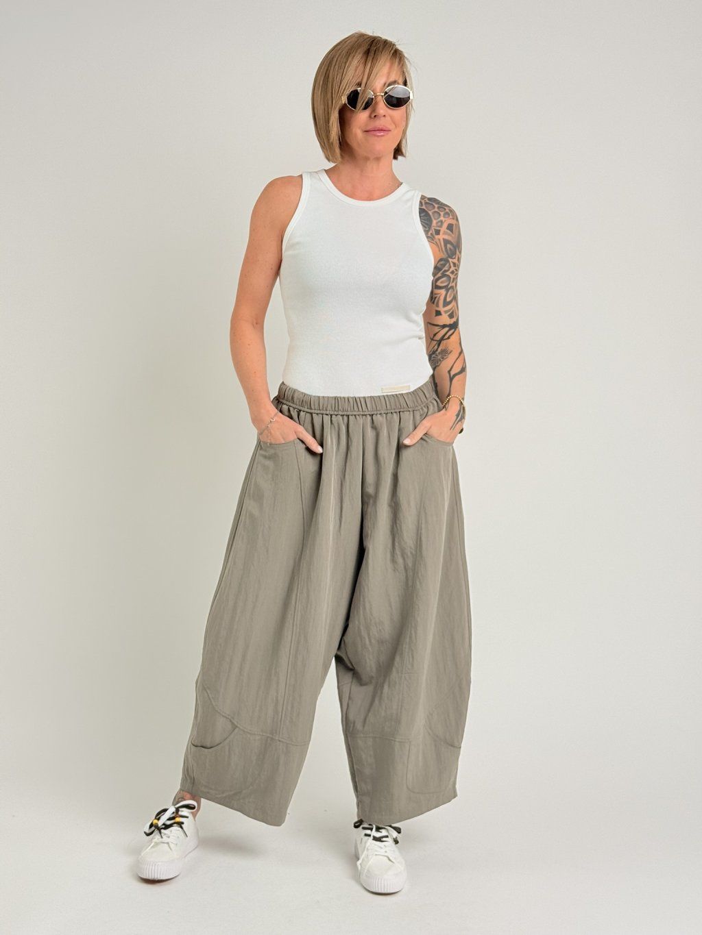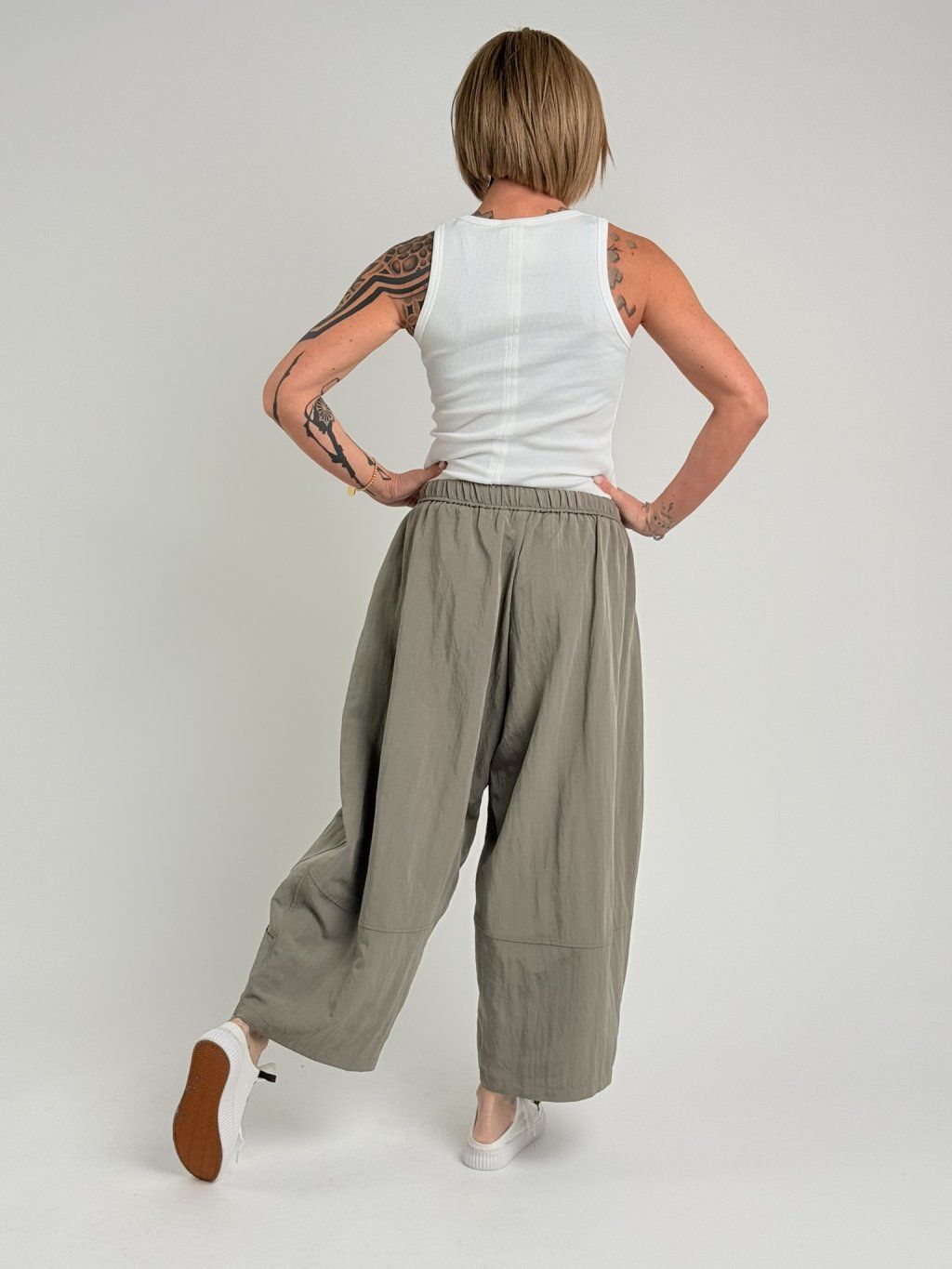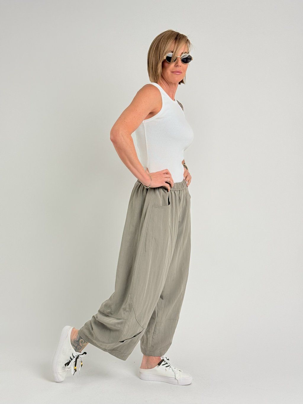 Kalhoty v balonovém střihu, s gumou v pase, štepováním a ozdobnou kapsičkou na nohavicích. Super střih i materiál.