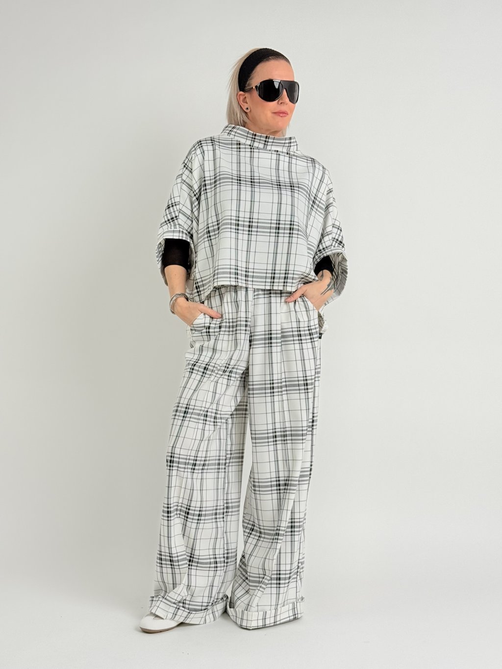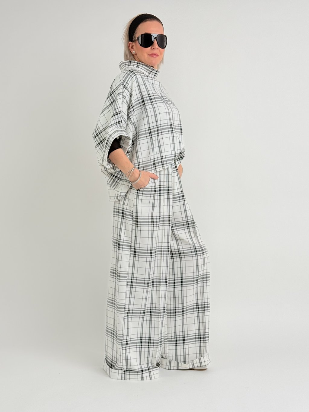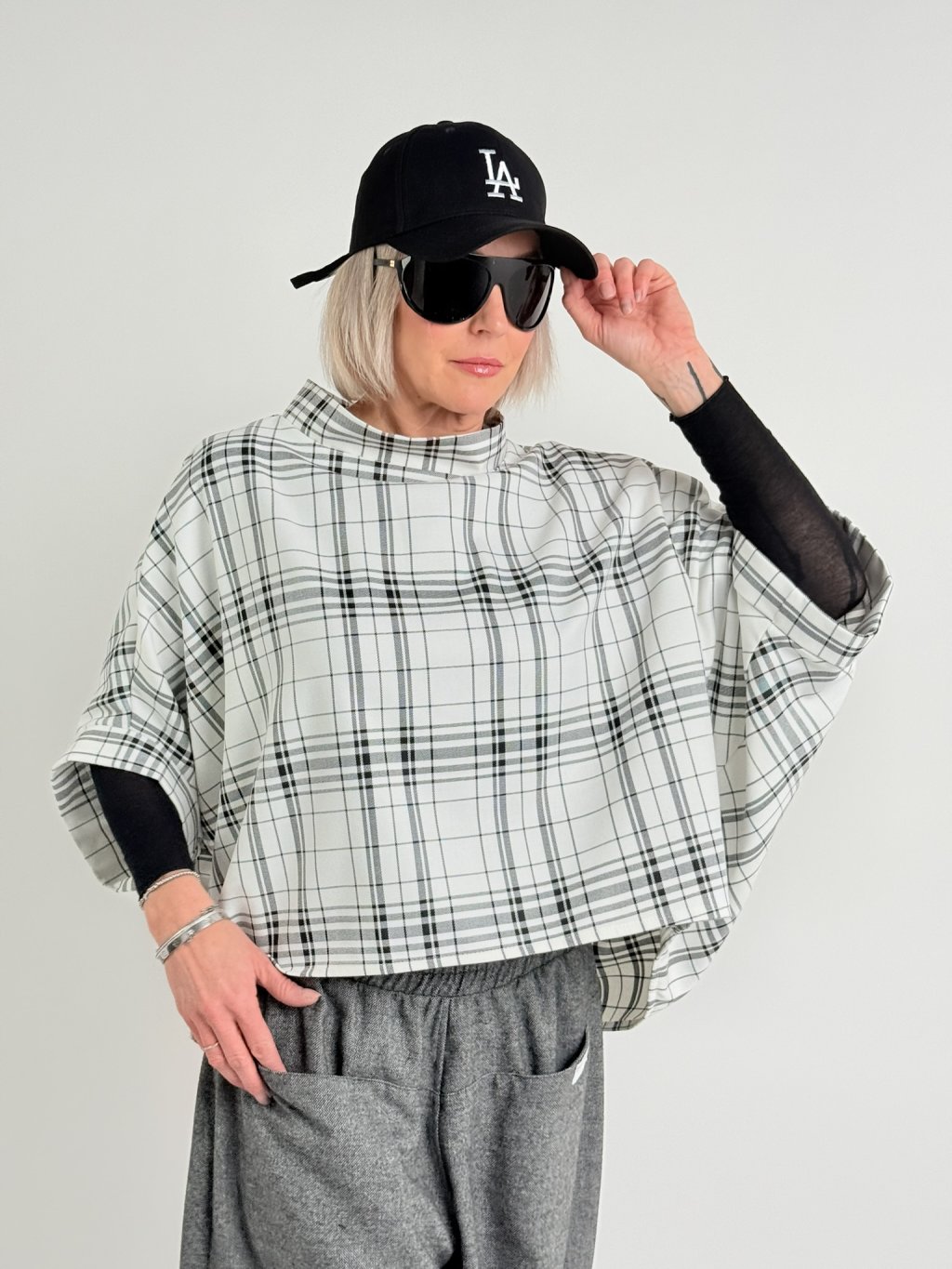 Kostkovaná, bílo-černá tunika v netopýřím střihu s širokým stojáčkem. Vhodná na vrstvení.
