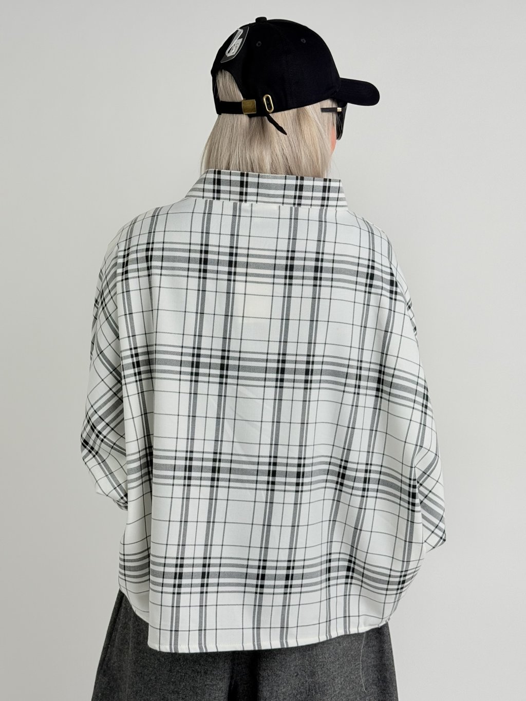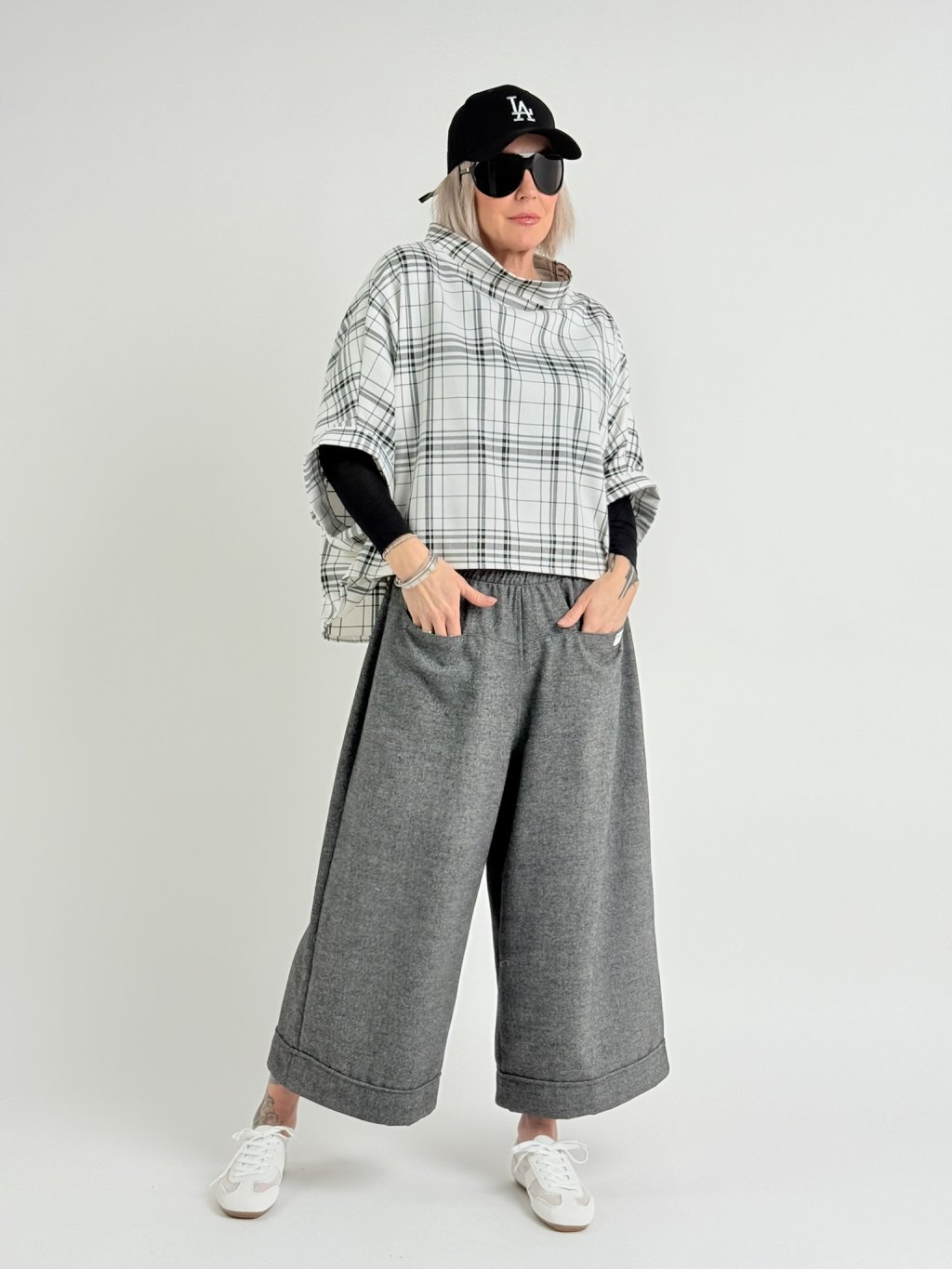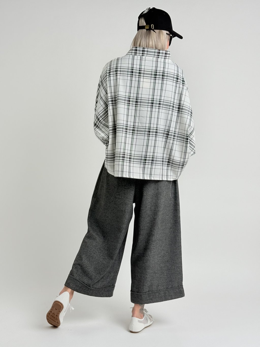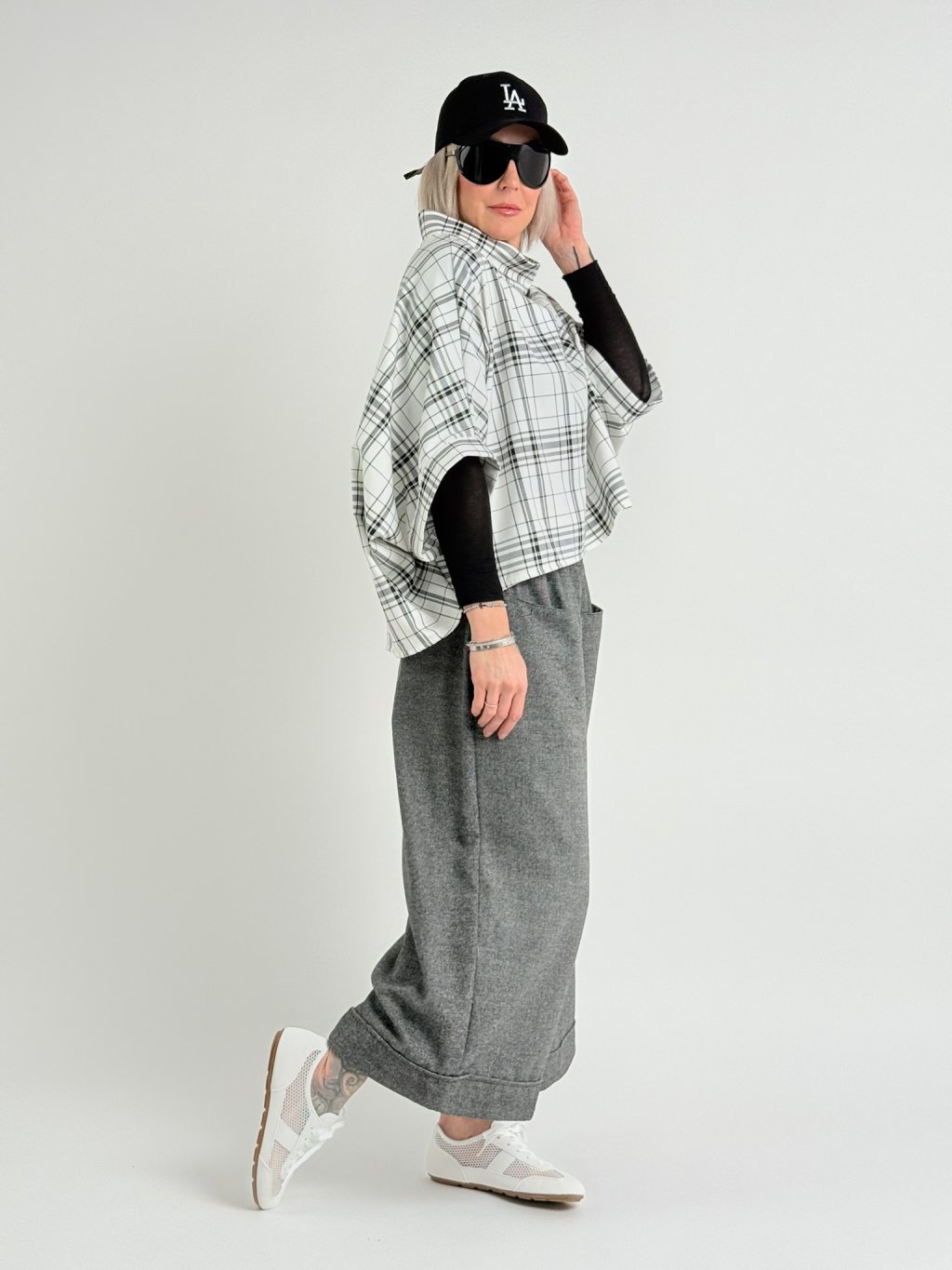 Kostkovaná, bílo-černá tunika v netopýřím střihu s širokým stojáčkem. Vhodná na vrstvení.