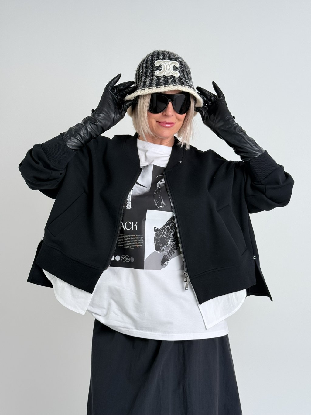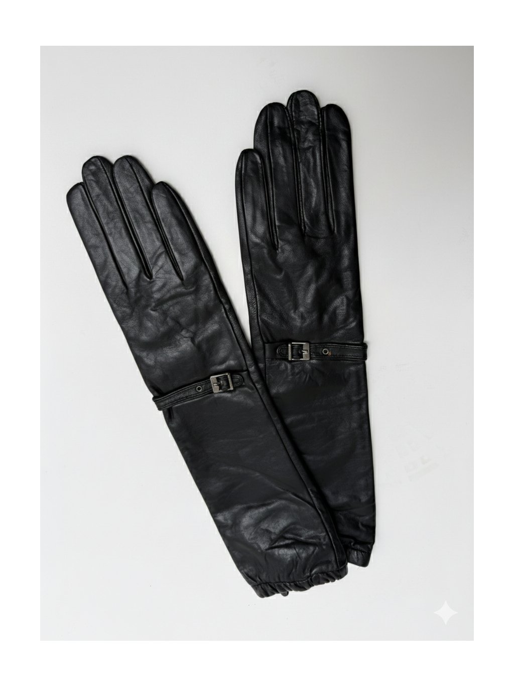 Vyšší, černé, kožené rukavice s gumičkou na konci a páskem s malou, ozdobnou sponou v místě zápěstí. Výška od prostředního prstu ke kraji je 39 cm. Velikost S, M.