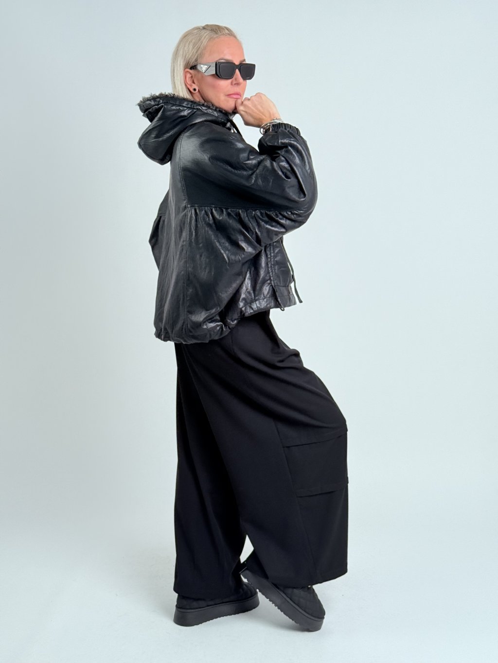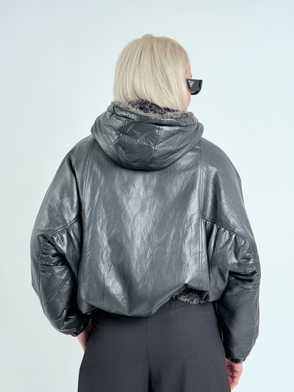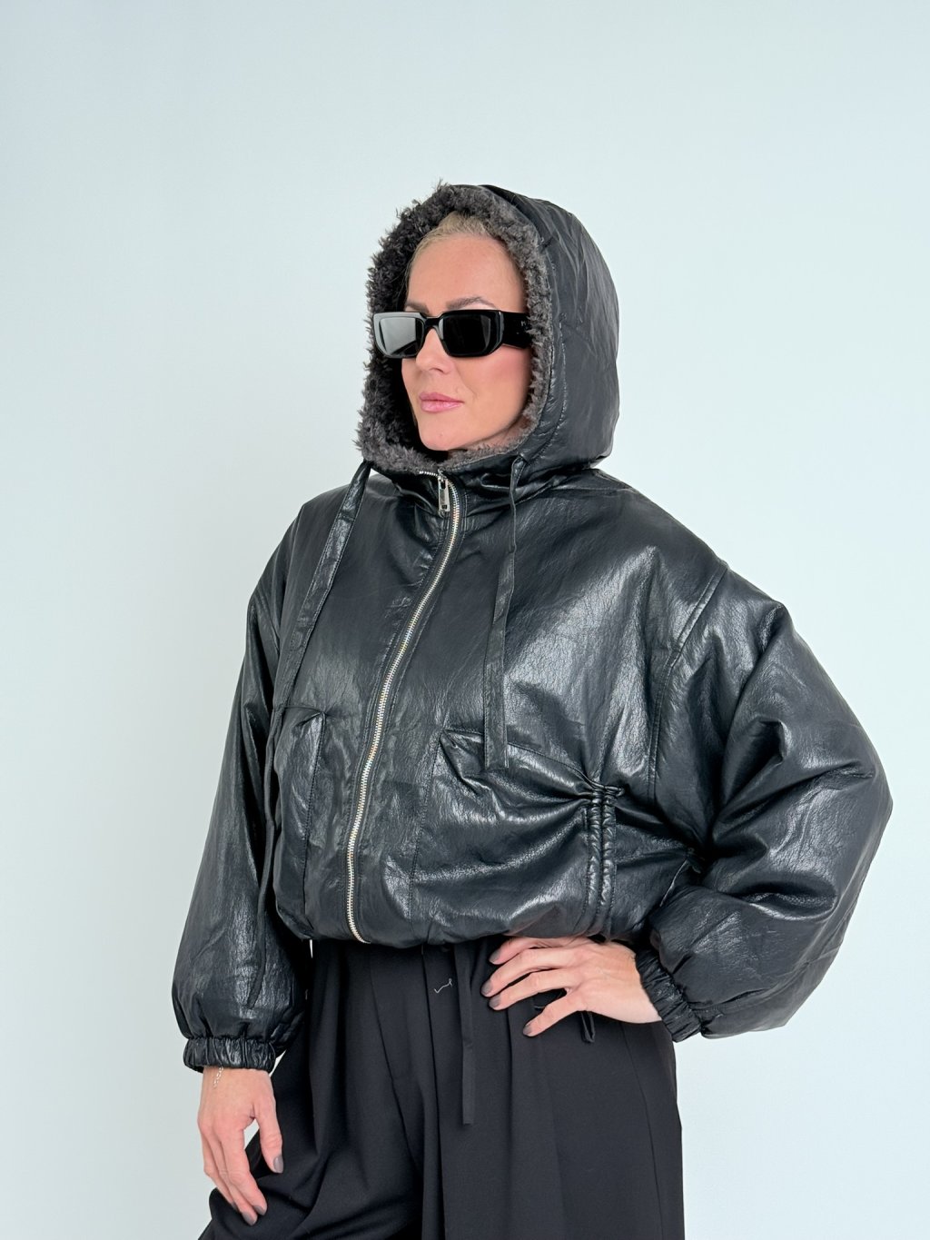 Super, oversize, koženková bunda s kapucí, celá podšitá umělou kožešinou, se zapínáním na zip, v pase s možností stažení, na zádech lehce nařasená. Naprosto dokonalá.