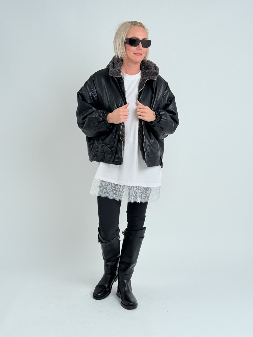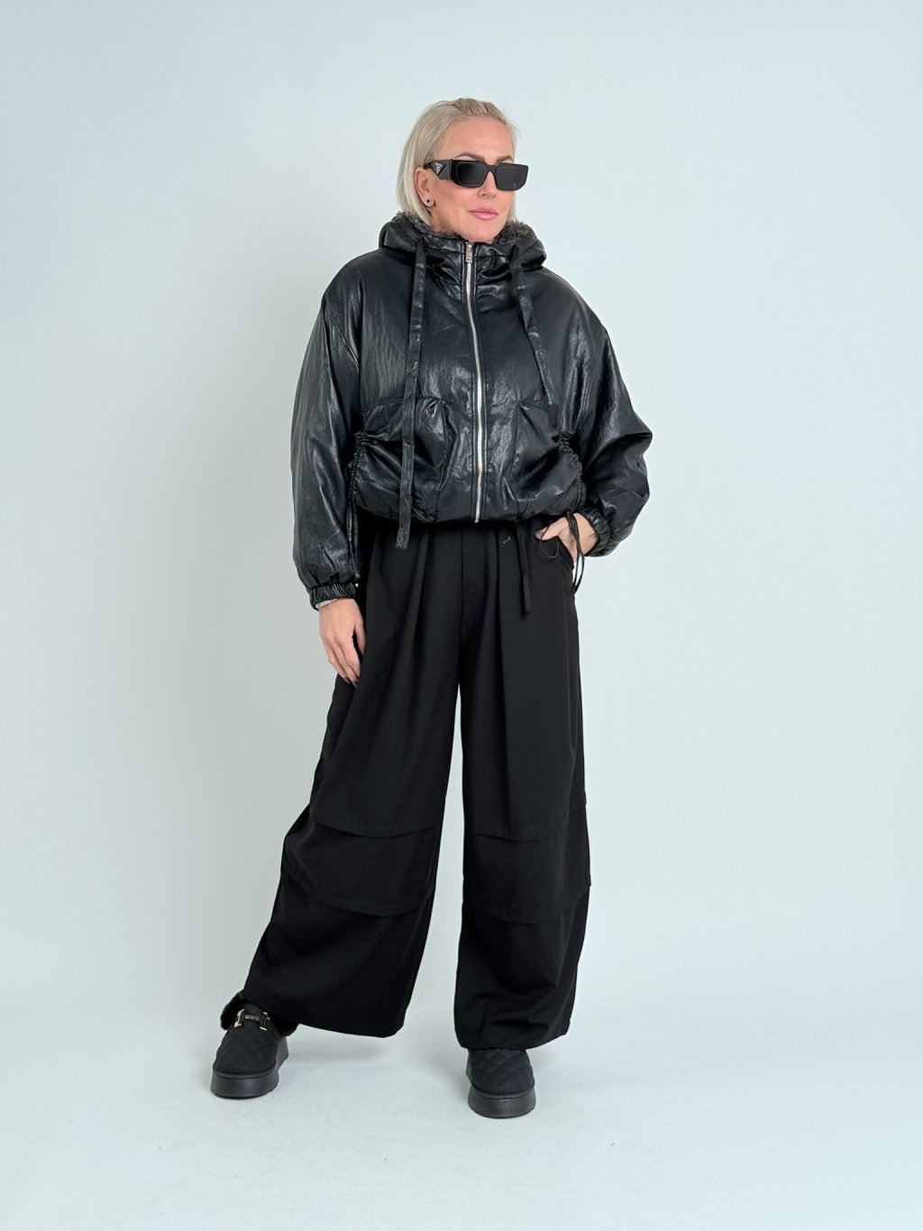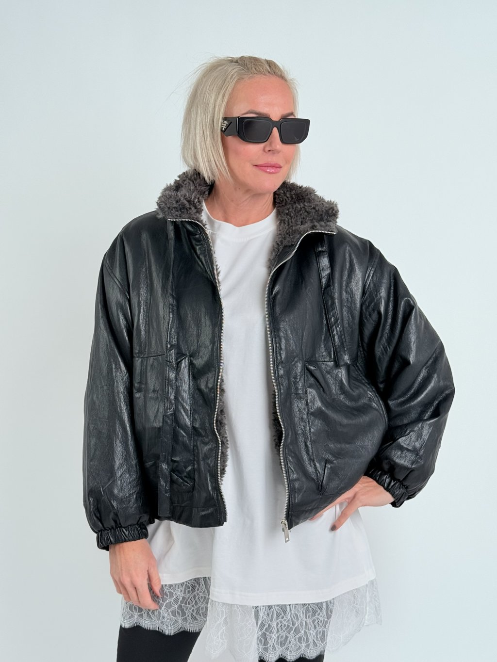 Super, oversize, koženková bunda s kapucí, celá podšitá umělou kožešinou, se zapínáním na zip, v pase s možností stažení, na zádech lehce nařasená. Naprosto dokonalá.