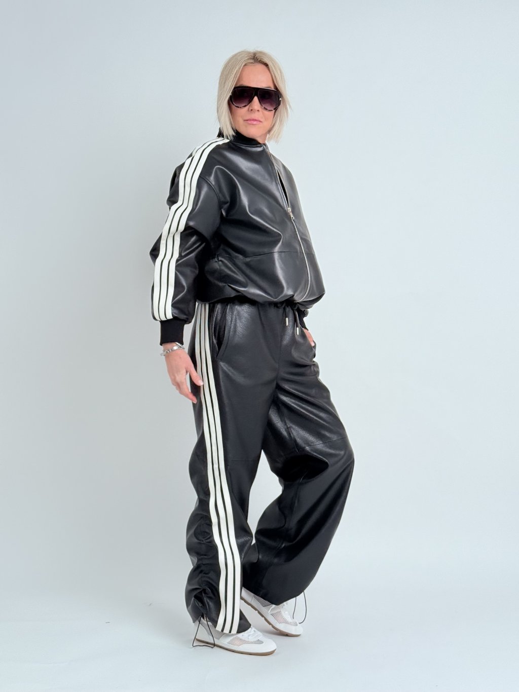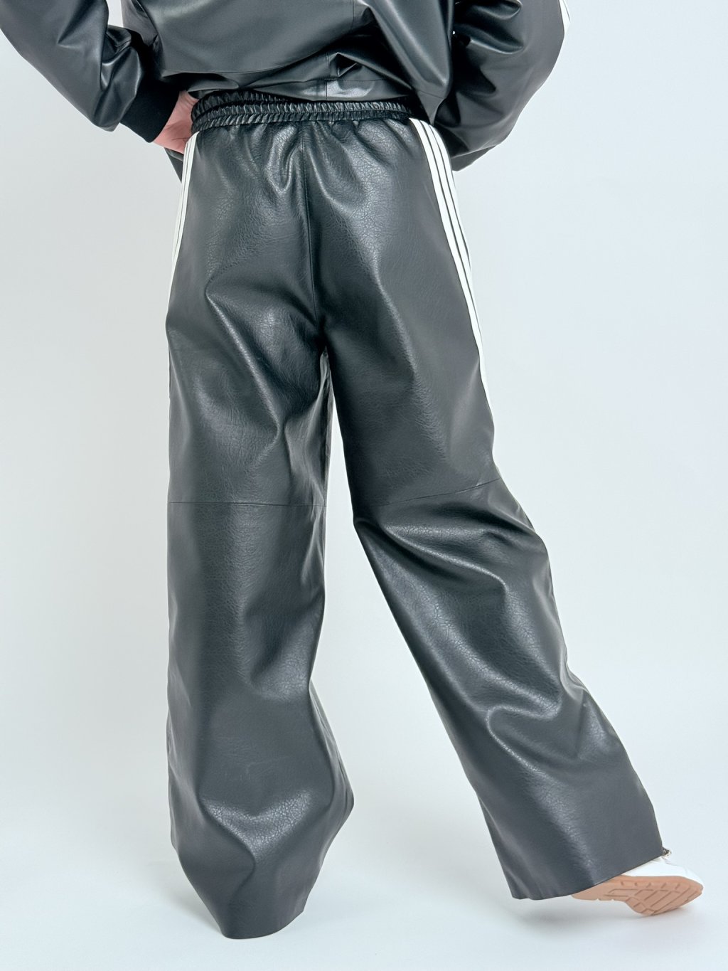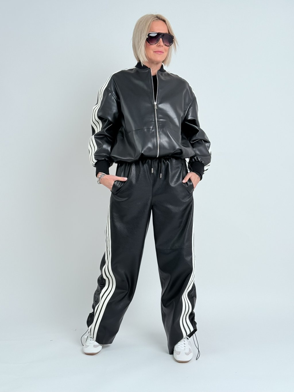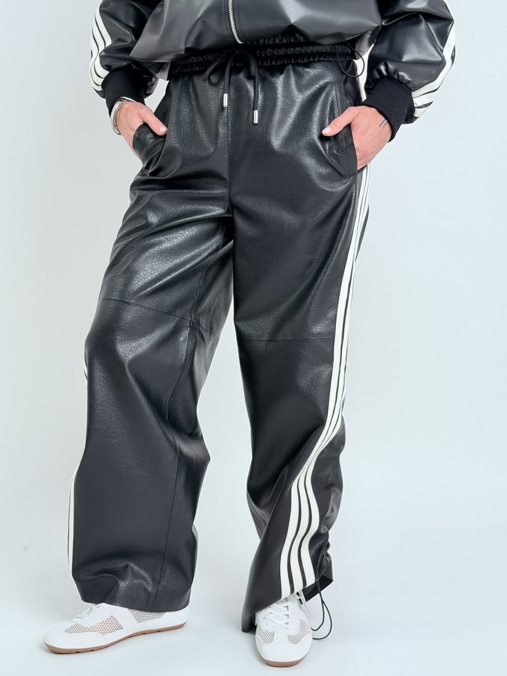 Zajímavě řešené koženkové kalhoty uvnitř s podšívkou, s lampasy, po straně, na konci nohavic i v pase na stažení.