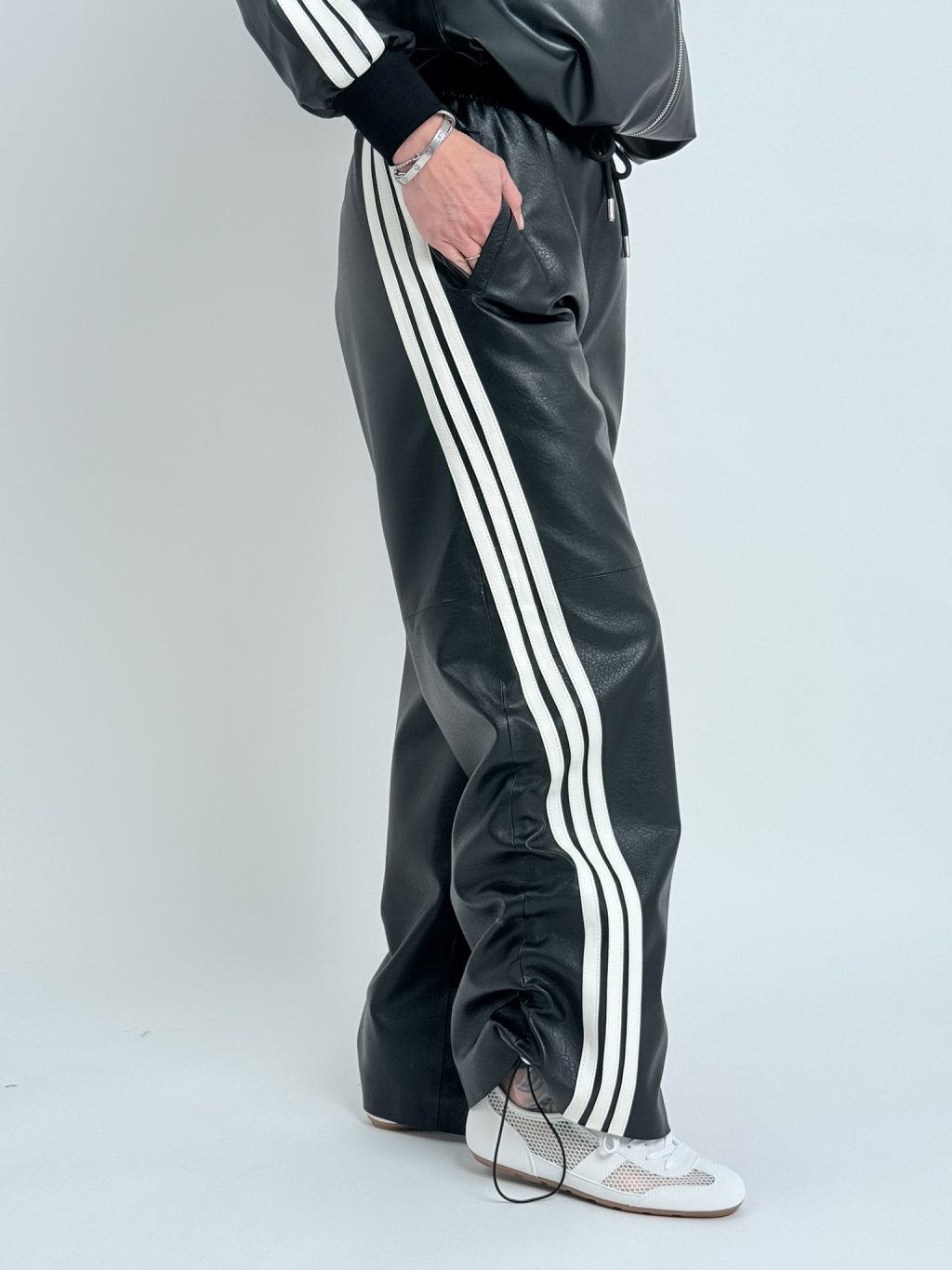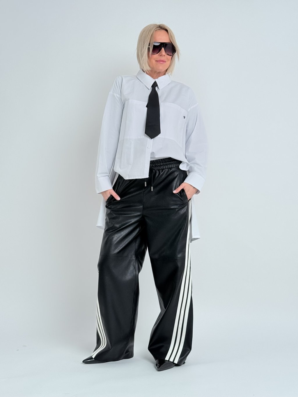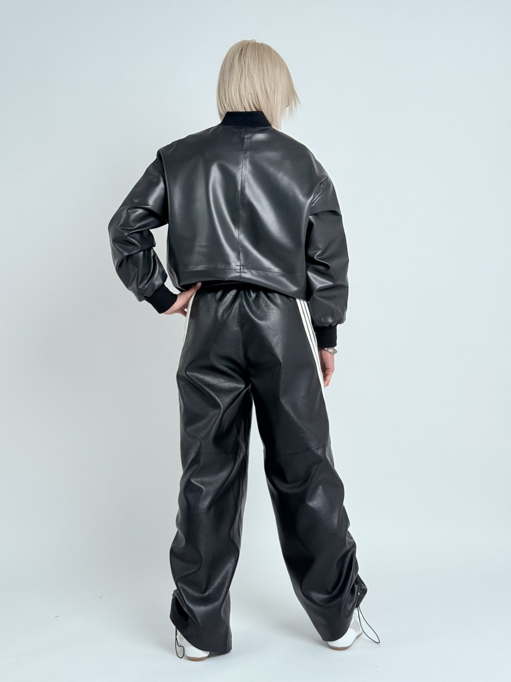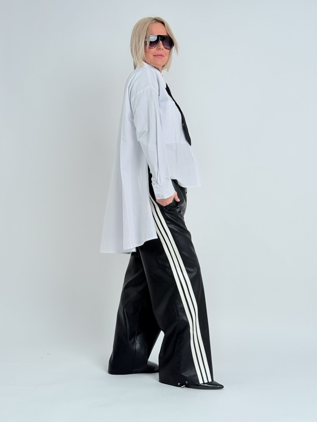 Zajímavě řešené koženkové kalhoty uvnitř s podšívkou, s lampasy, po straně, na konci nohavic i v pase na stažení.