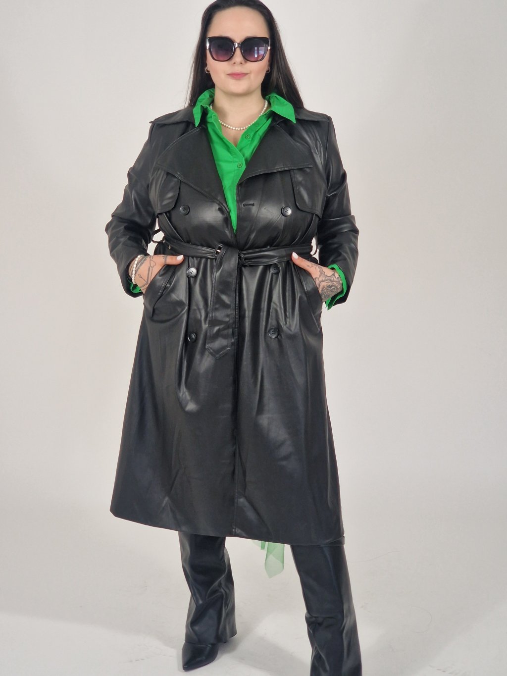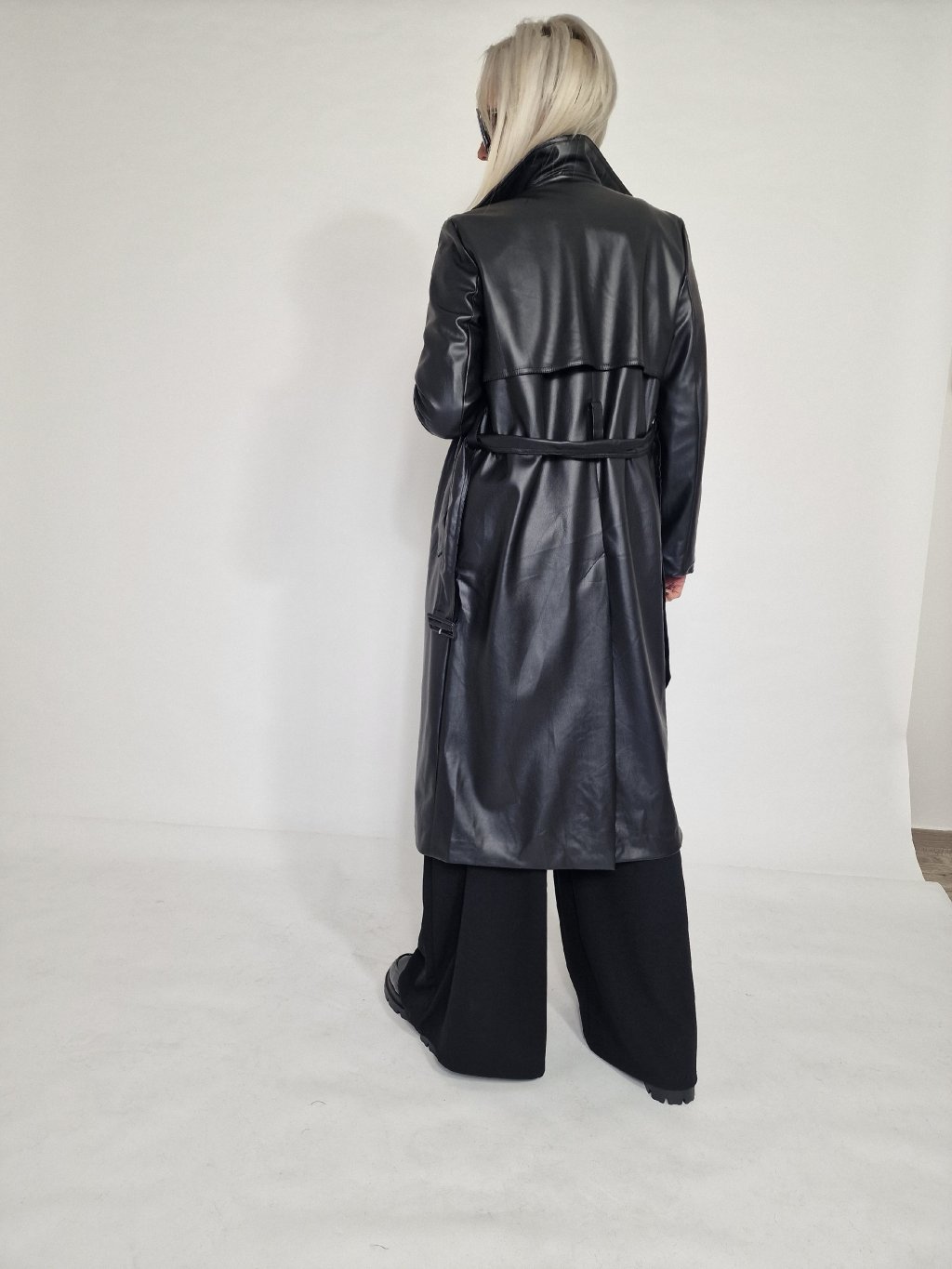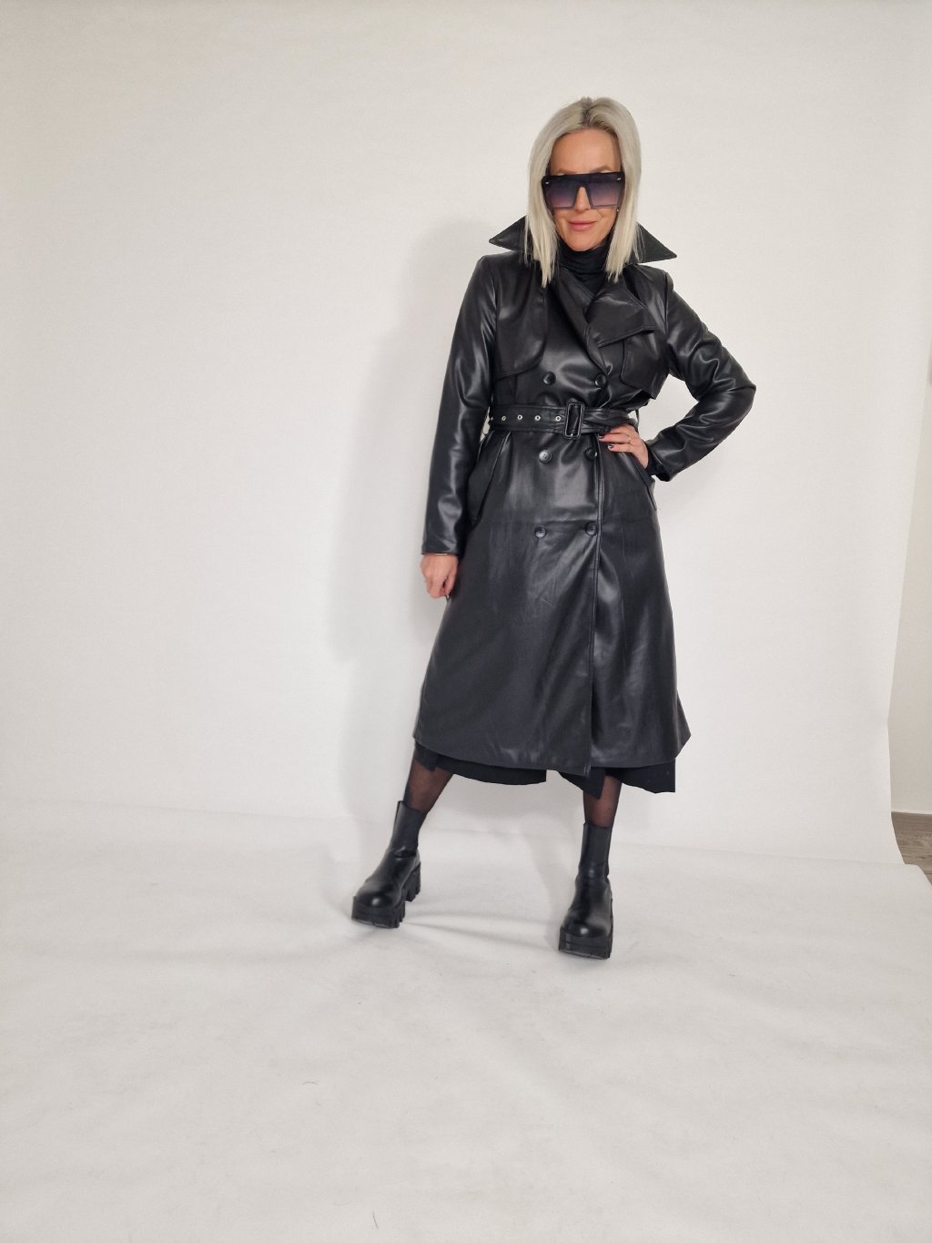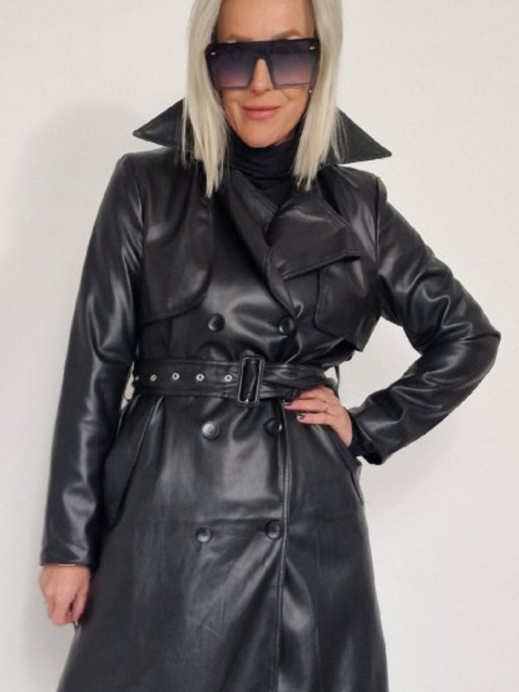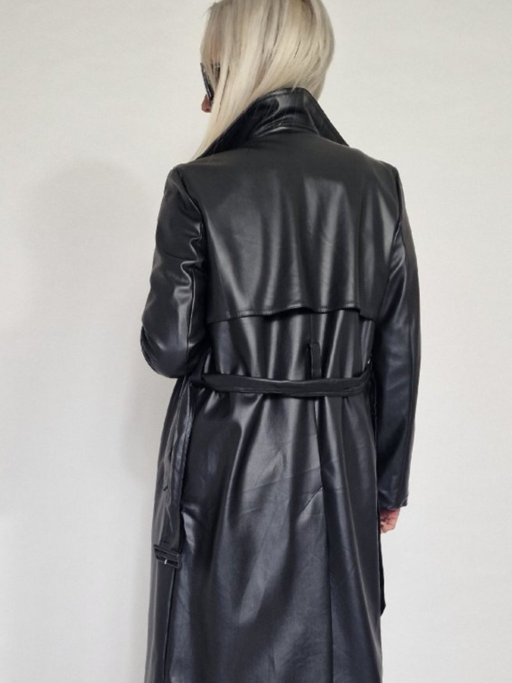 Skvělý, koženkový trenčkot s podšívkou, zapínáním na knoflíky a páskem. Kabát má téměř celoroční využití, ve vetší zimě ho lze doplnit kratší vestou nebo krátkým kožíškem. Je velmi lehký. MĚŘTE, KABÁTY JSOU VĚTŠÍ!!!!