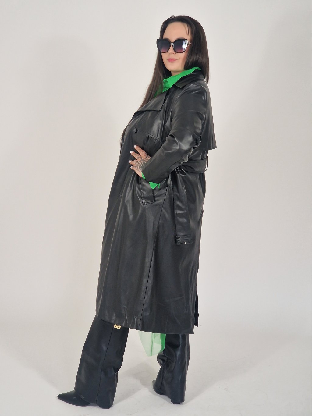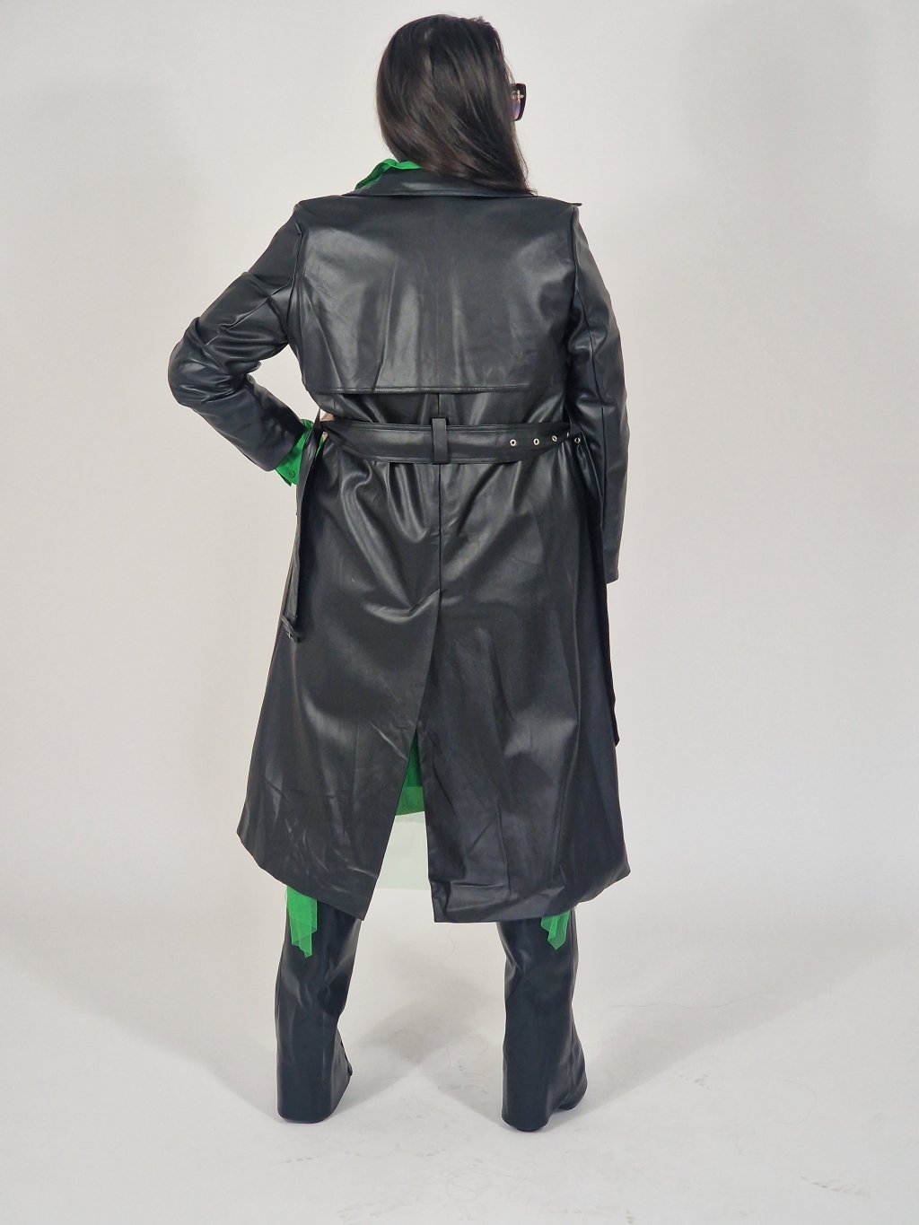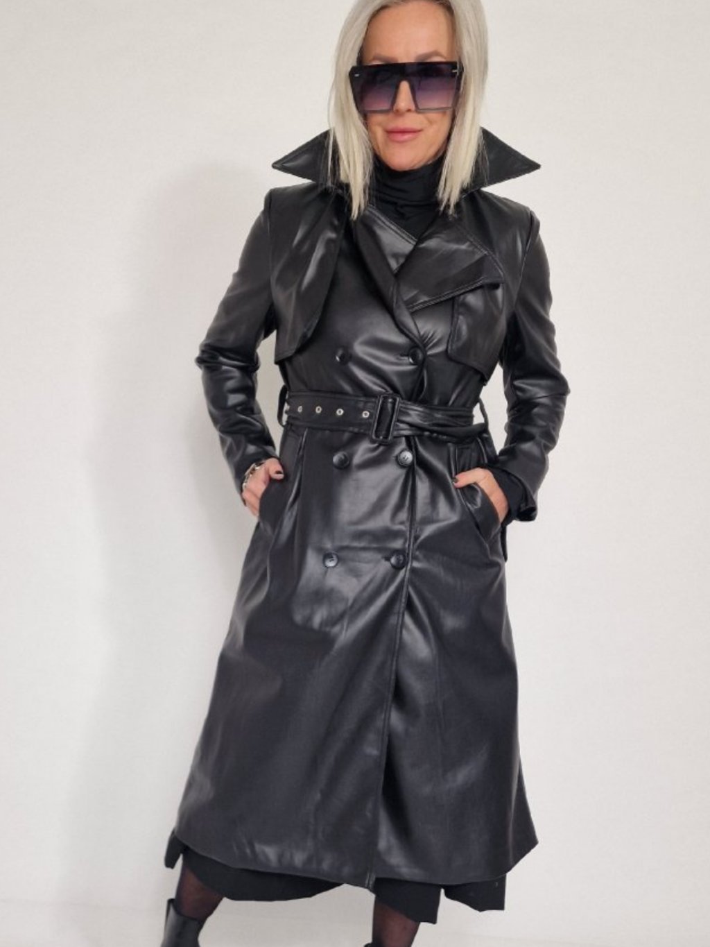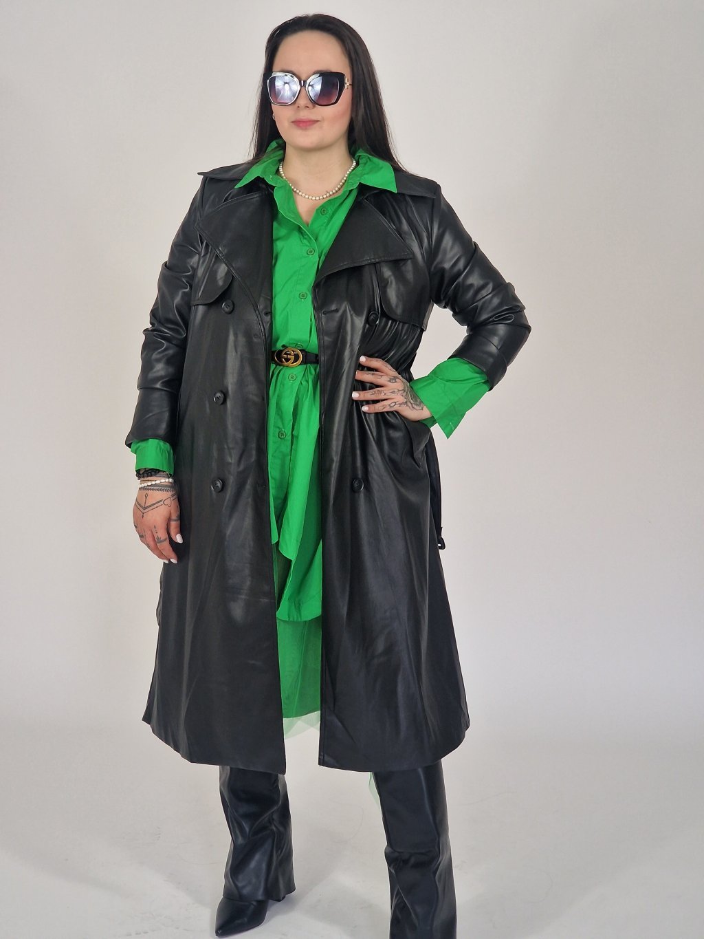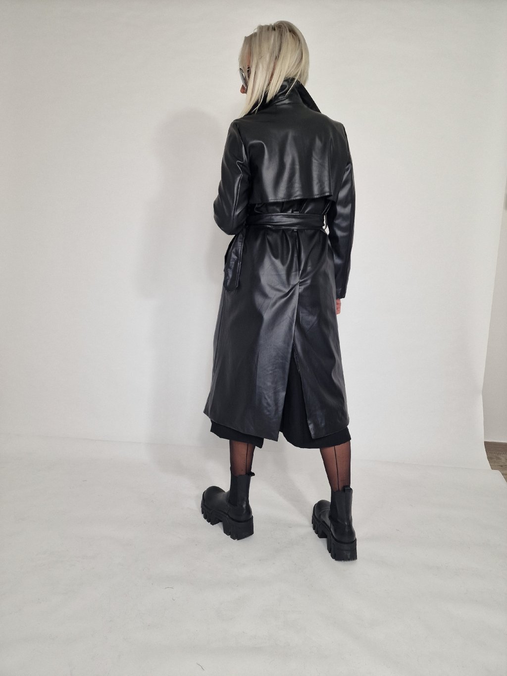 Skvělý, koženkový trenčkot s podšívkou, zapínáním na knoflíky a páskem. Kabát má téměř celoroční využití, ve vetší zimě ho lze doplnit kratší vestou nebo krátkým kožíškem. Je velmi lehký. MĚŘTE, KABÁTY JSOU VĚTŠÍ!!!!