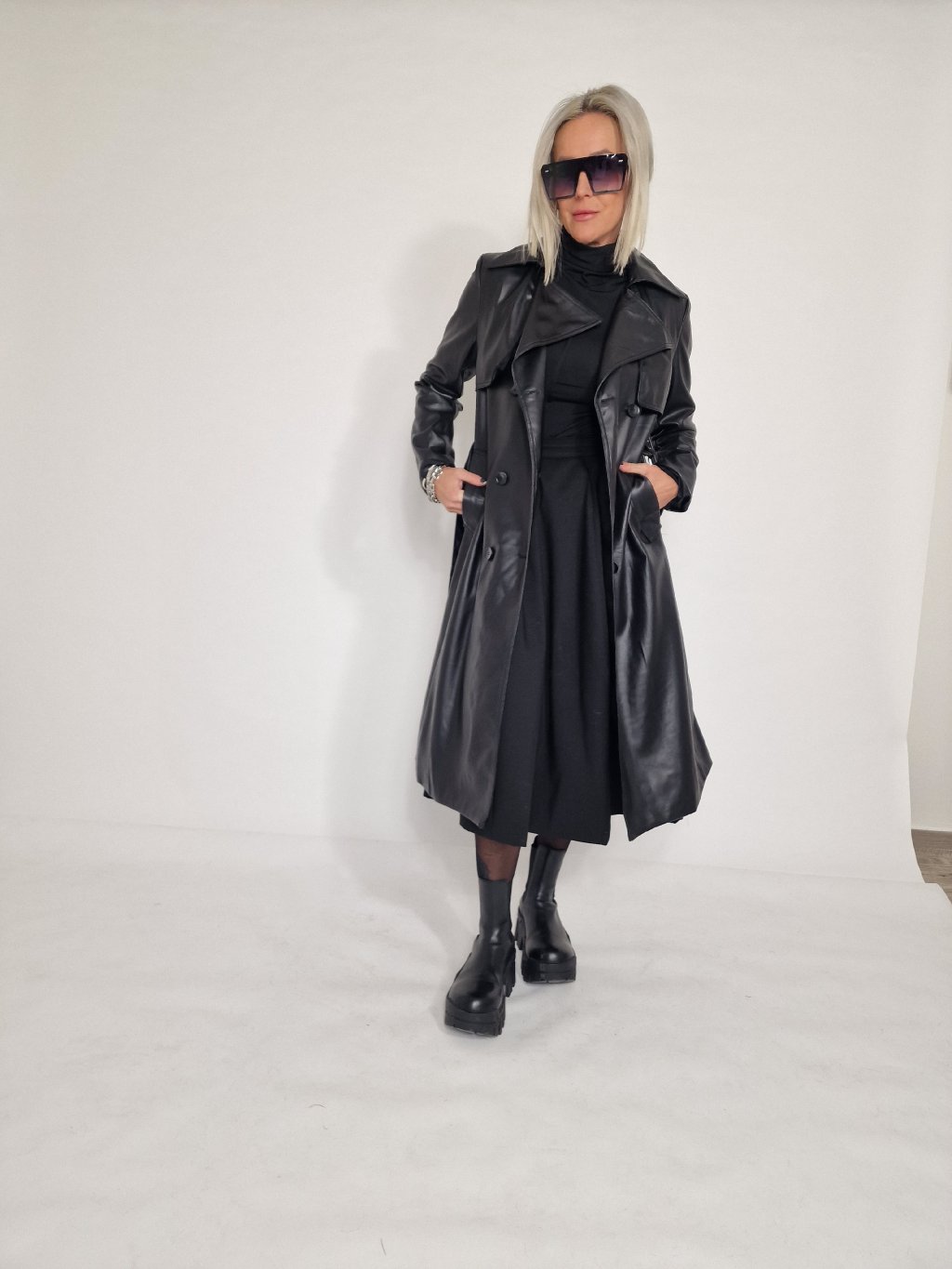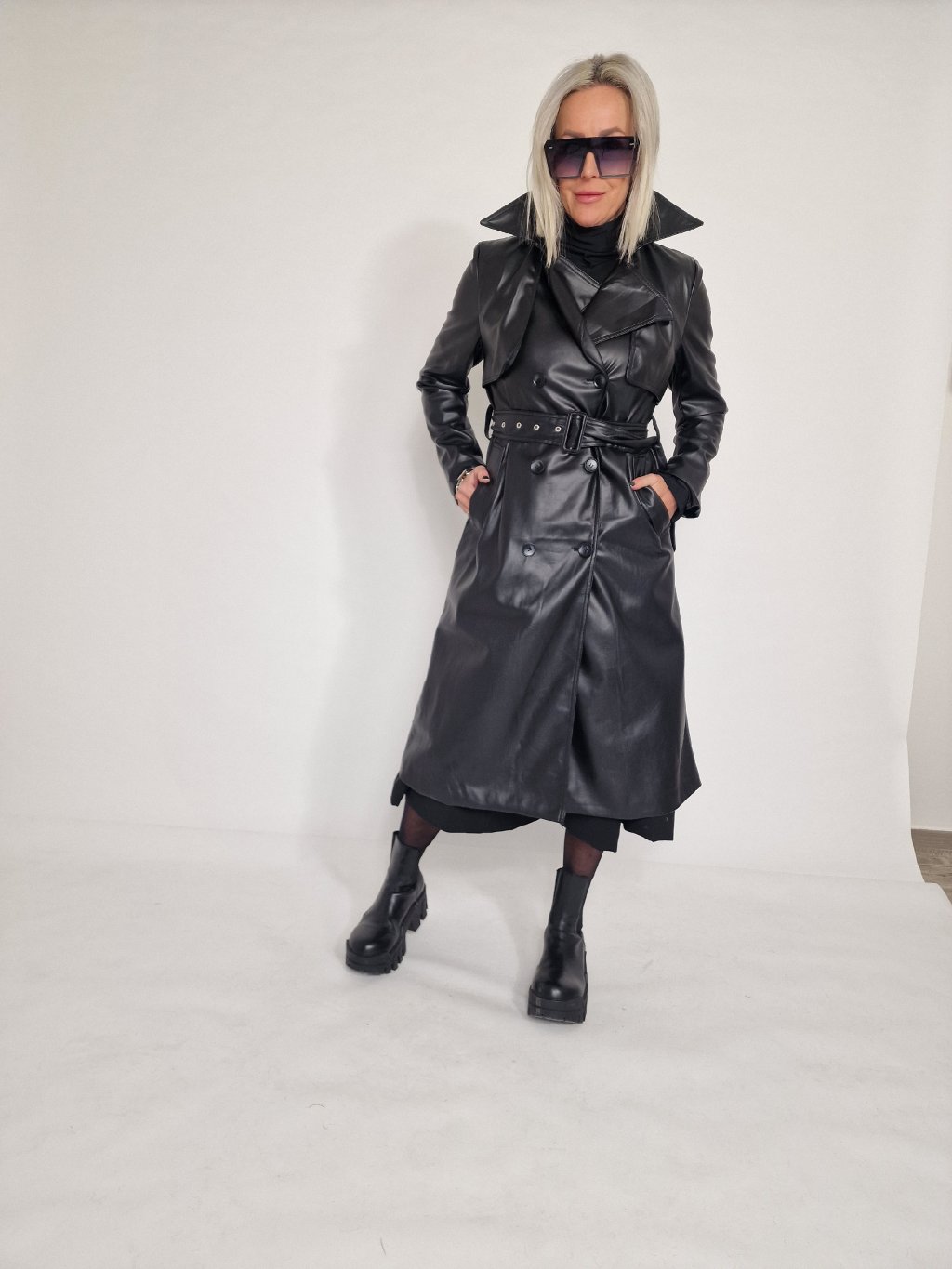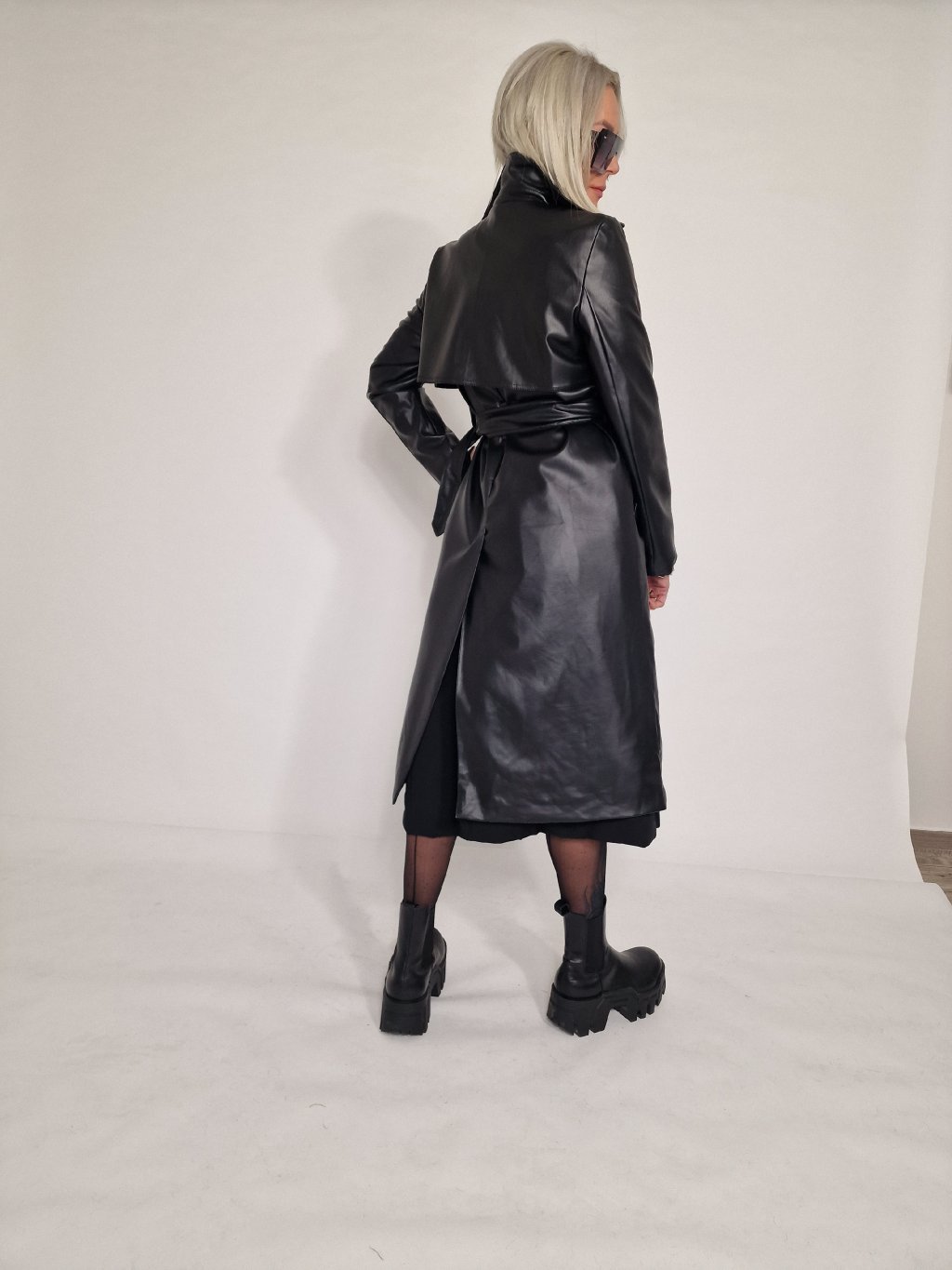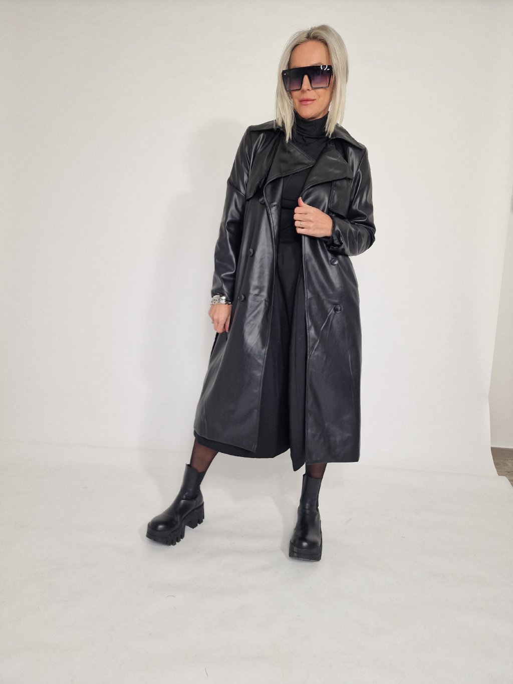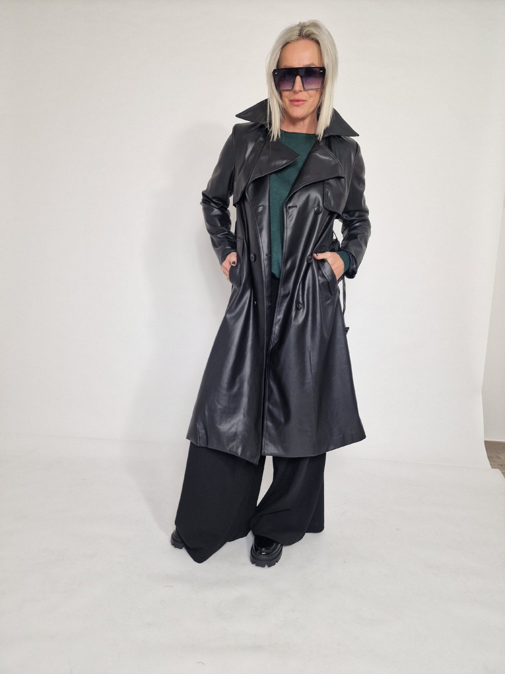 Skvělý, koženkový trenčkot s podšívkou, zapínáním na knoflíky a páskem. Kabát má téměř celoroční využití, ve vetší zimě ho lze doplnit kratší vestou nebo krátkým kožíškem. Je velmi lehký. MĚŘTE, KABÁTY JSOU VĚTŠÍ!!!!