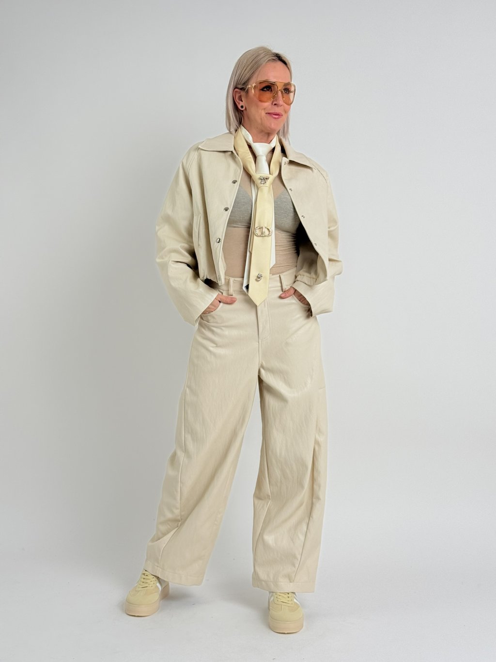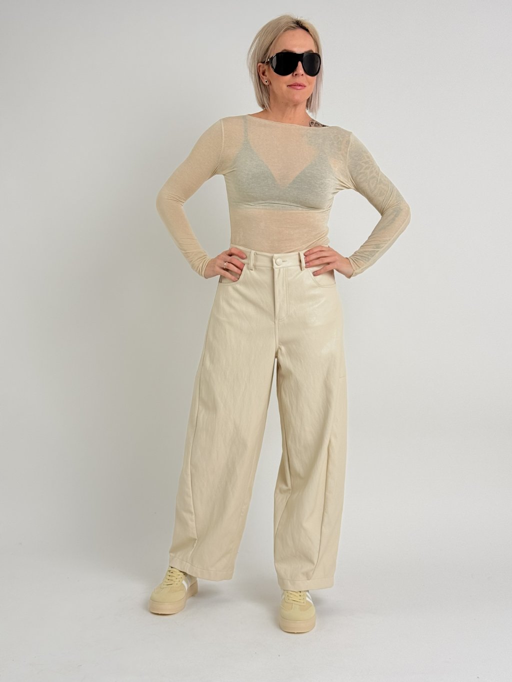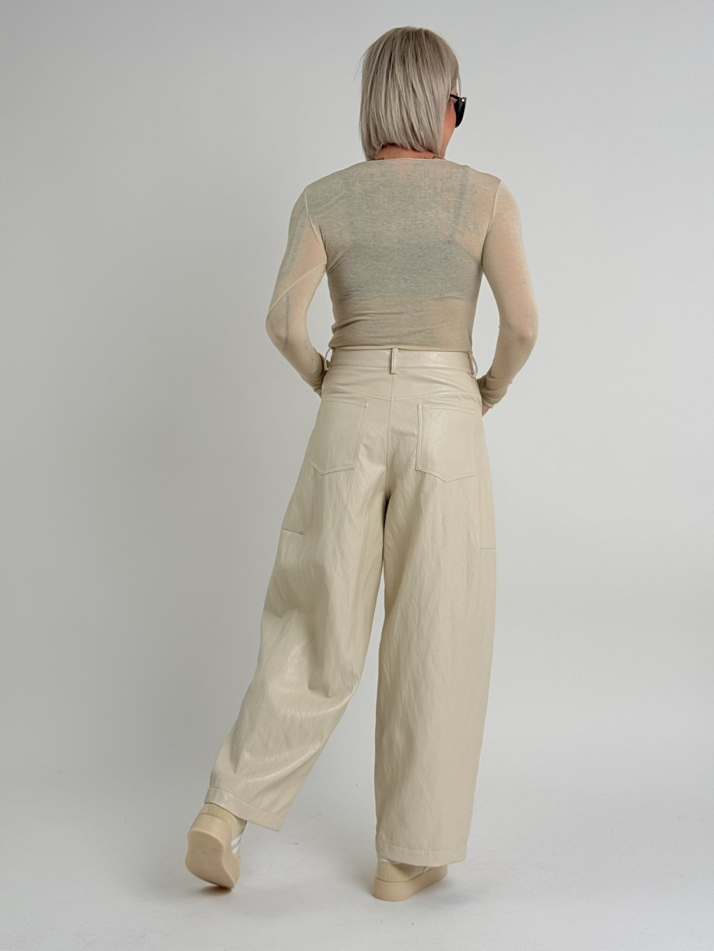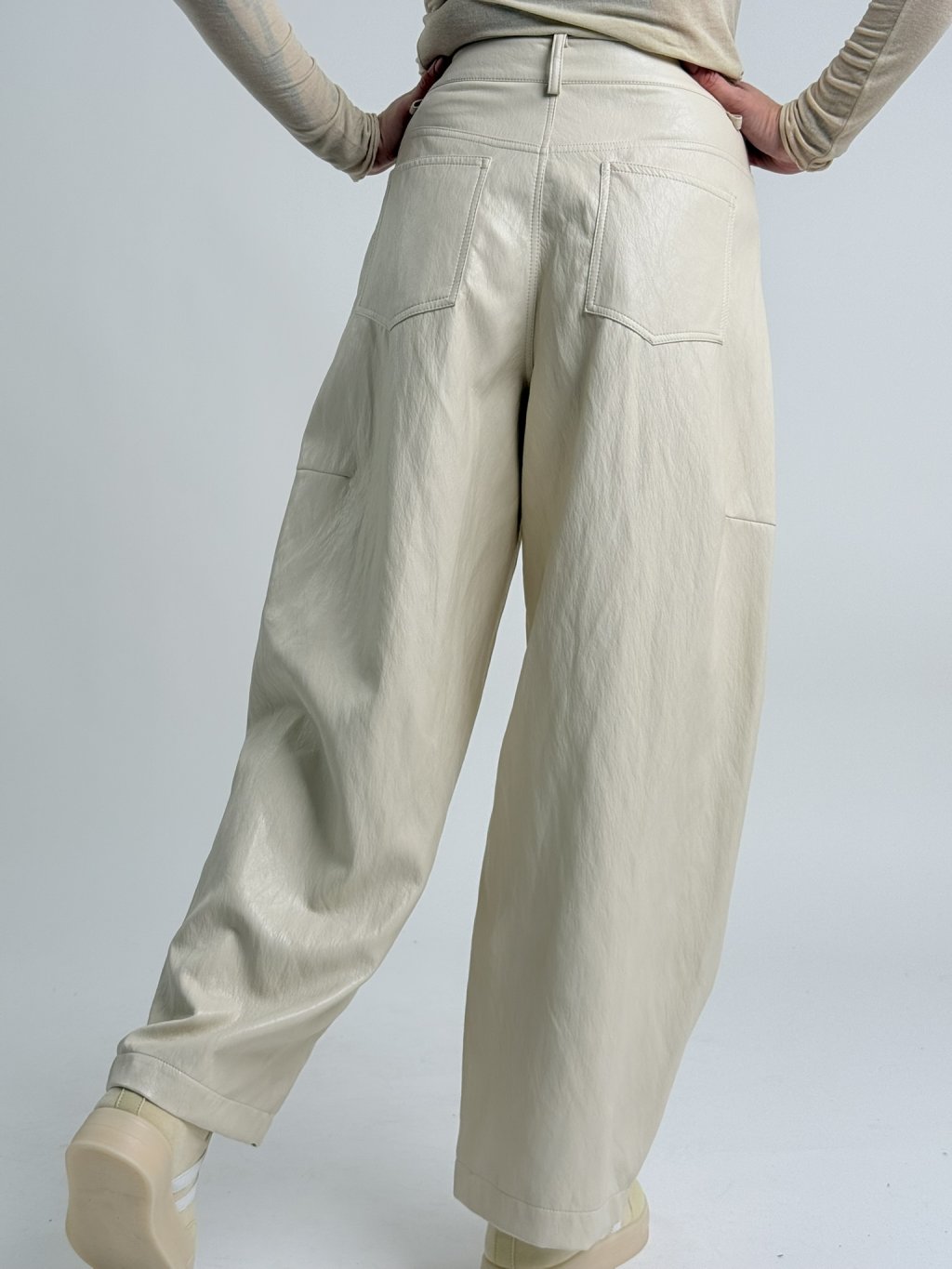 Jemné, koženkové kalhoty s podšívkou, v balonovém střihu, s kapsami, zapínáním na zip a knoflík a poutky na pásek.