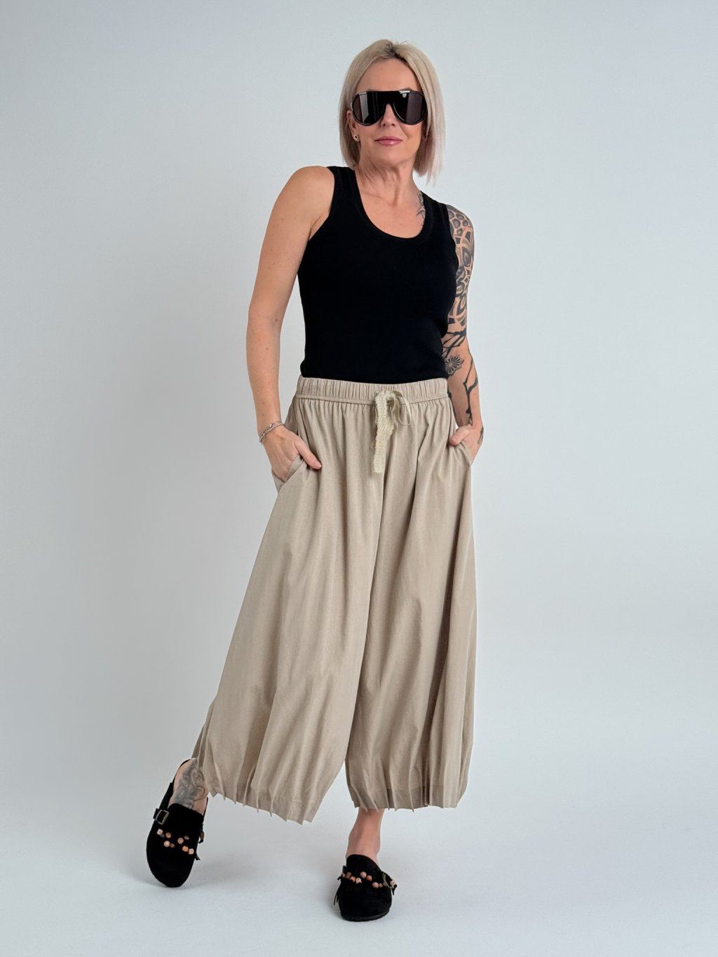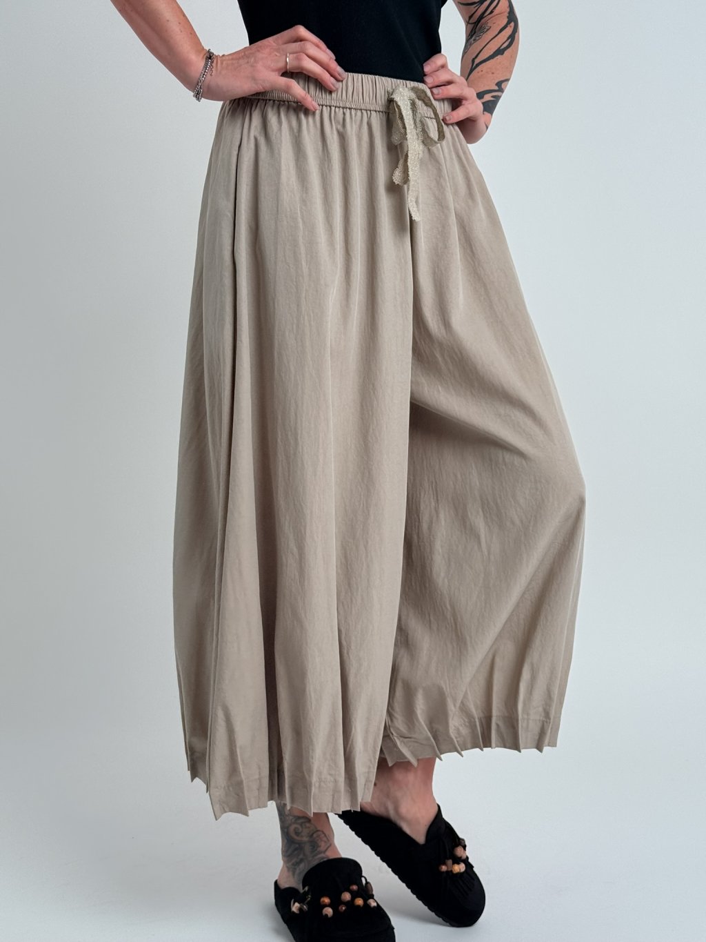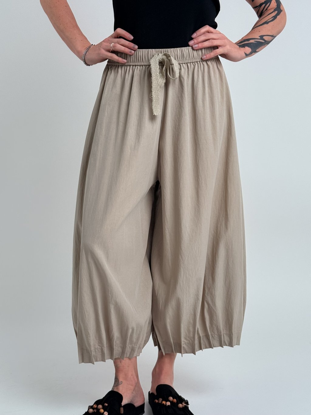 Nádherné, nadčasové, volné kalhoty, v pase do gumy a nohavice zakončené ozdobnými sámky.