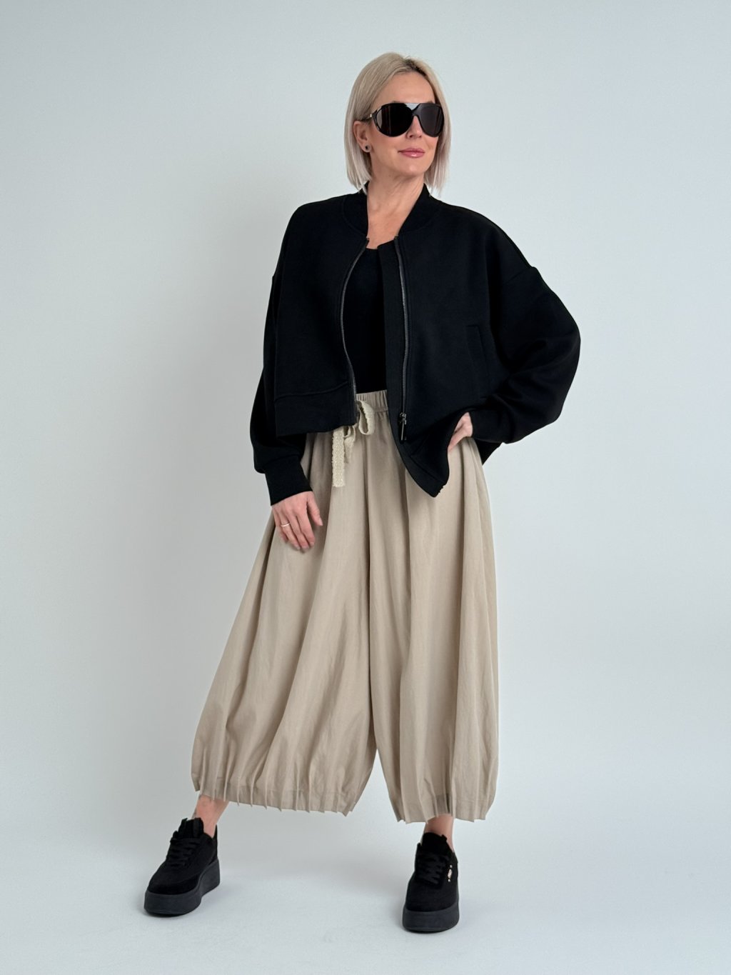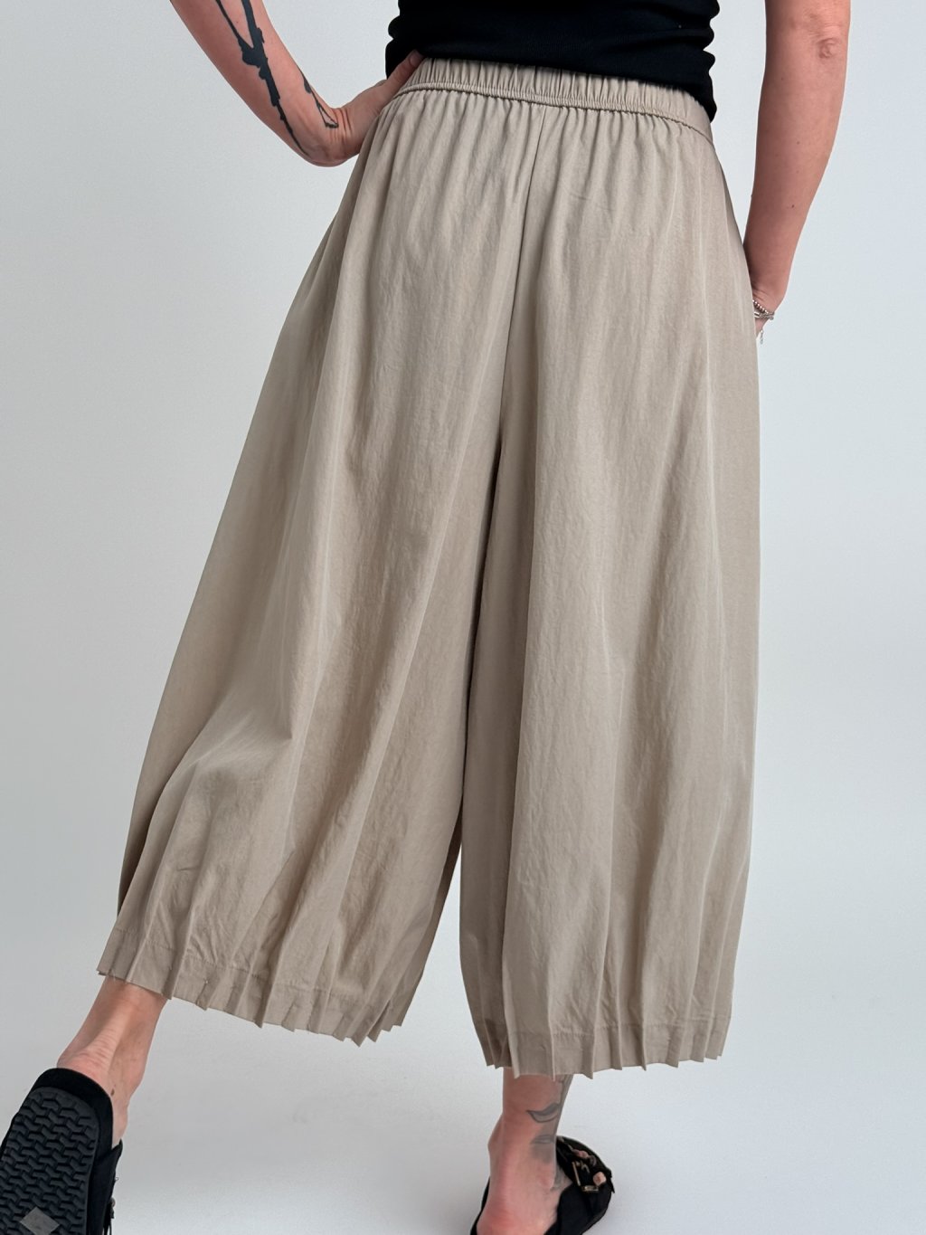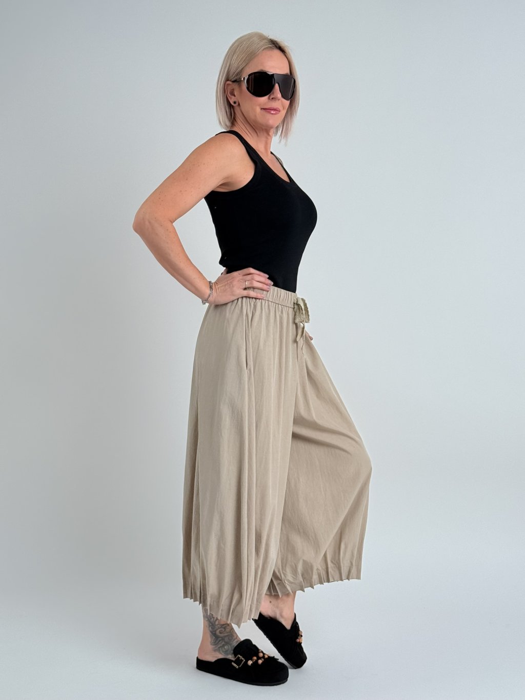 Nádherné, nadčasové, volné kalhoty, v pase do gumy a nohavice zakončené ozdobnými sámky.