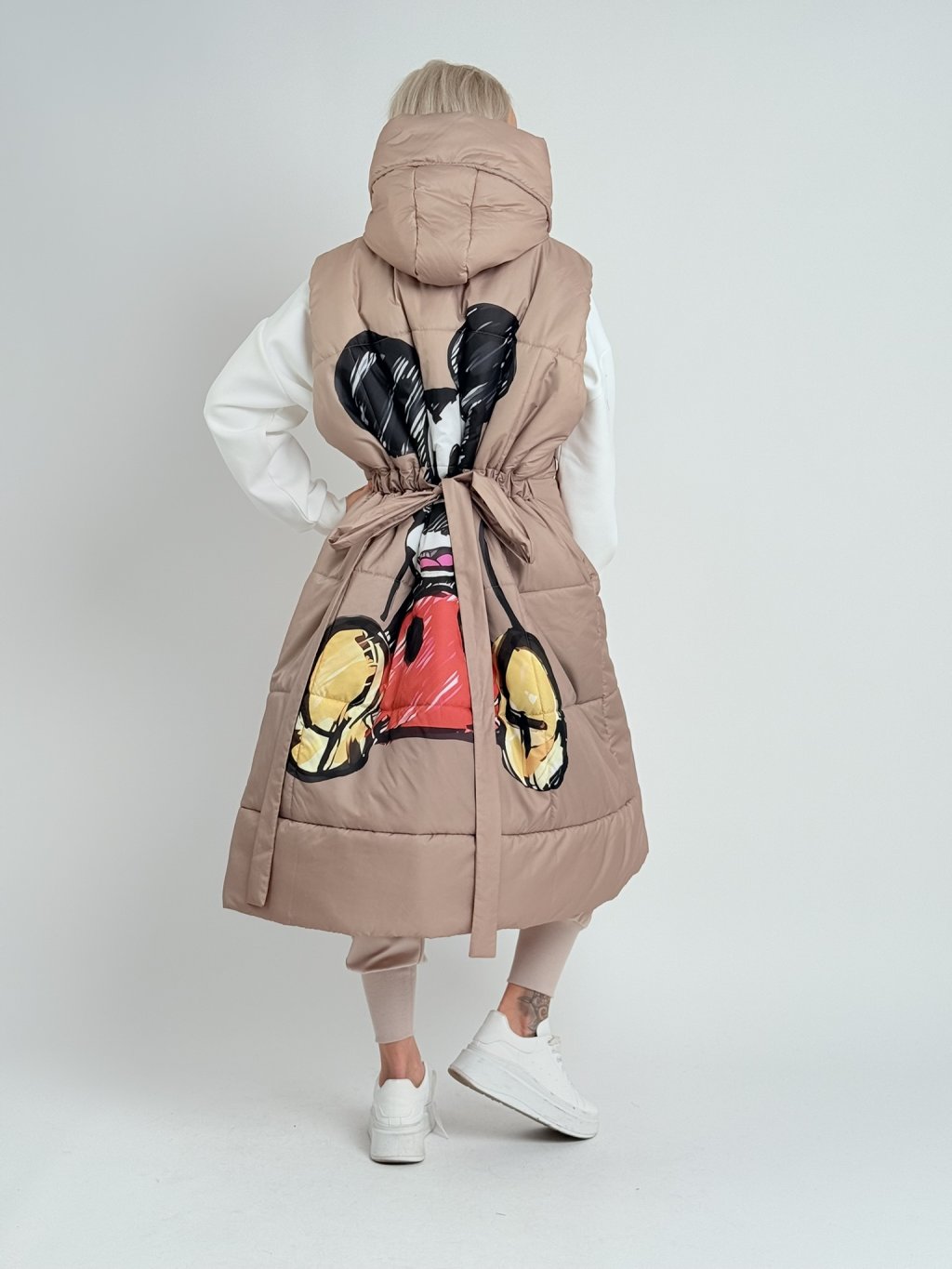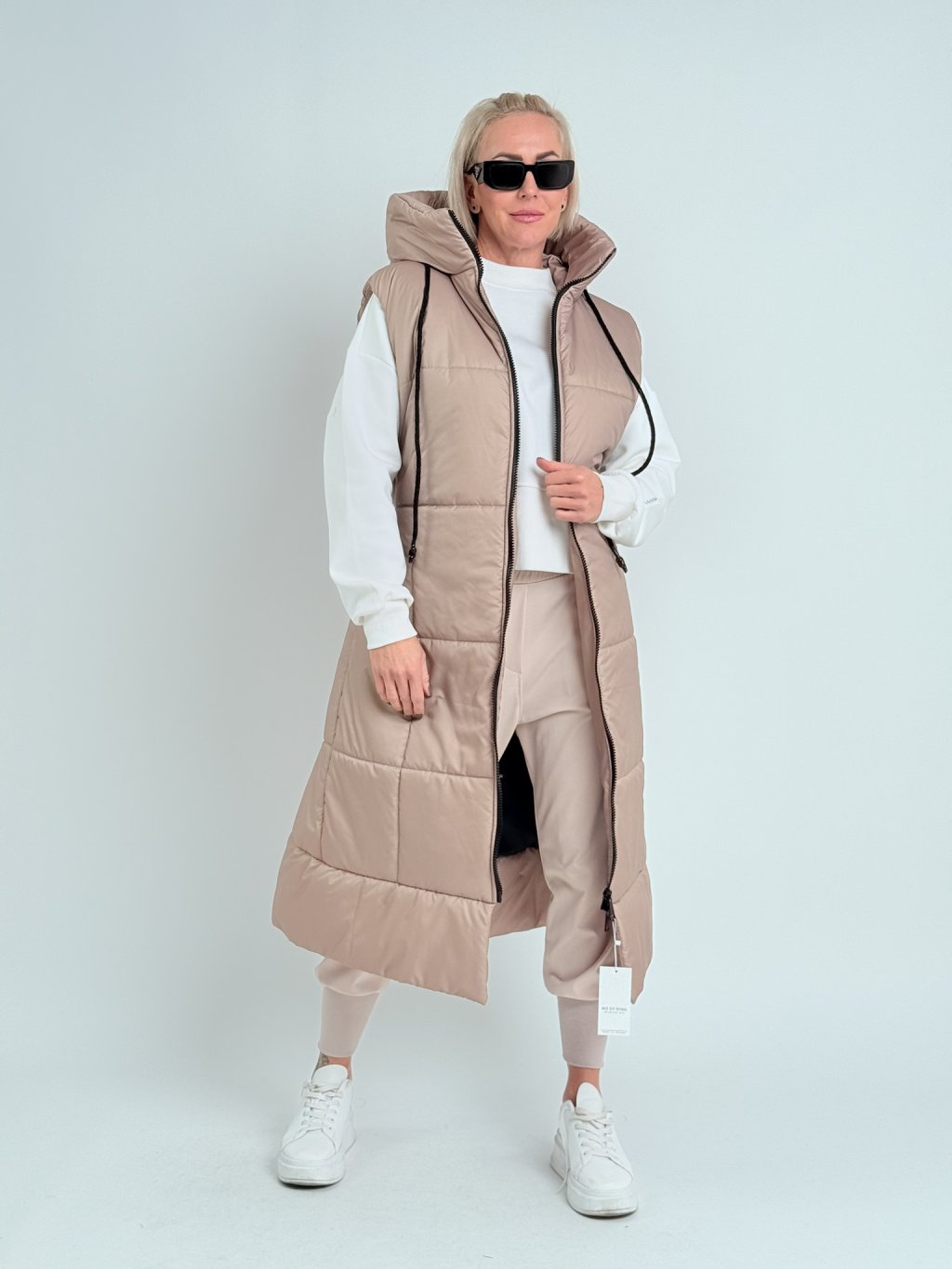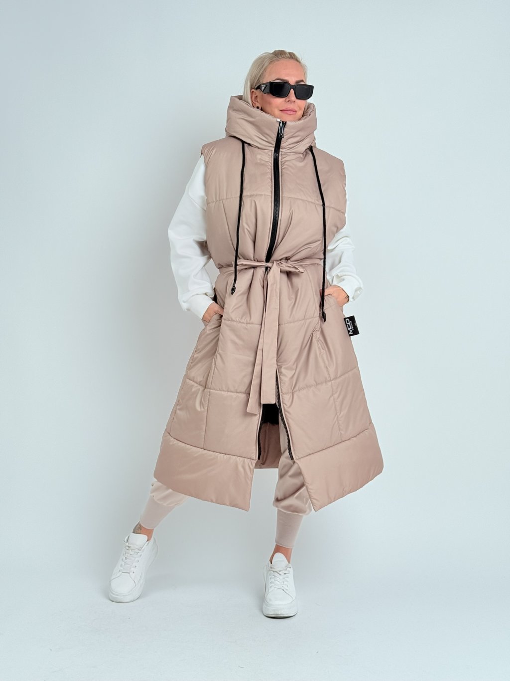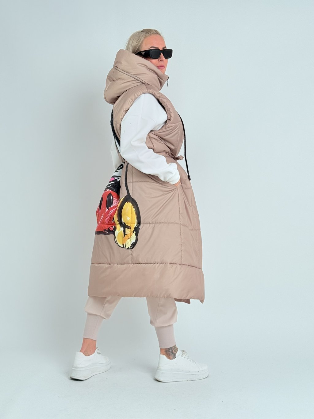 Skvělá, prošívaná, dlouhá, oversize vesta s kapucí, se zapínáním na oboustranný zip, s potiskem na zádech a možností, díky tkanici upravení šířky pasu.